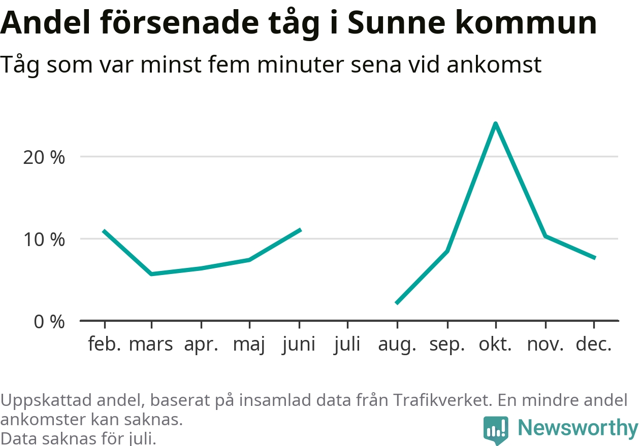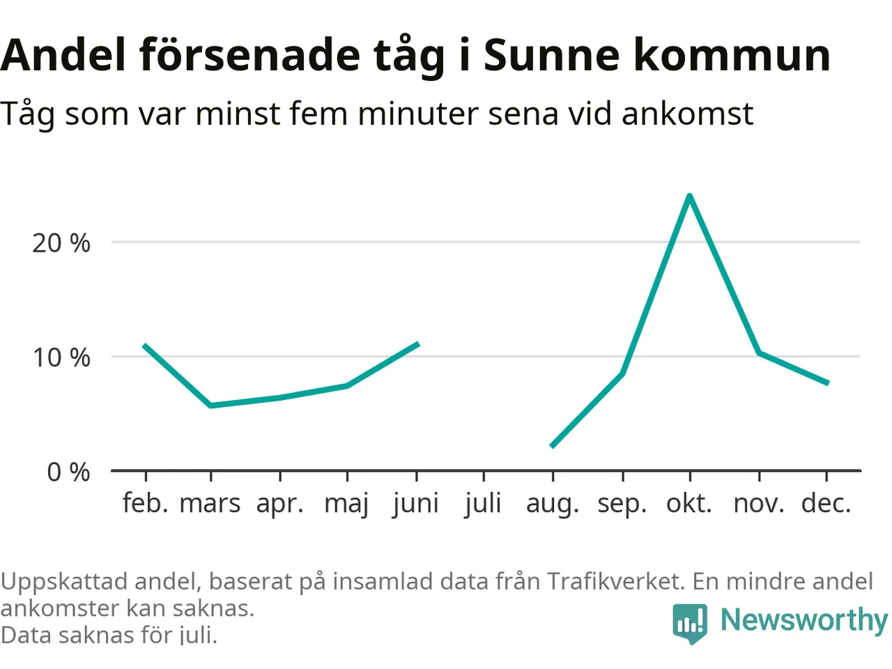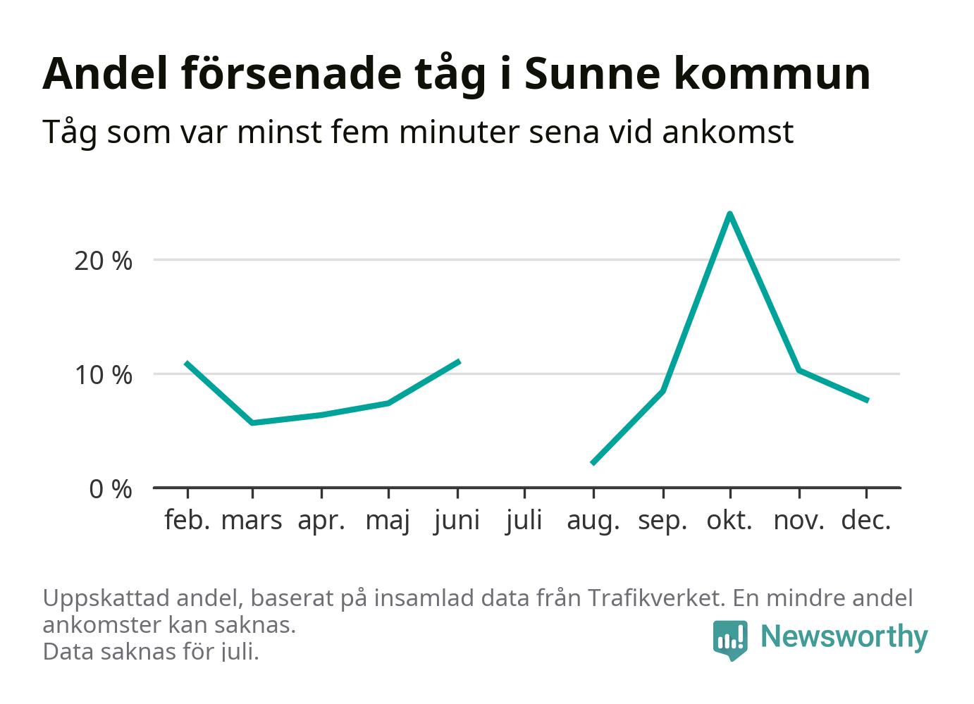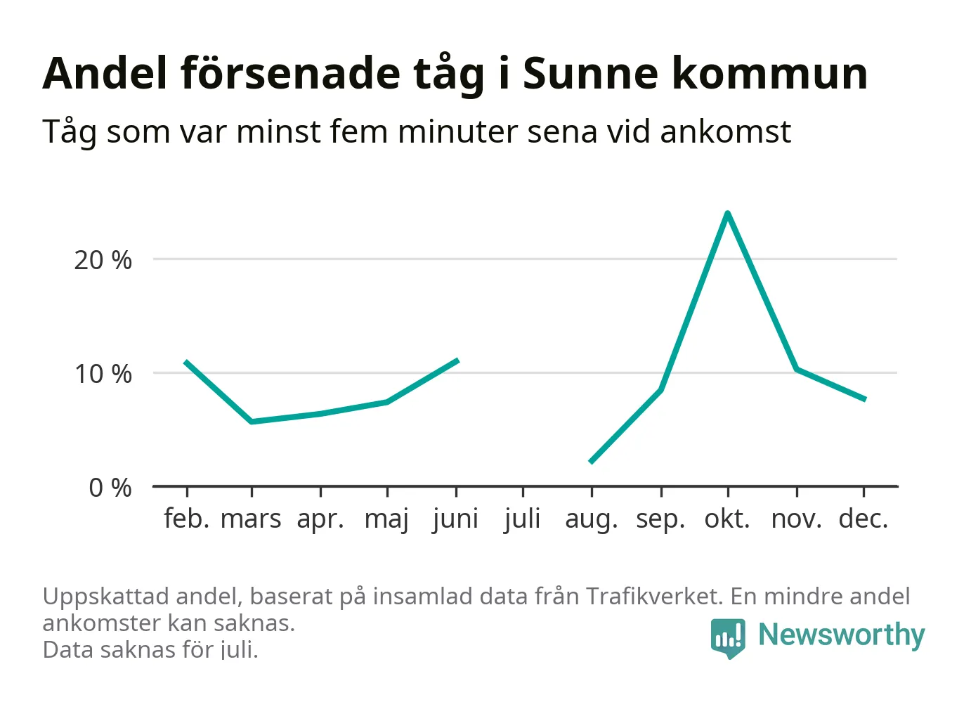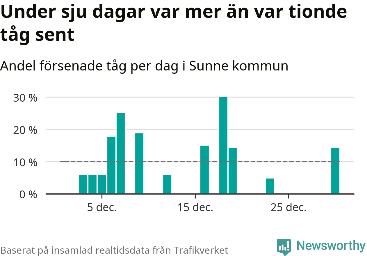 Den svenska tågtrafiken är långt från det branchgemensamma målet att 95 procent av tågen ska komma fram i tid. Newsworthy har samlat in tågens ankomsttider under december, för att se hur stor andel av tågen till Sunne kommun som var i tid under den senaste månaden.
