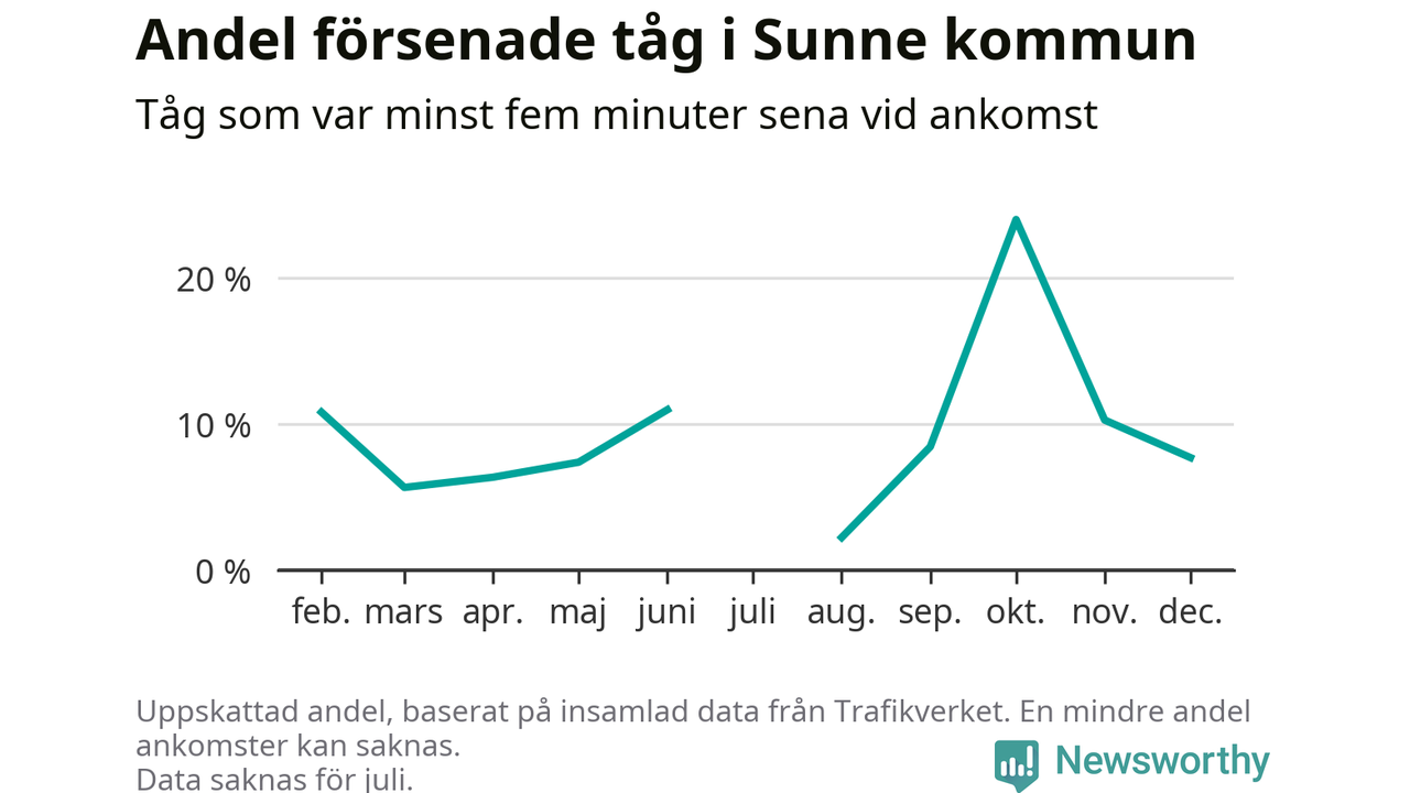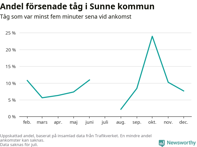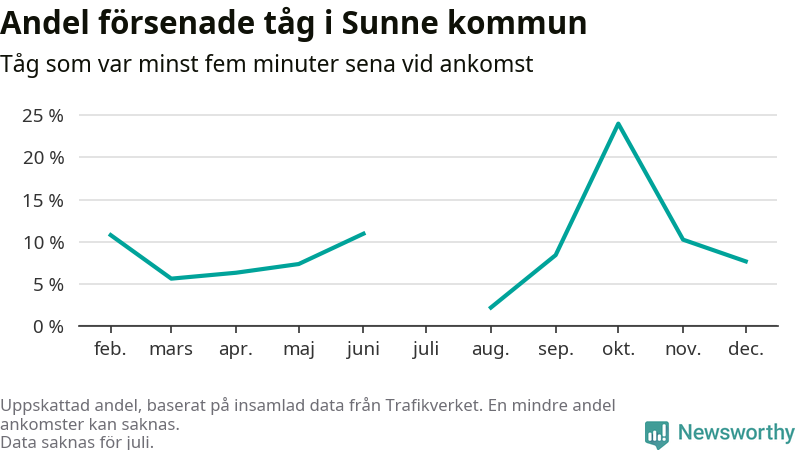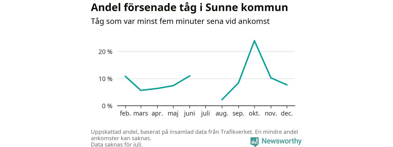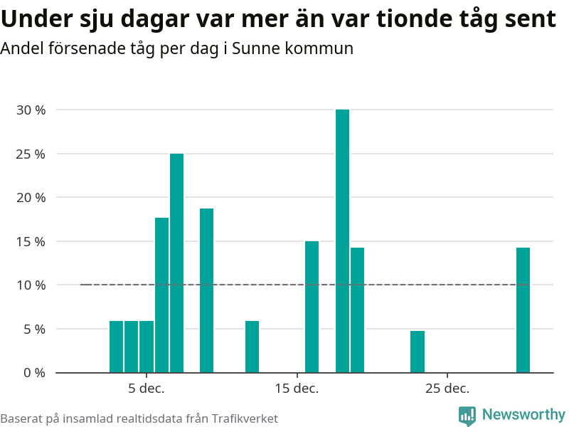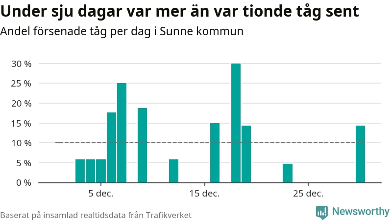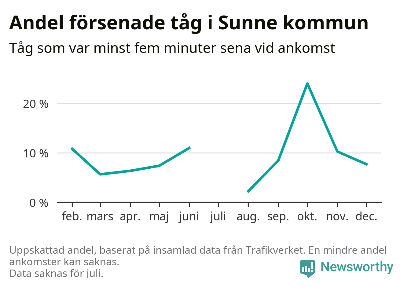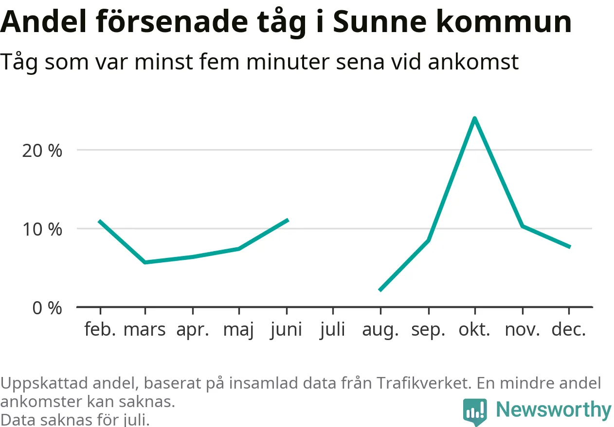 Den svenska tågtrafiken är långt från det branchgemensamma målet att 95 procent av tågen ska komma fram i tid. Newsworthy har samlat in tågens ankomsttider under december, för att se hur stor andel av tågen till Sunne kommun som var i tid under den senaste månaden.