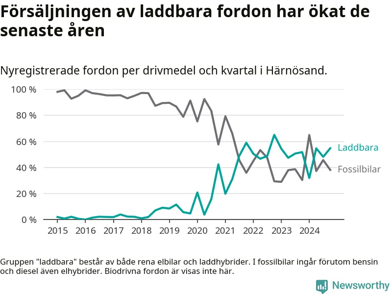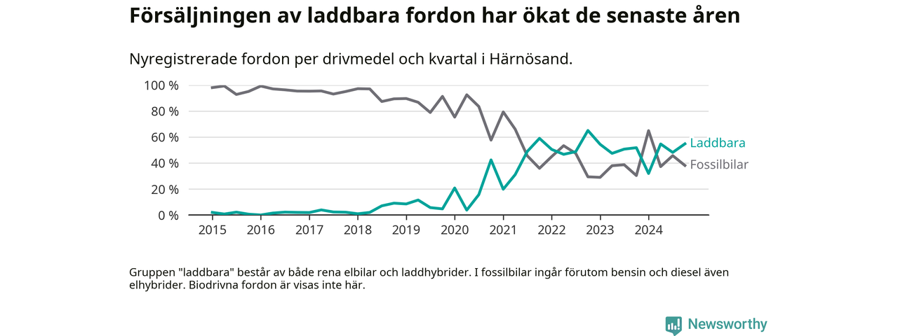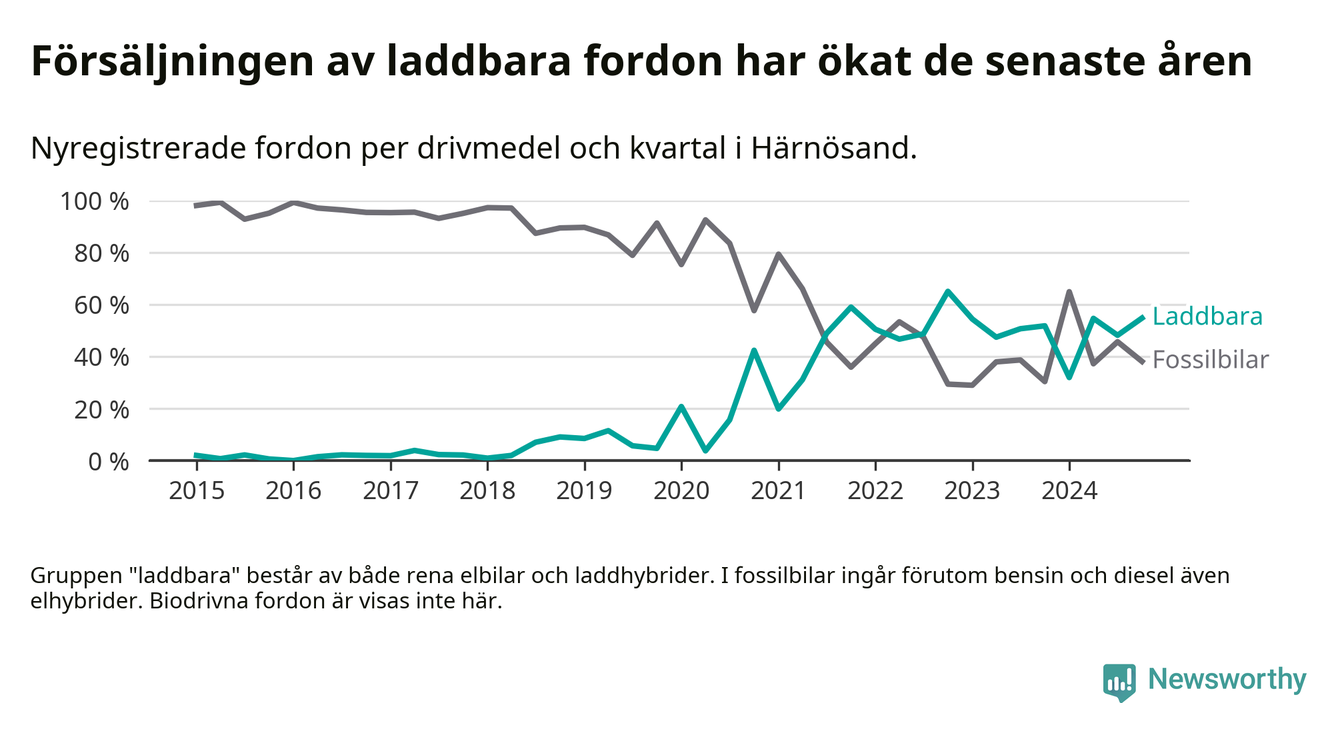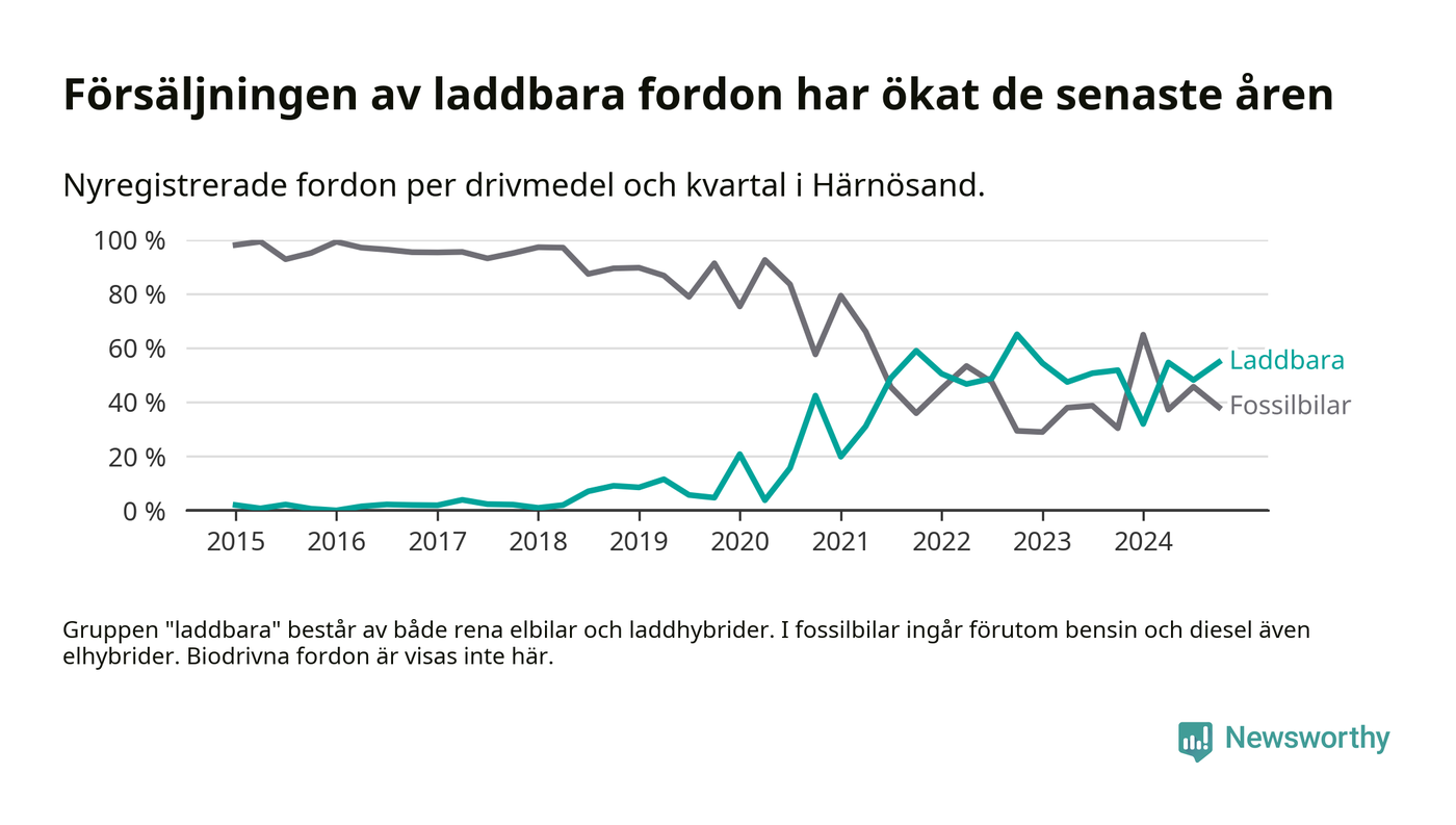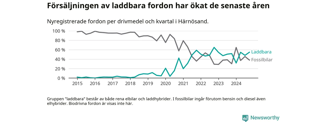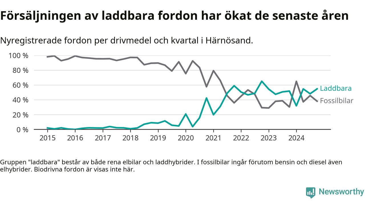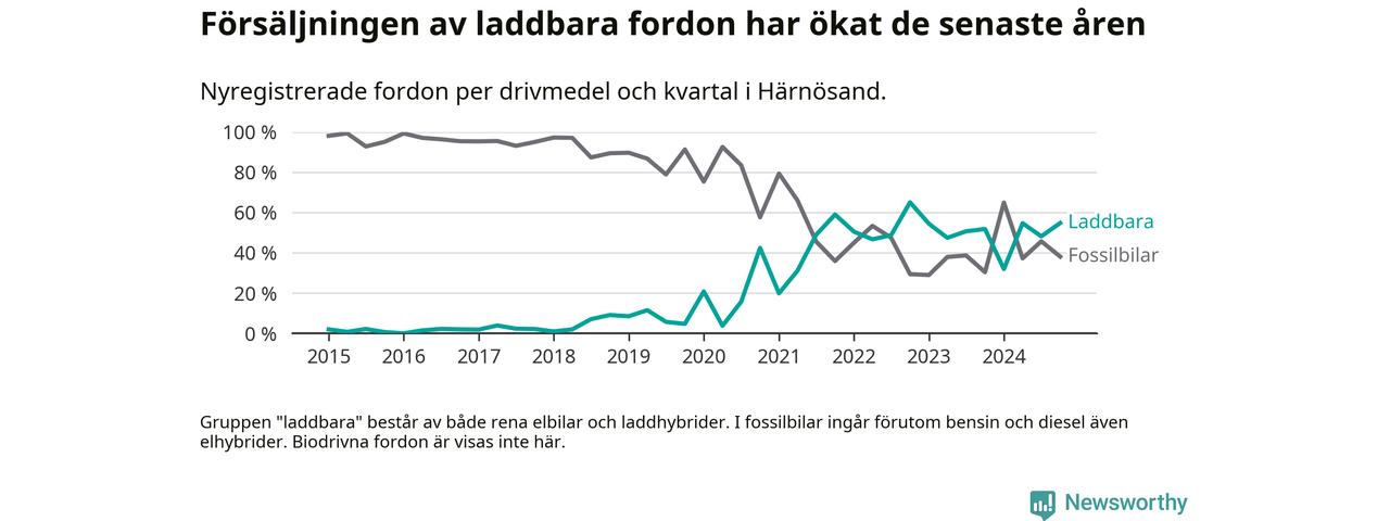 Under fjärde kvartalet 2024 var 55 procent av alla nyregistrerade personbilar i Härnösand laddbara (sammanlagt registrerades 84 nya bilar). Merparten av de laddbara bilarna var rena elbilar (31 procent av alla).