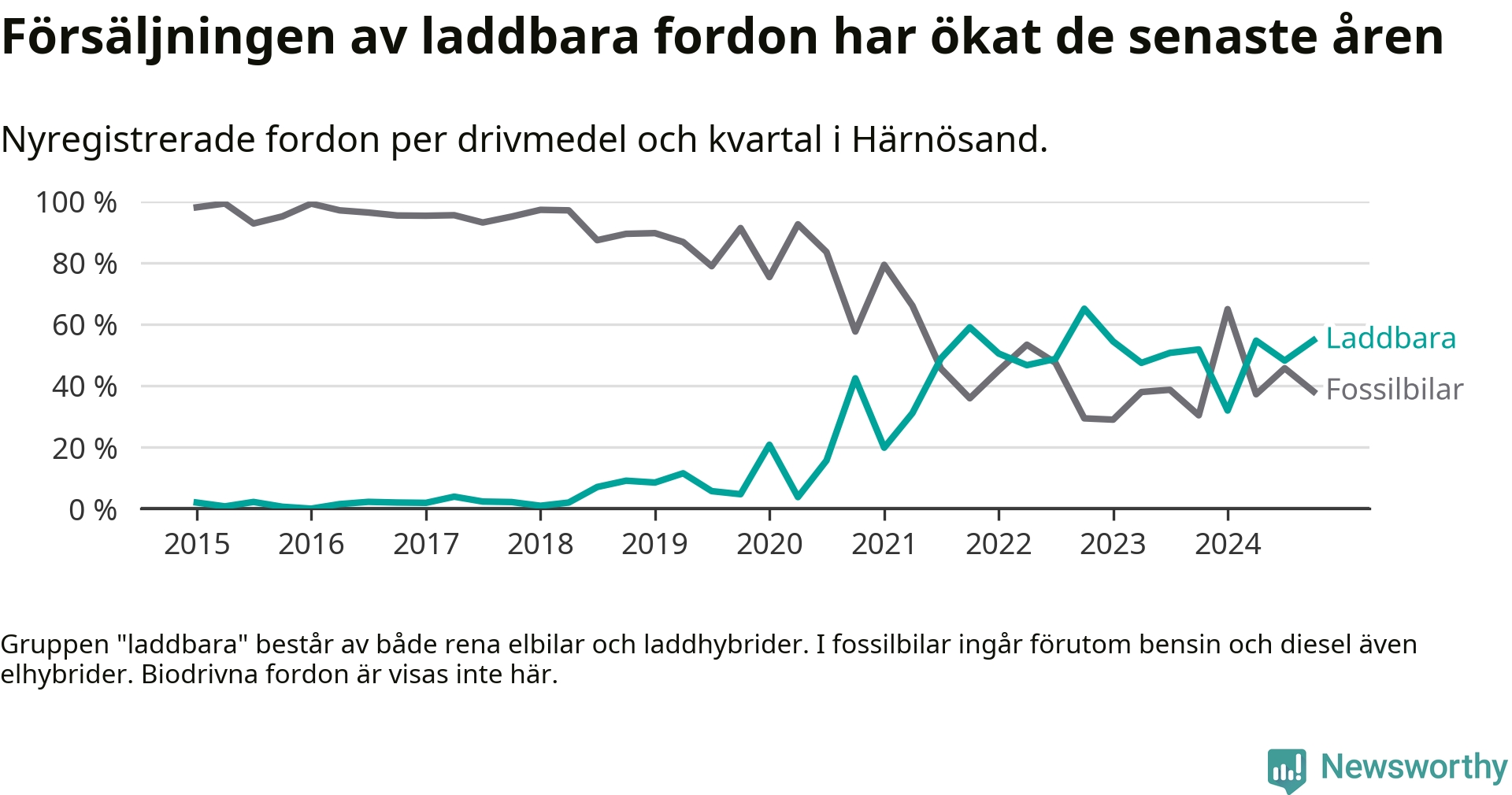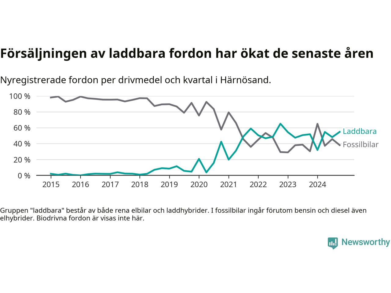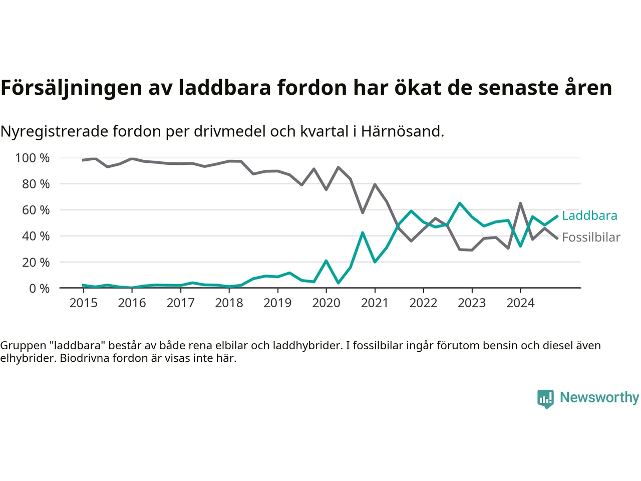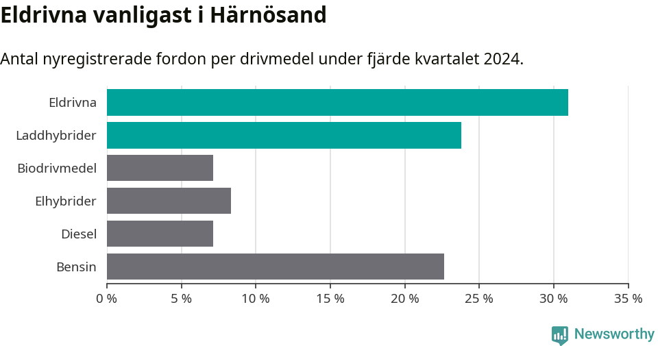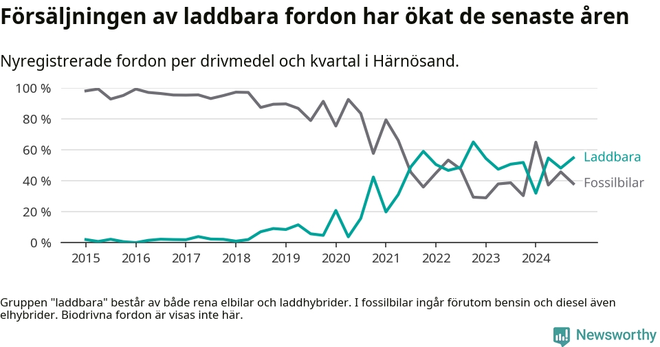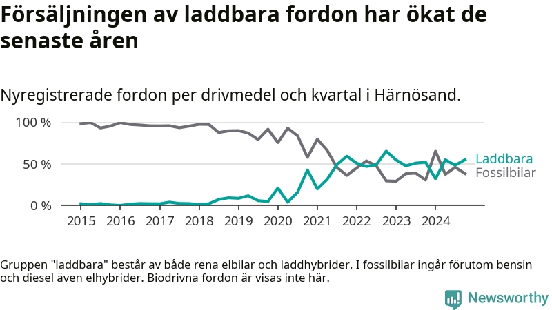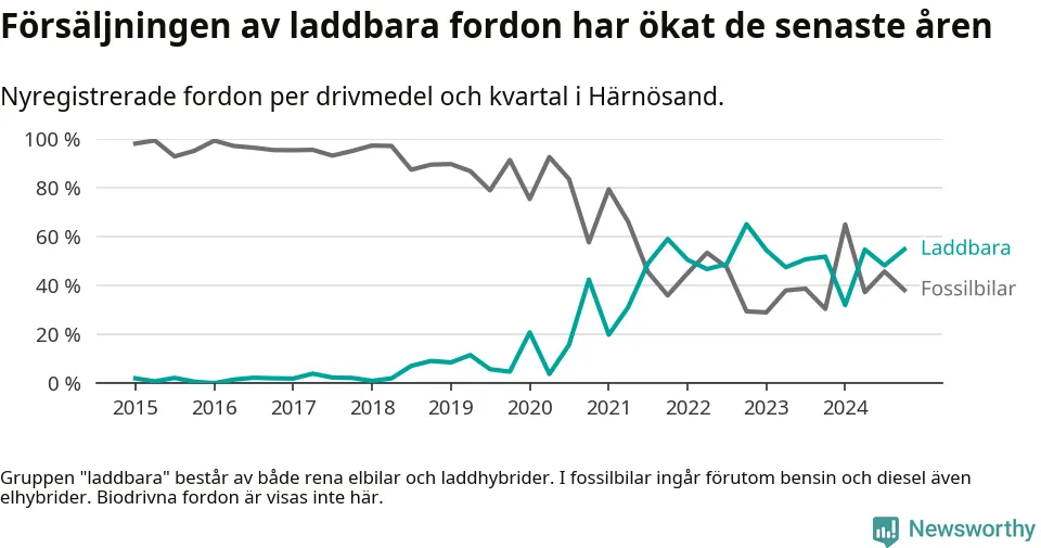 Under fjärde kvartalet 2024 var 55 procent av alla nyregistrerade personbilar i Härnösand laddbara (sammanlagt registrerades 84 nya bilar). Merparten av de laddbara bilarna var rena elbilar (31 procent av alla).