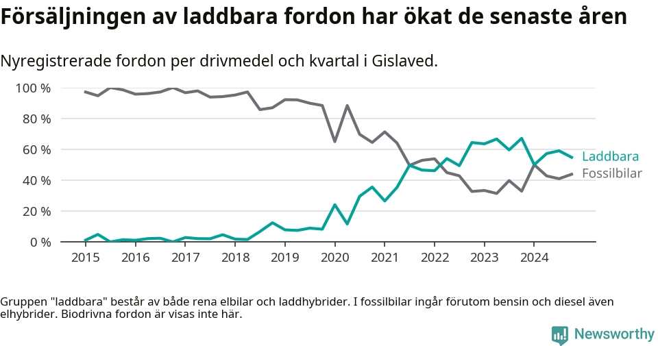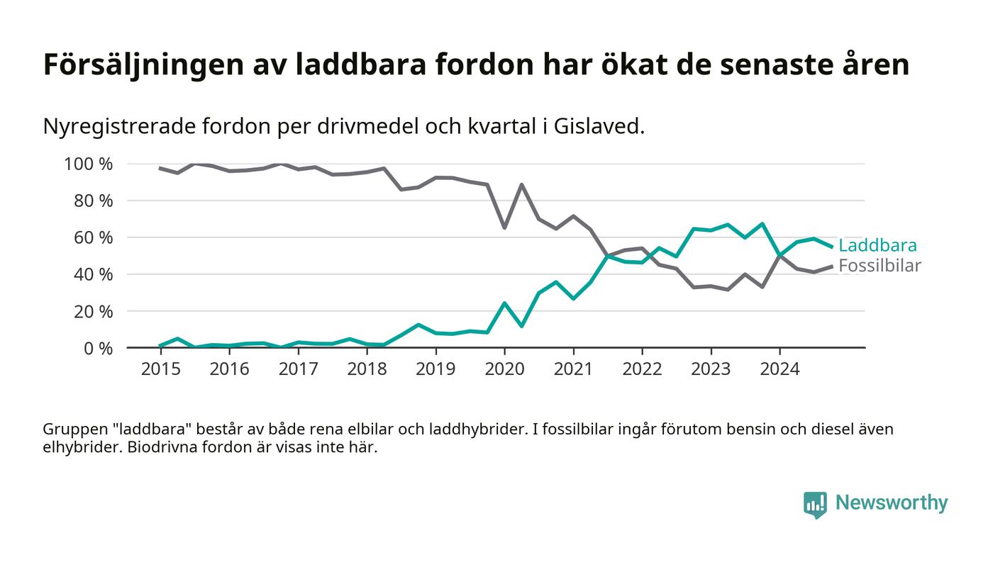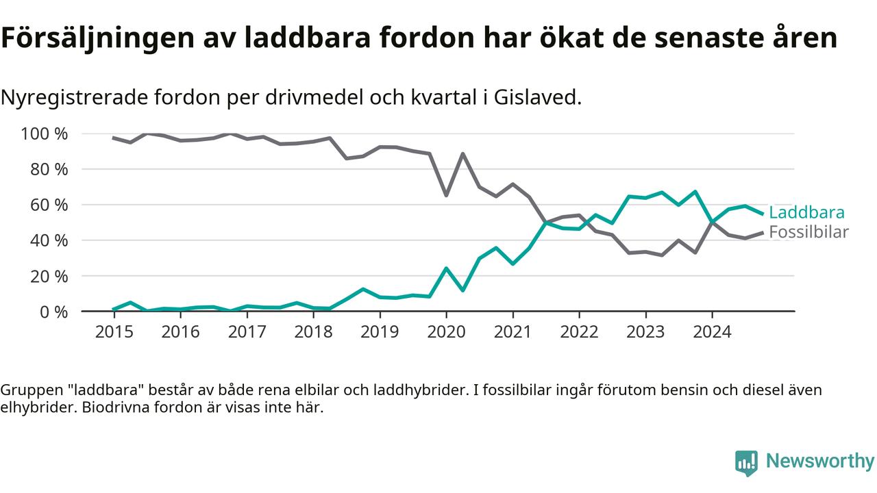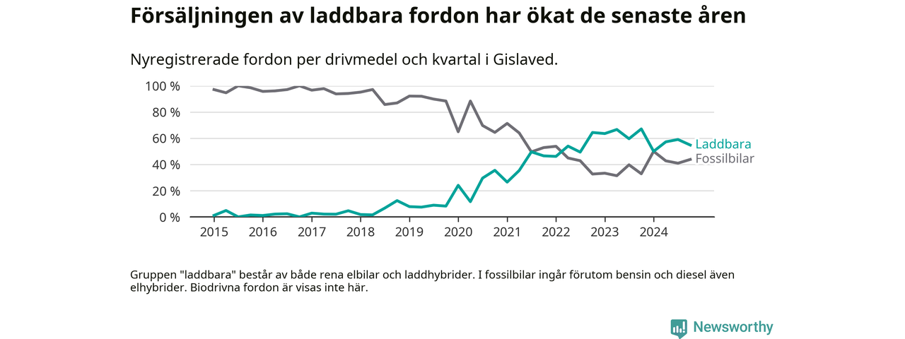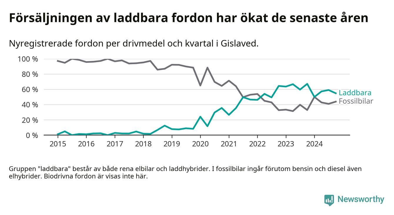 Under fjärde kvartalet 2024 var 55 procent av alla nyregistrerade personbilar i Gislaved laddbara (sammanlagt registrerades 146 nya bilar). Merparten av de laddbara bilarna var rena elbilar (34 procent av alla).