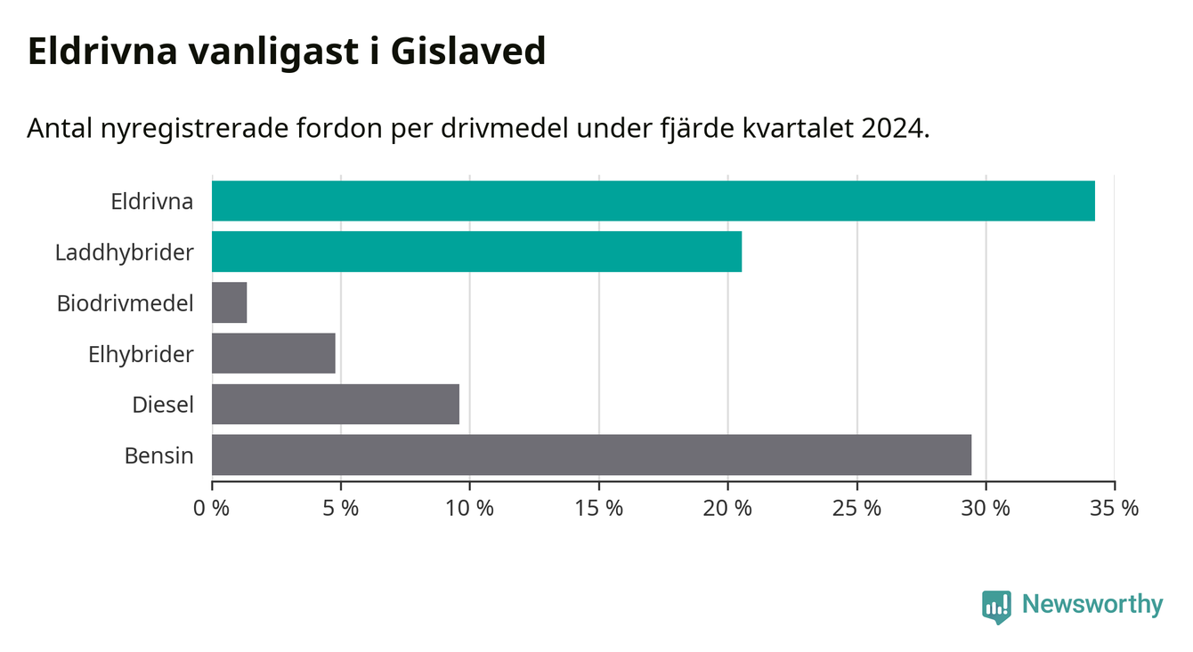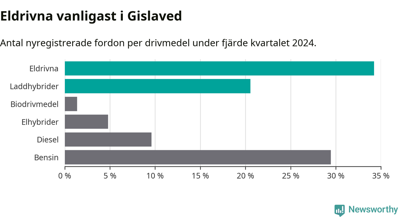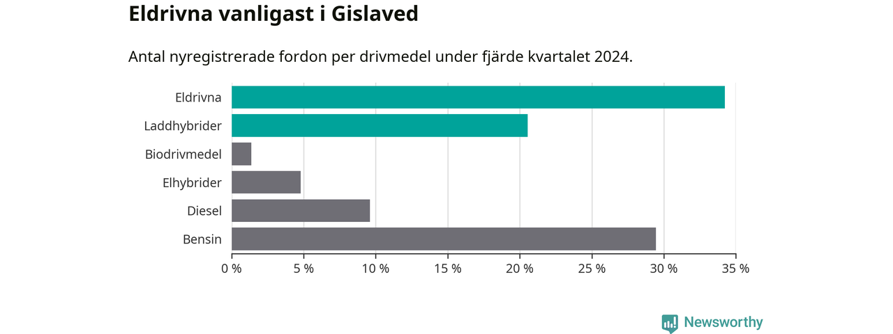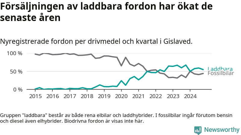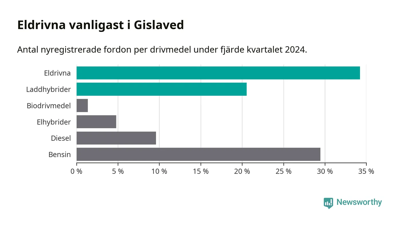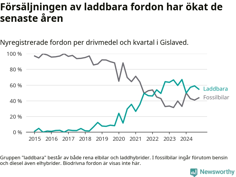 Under fjärde kvartalet 2024 var 55 procent av alla nyregistrerade personbilar i Gislaved laddbara (sammanlagt registrerades 146 nya bilar). Merparten av de laddbara bilarna var rena elbilar (34 procent av alla).