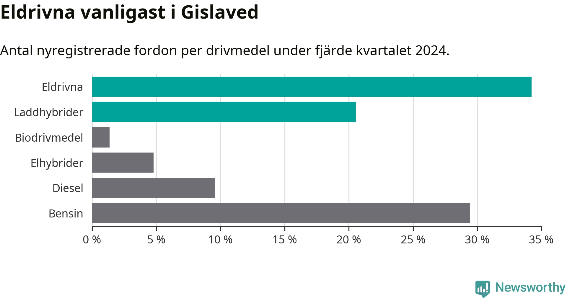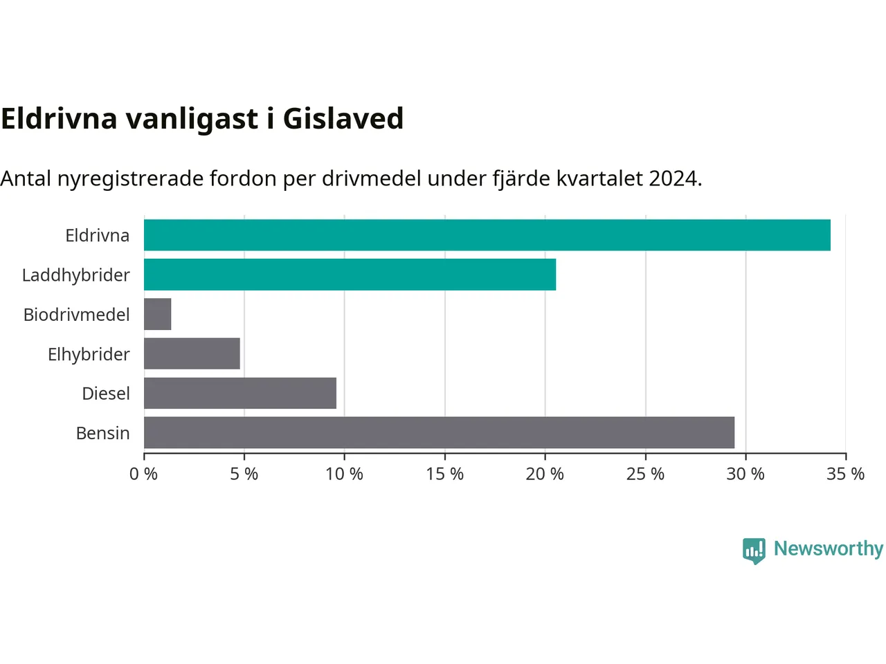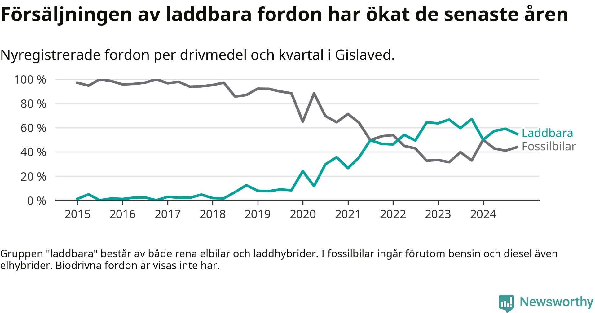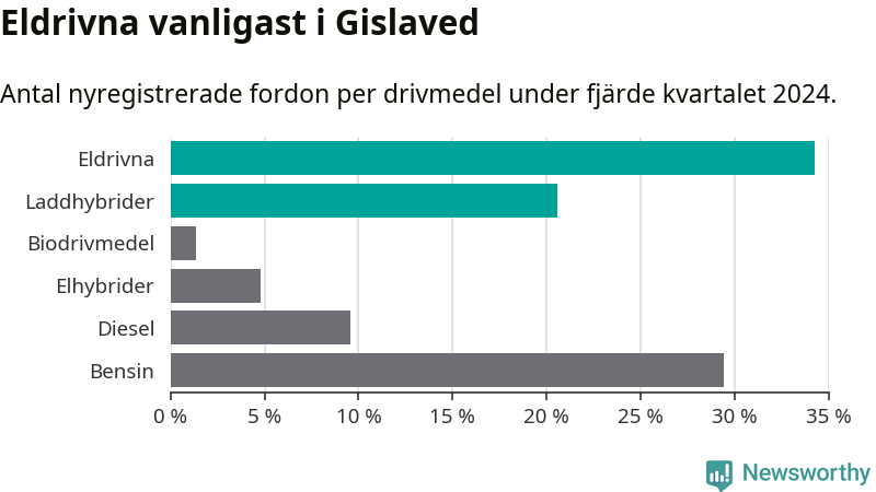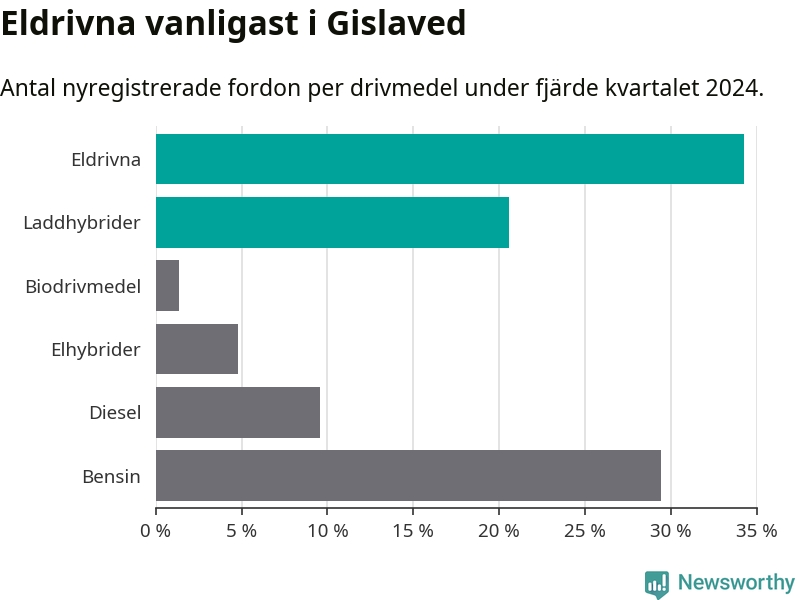Under fjärde kvartalet 2024 var 55 procent av alla nyregistrerade personbilar i Gislaved laddbara (sammanlagt registrerades 146 nya bilar). Merparten av de laddbara bilarna var rena elbilar (34 procent av alla).