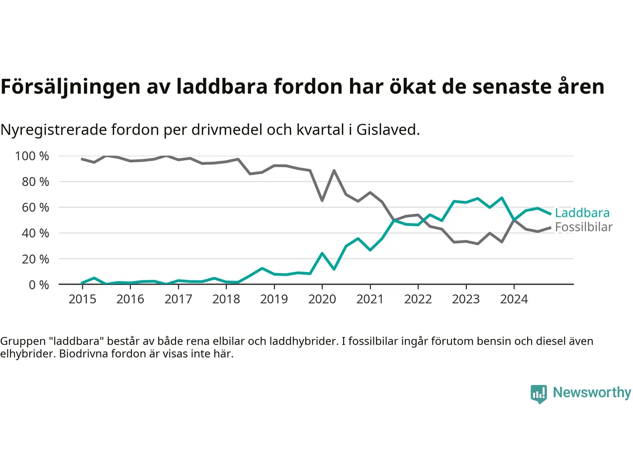 I Gislaved minskade andelen laddbara bilar under fjärde kvartalet jämfört med kvartalet innan. Nyregistreringen peakade under fjärde kvartalet 2023 då 67 procent av de nya bilarna var laddbara.