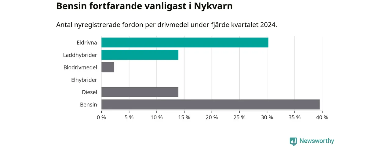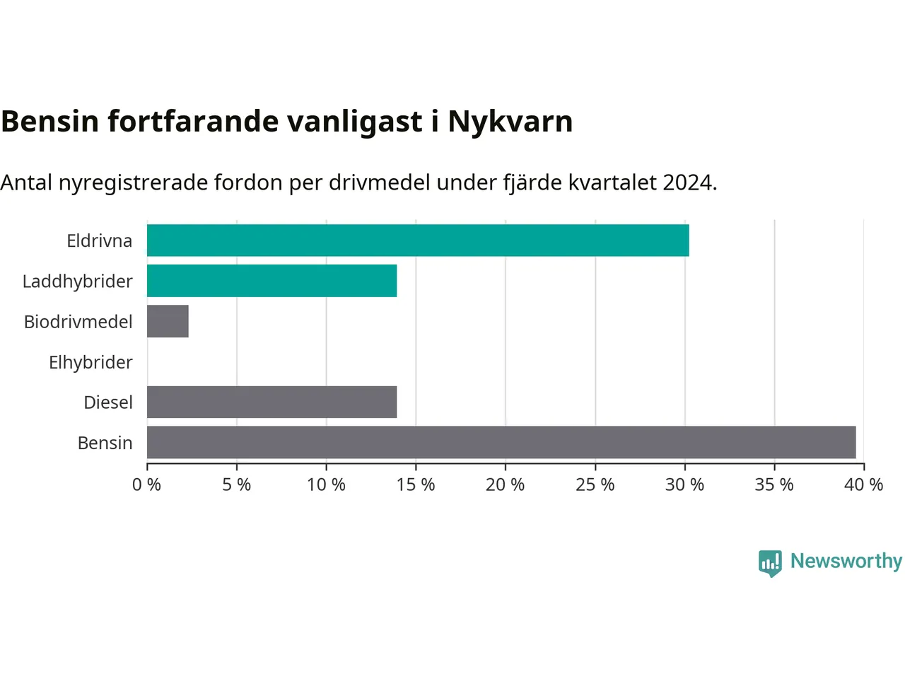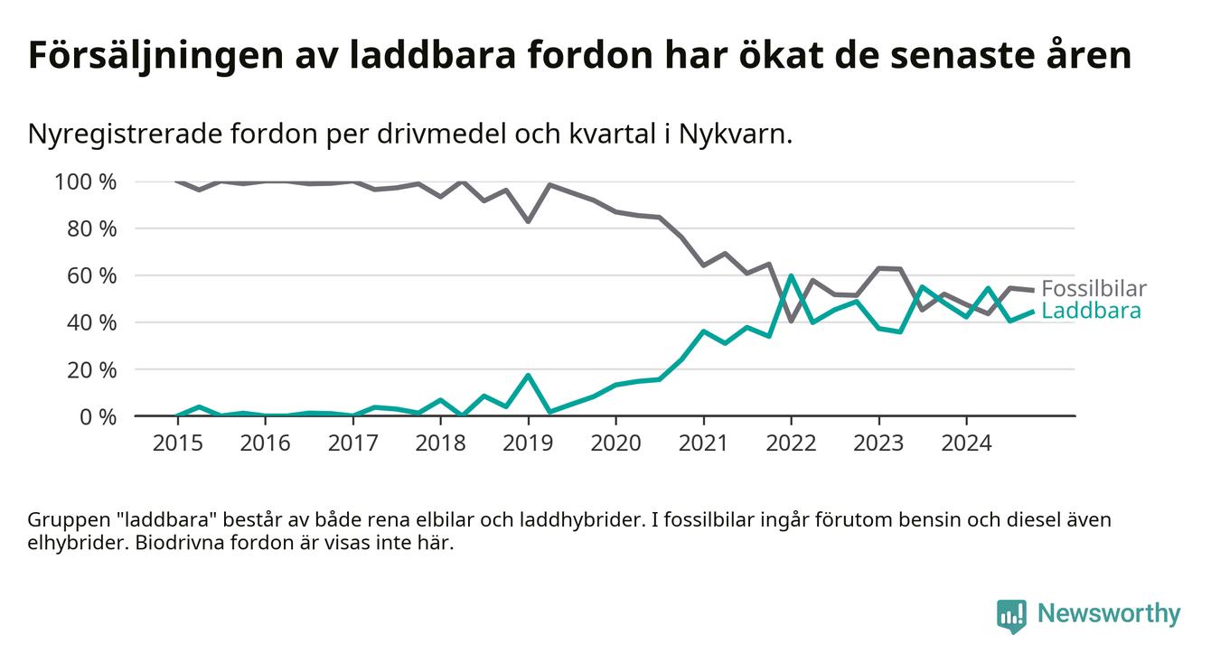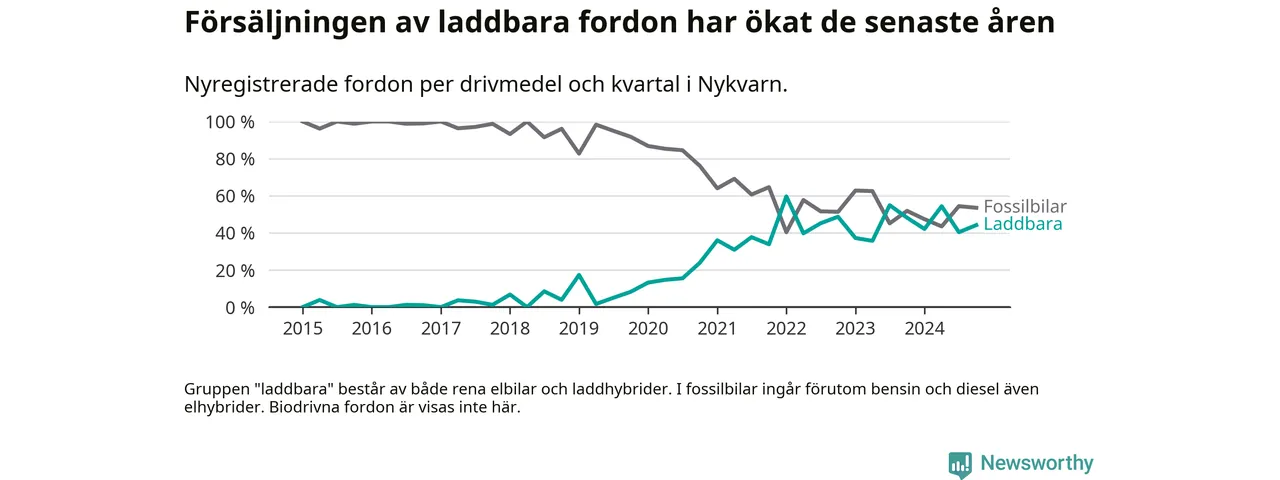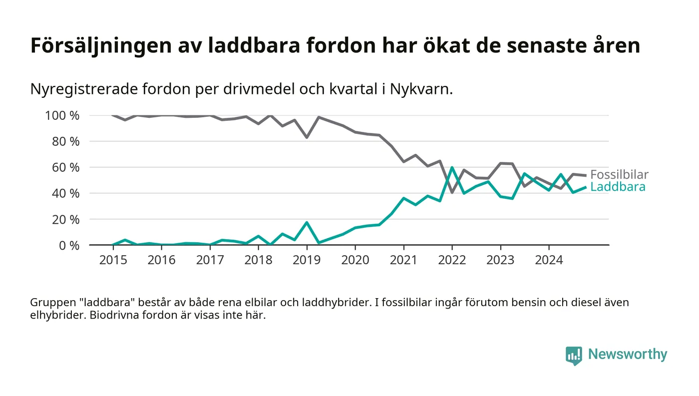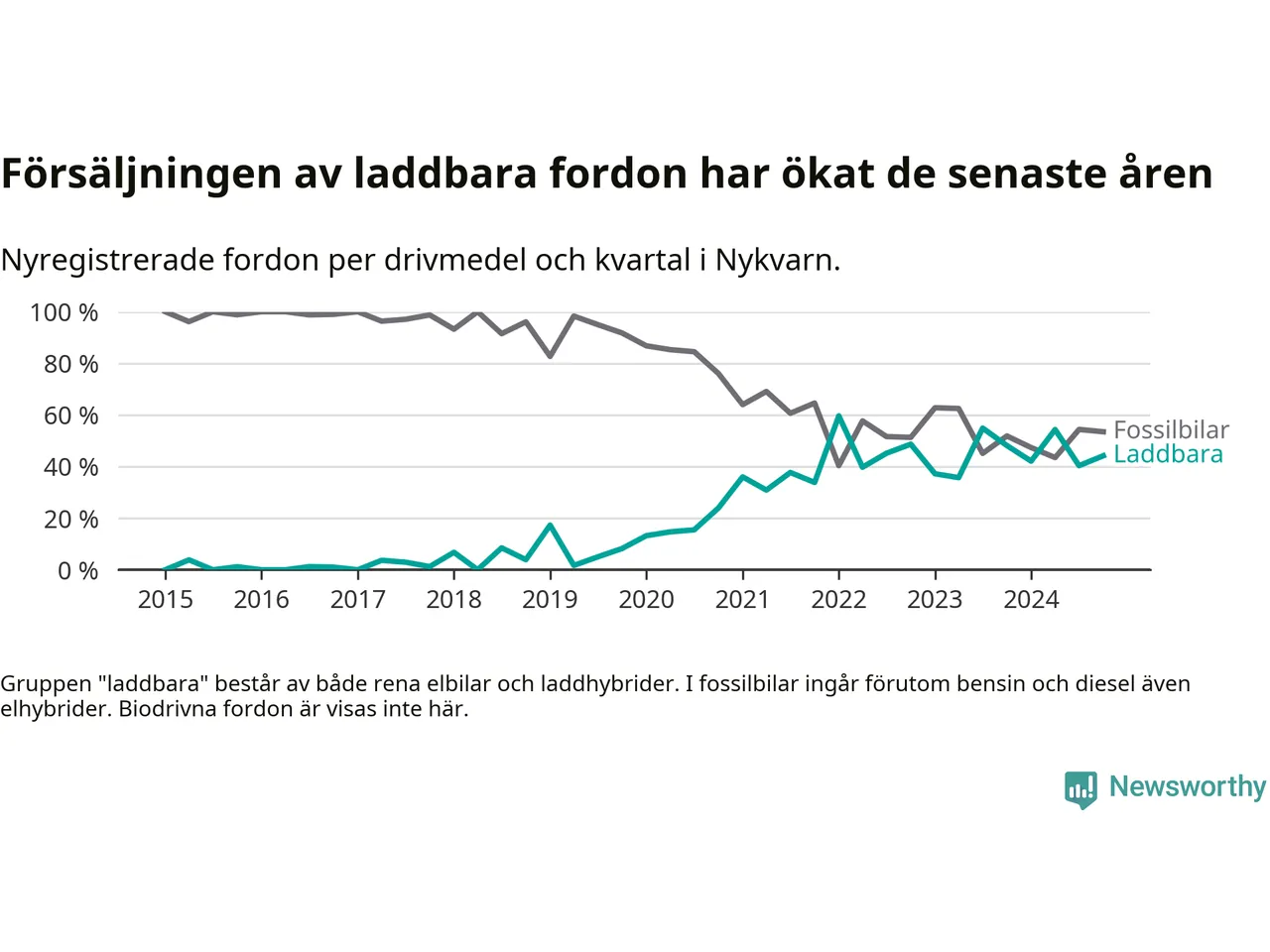 Under fjärde kvartalet 2024 var 44 procent av alla nyregistrerade personbilar i Nykvarn laddbara (sammanlagt registrerades 43 nya bilar). Merparten av de laddbara bilarna var rena elbilar (30 procent av alla).