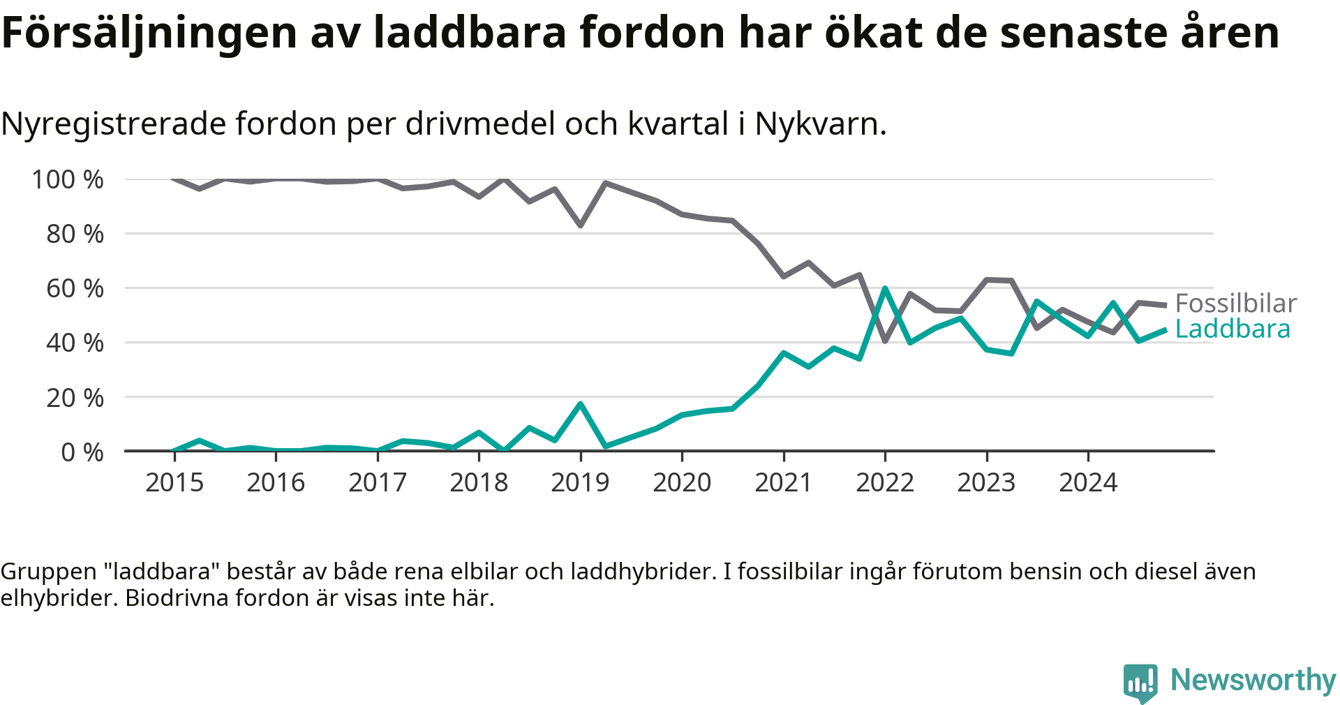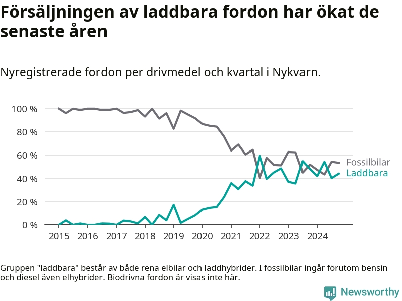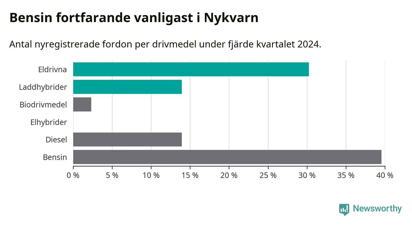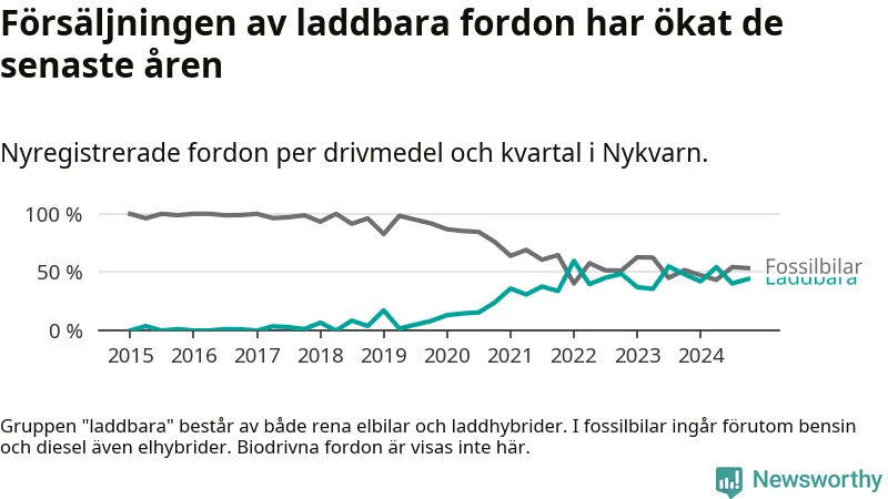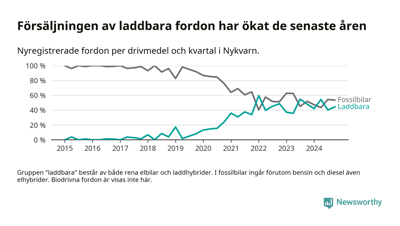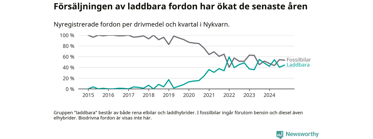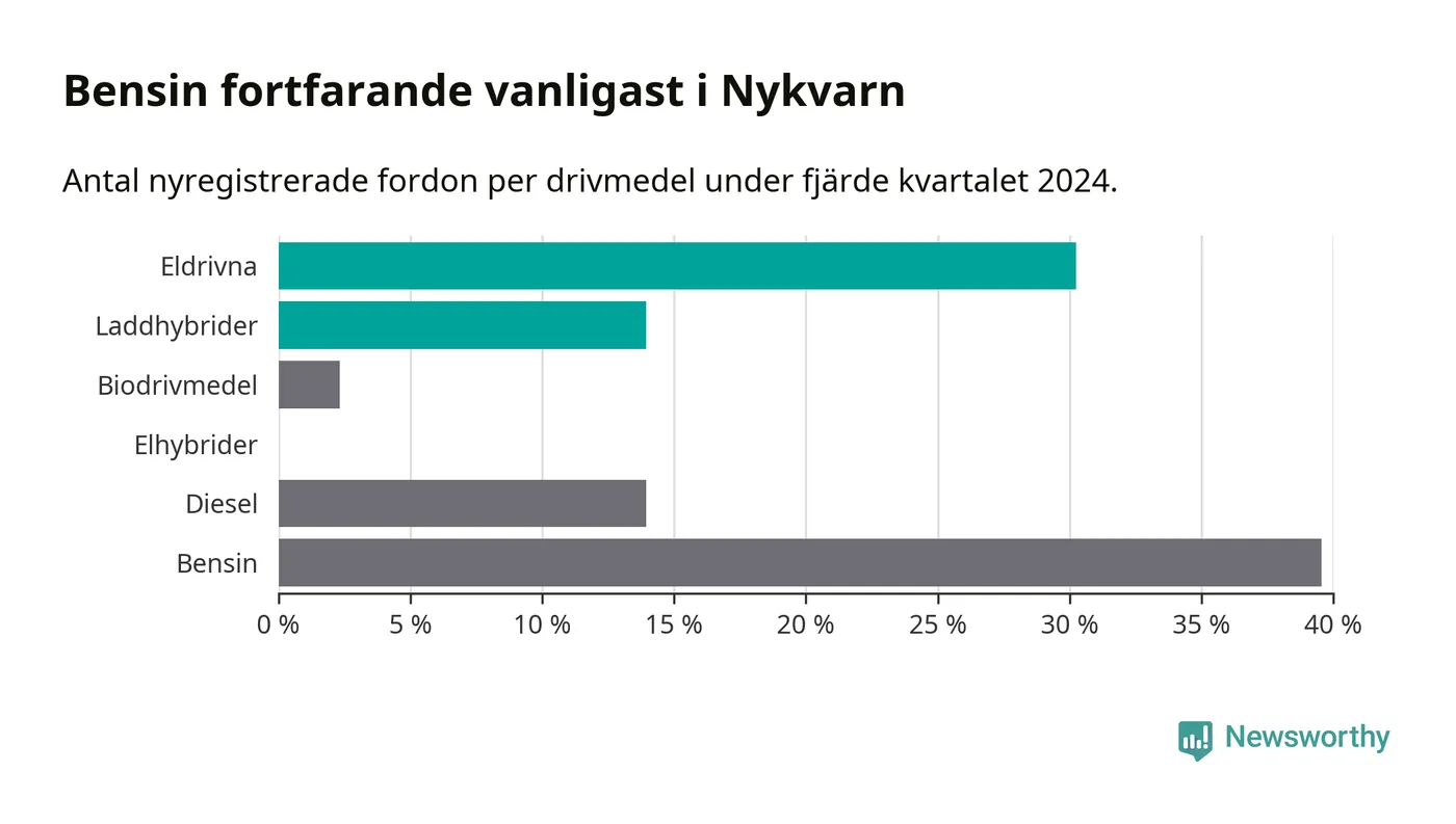 Under fjärde kvartalet 2024 var 44 procent av alla nyregistrerade personbilar i Nykvarn laddbara (sammanlagt registrerades 43 nya bilar). Merparten av de laddbara bilarna var rena elbilar (30 procent av alla).