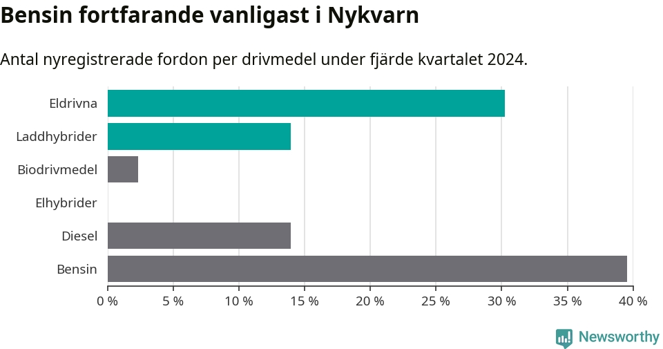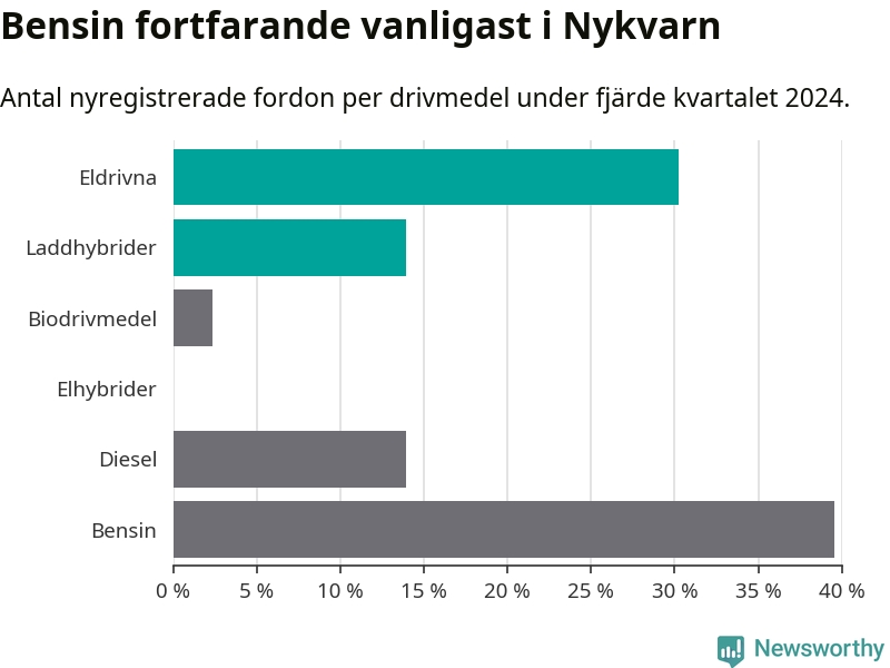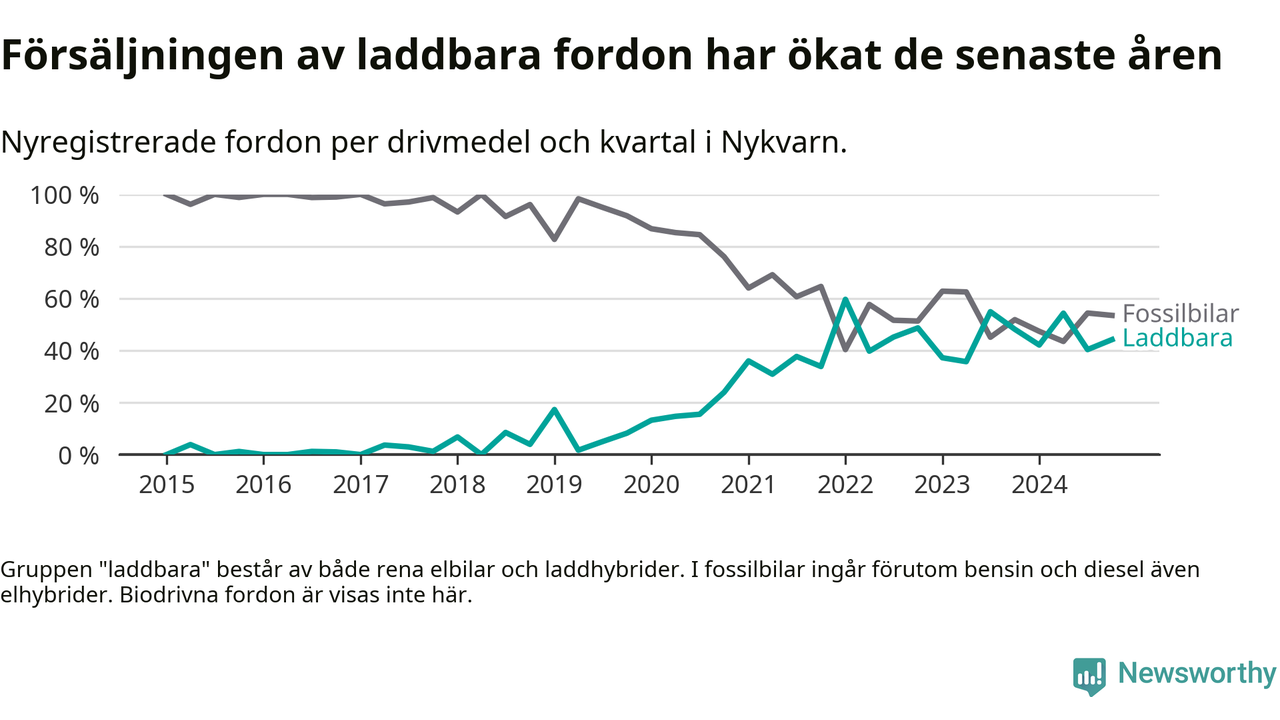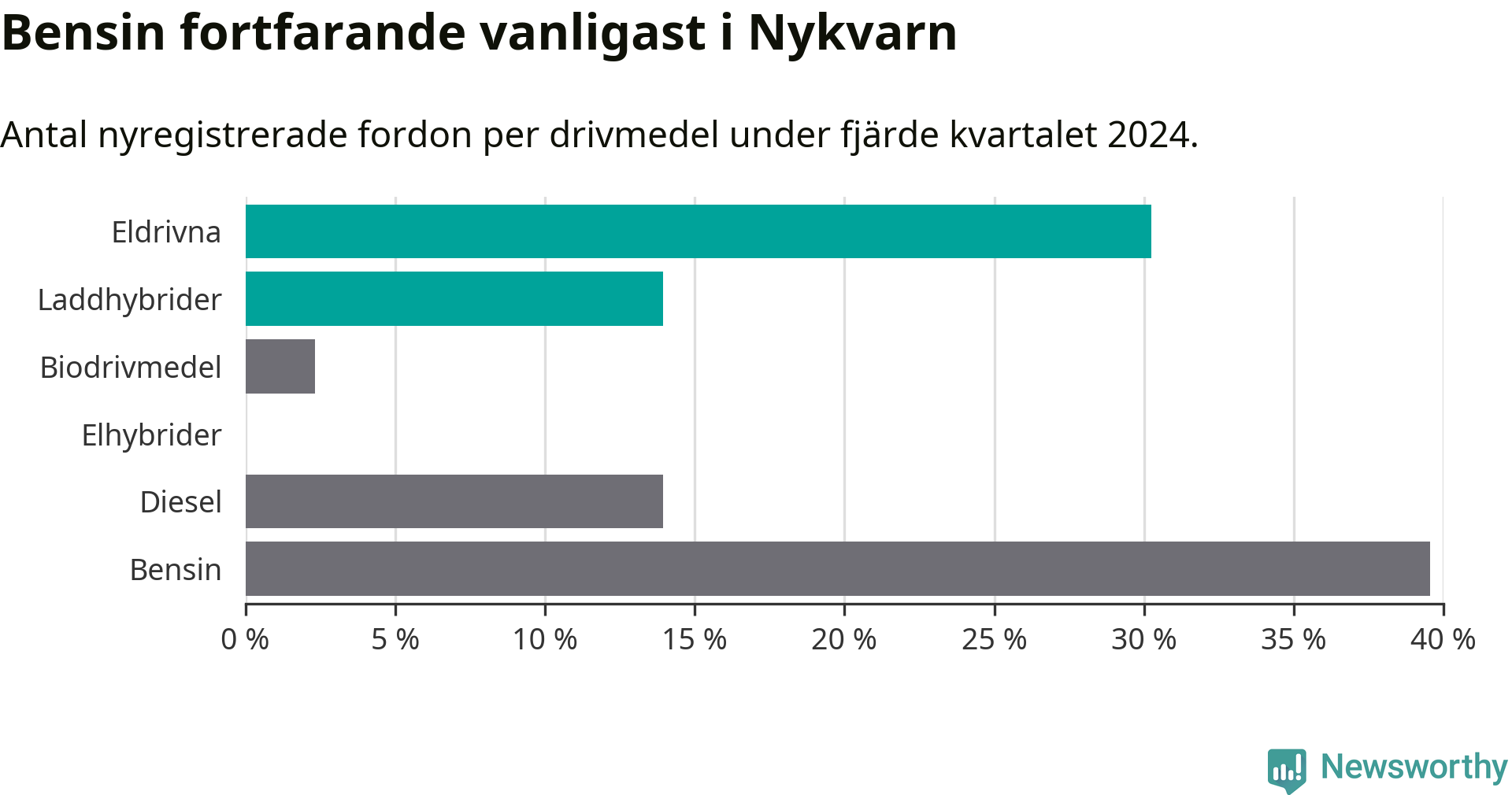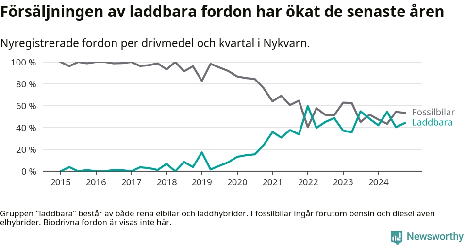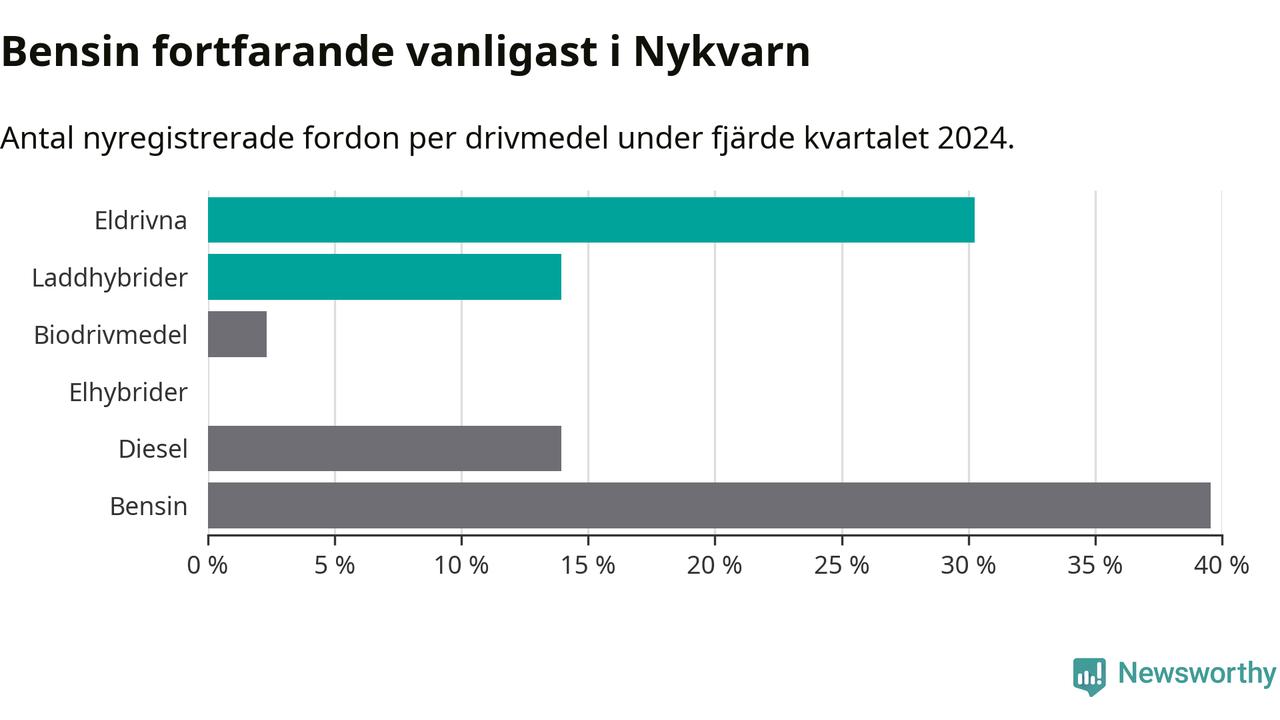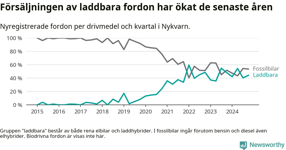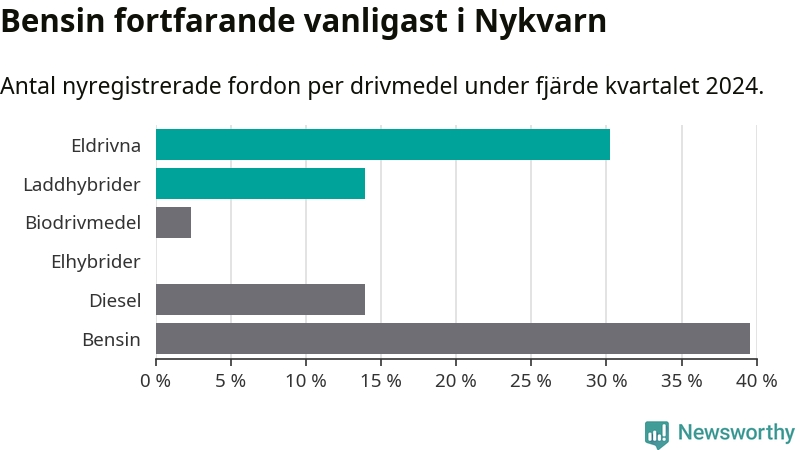 Under fjärde kvartalet 2024 var 44 procent av alla nyregistrerade personbilar i Nykvarn laddbara (sammanlagt registrerades 43 nya bilar). Merparten av de laddbara bilarna var rena elbilar (30 procent av alla).