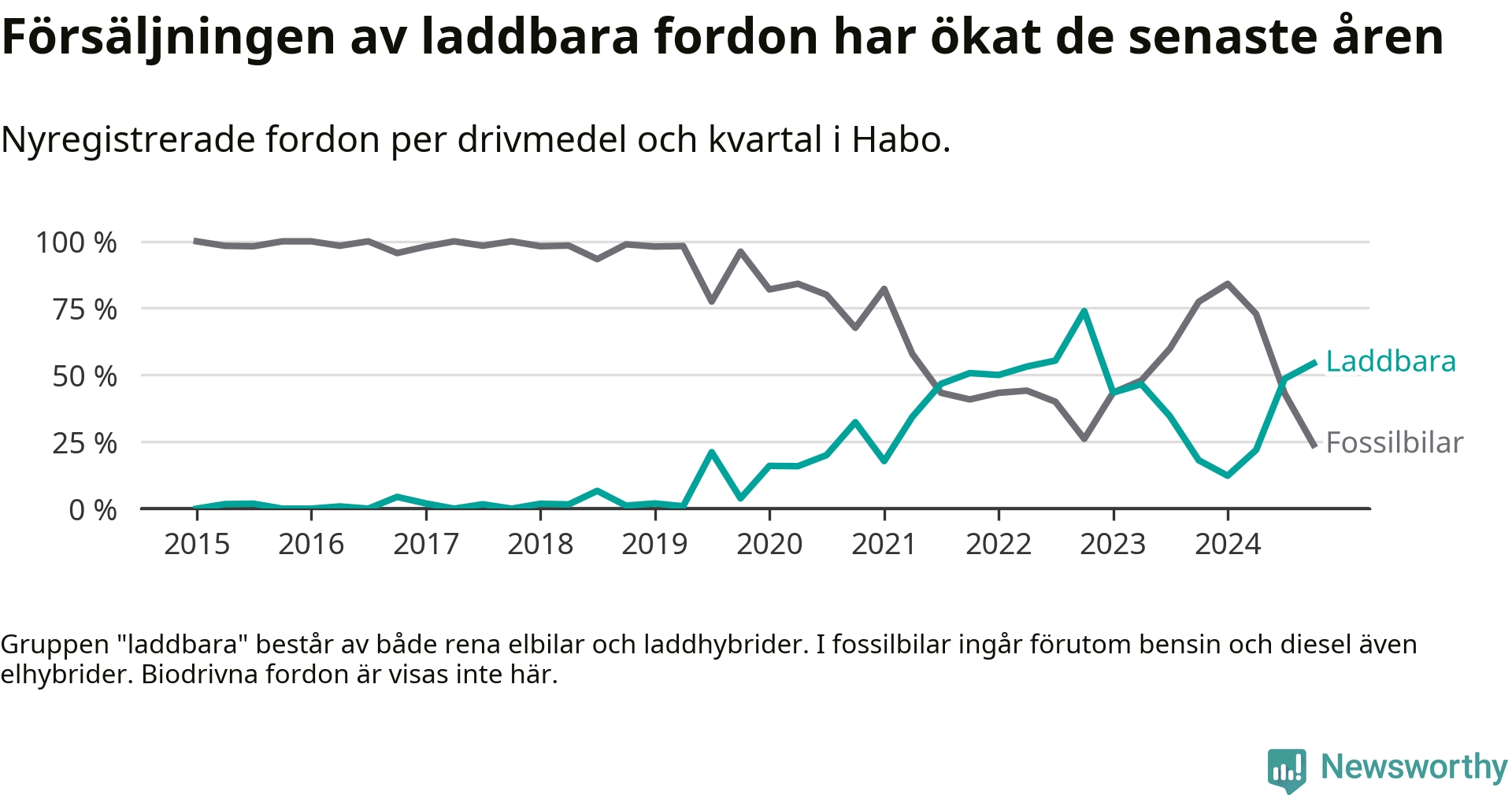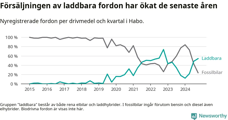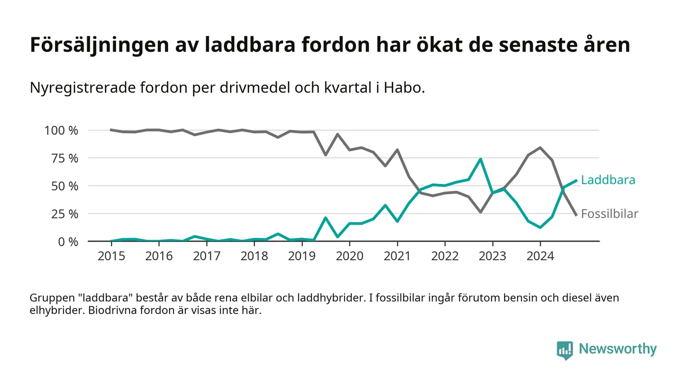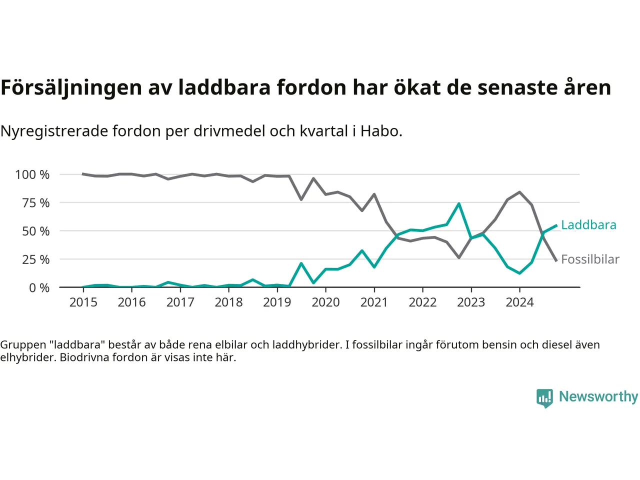 Under fjärde kvartalet 2024 var 54 procent av alla nyregistrerade personbilar i Habo laddbara (sammanlagt registrerades 92 nya bilar). Merparten av de laddbara bilarna var rena elbilar (43 procent av alla).