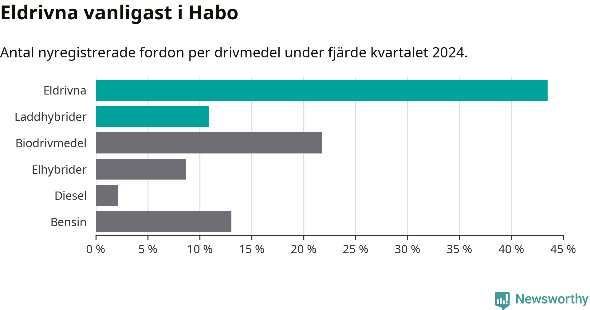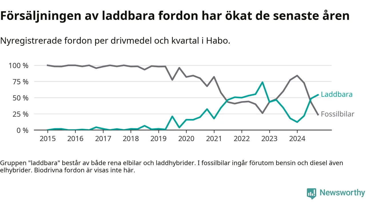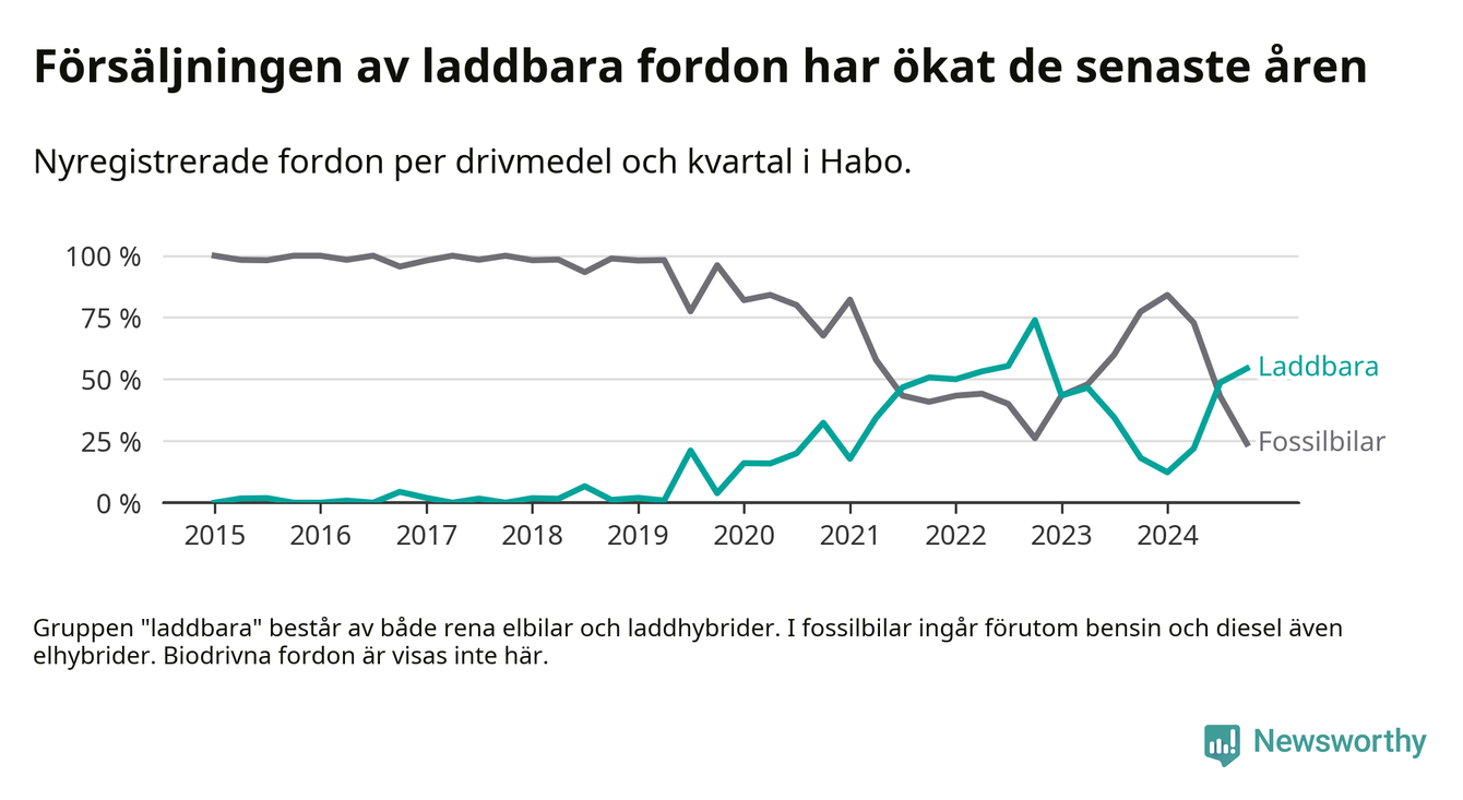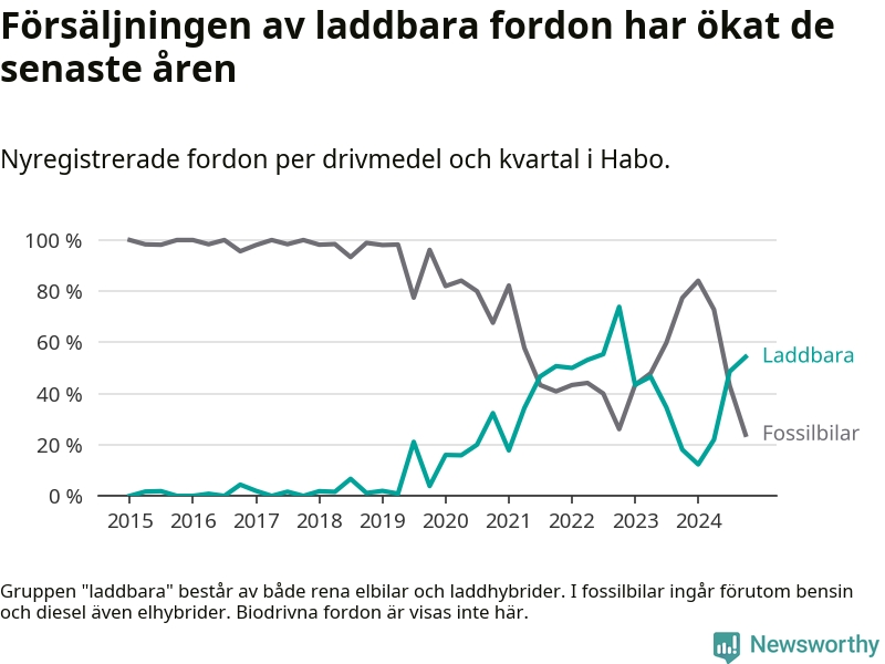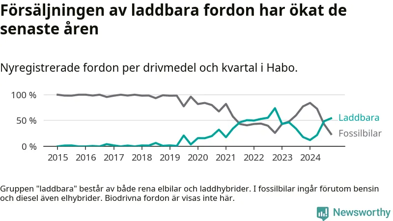 Under fjärde kvartalet 2024 var 54 procent av alla nyregistrerade personbilar i Habo laddbara (sammanlagt registrerades 92 nya bilar). Merparten av de laddbara bilarna var rena elbilar (43 procent av alla).