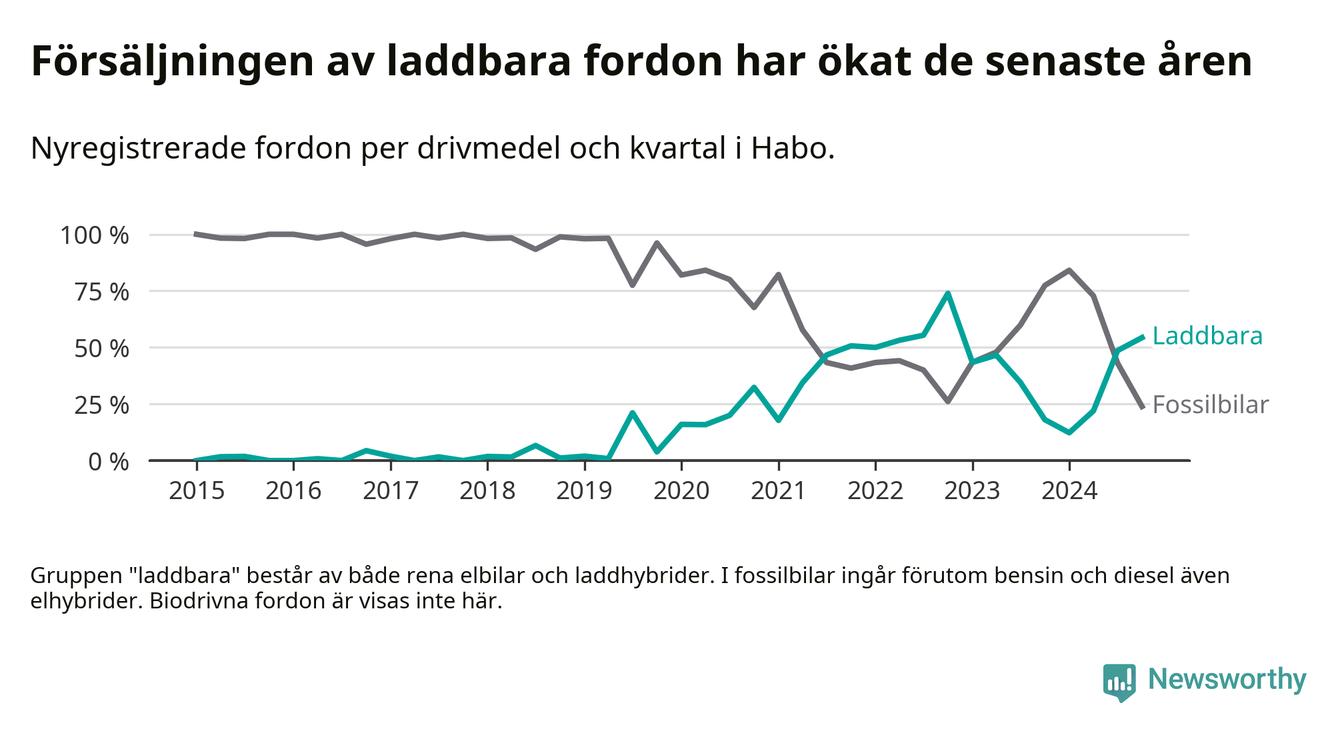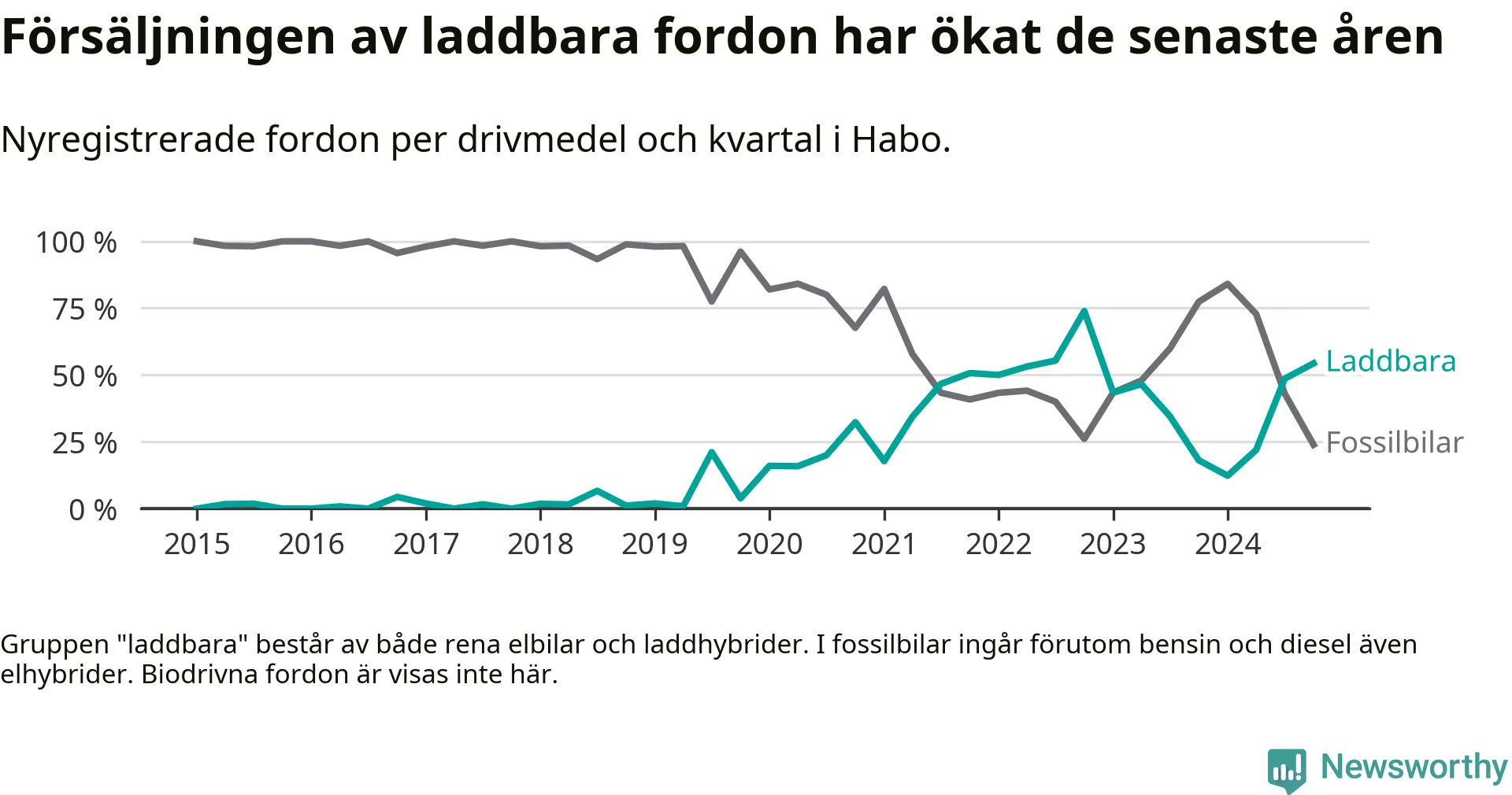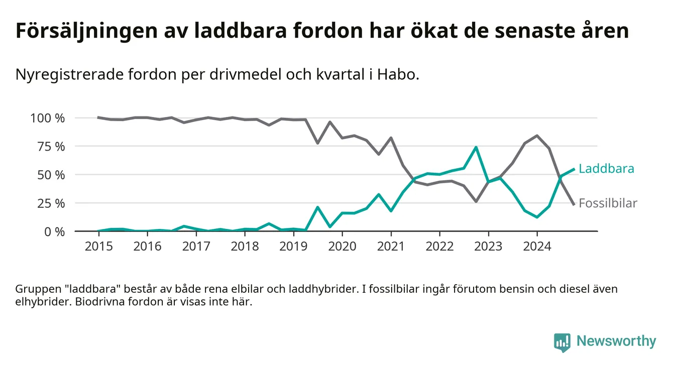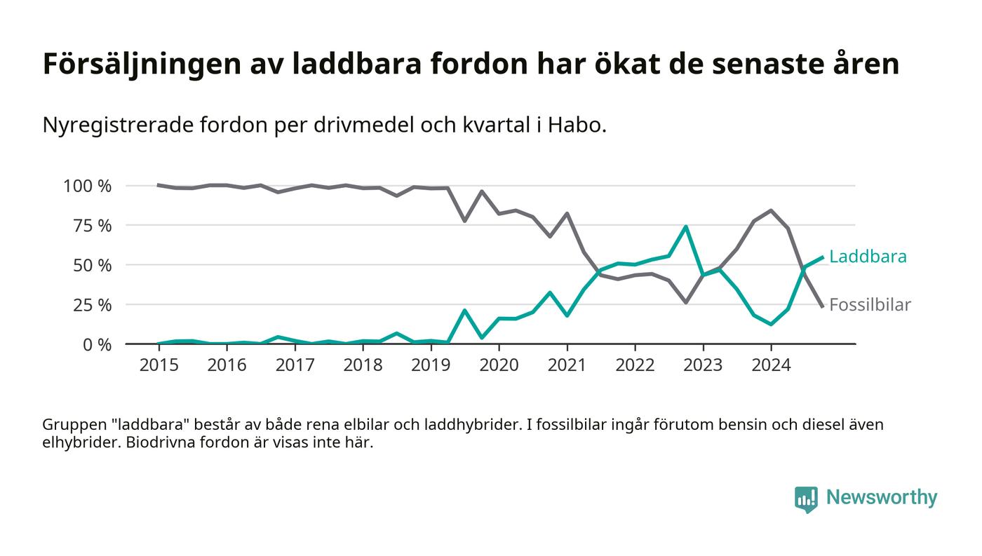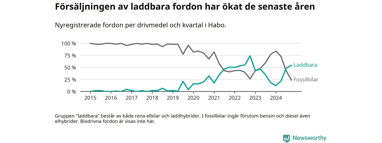 I Habo ökade andelen laddbara bilar under fjärde kvartalet jämfört med kvartalet innan. Nyregistreringen peakade under fjärde kvartalet 2022 då 74 procent av de nya bilarna var laddbara.