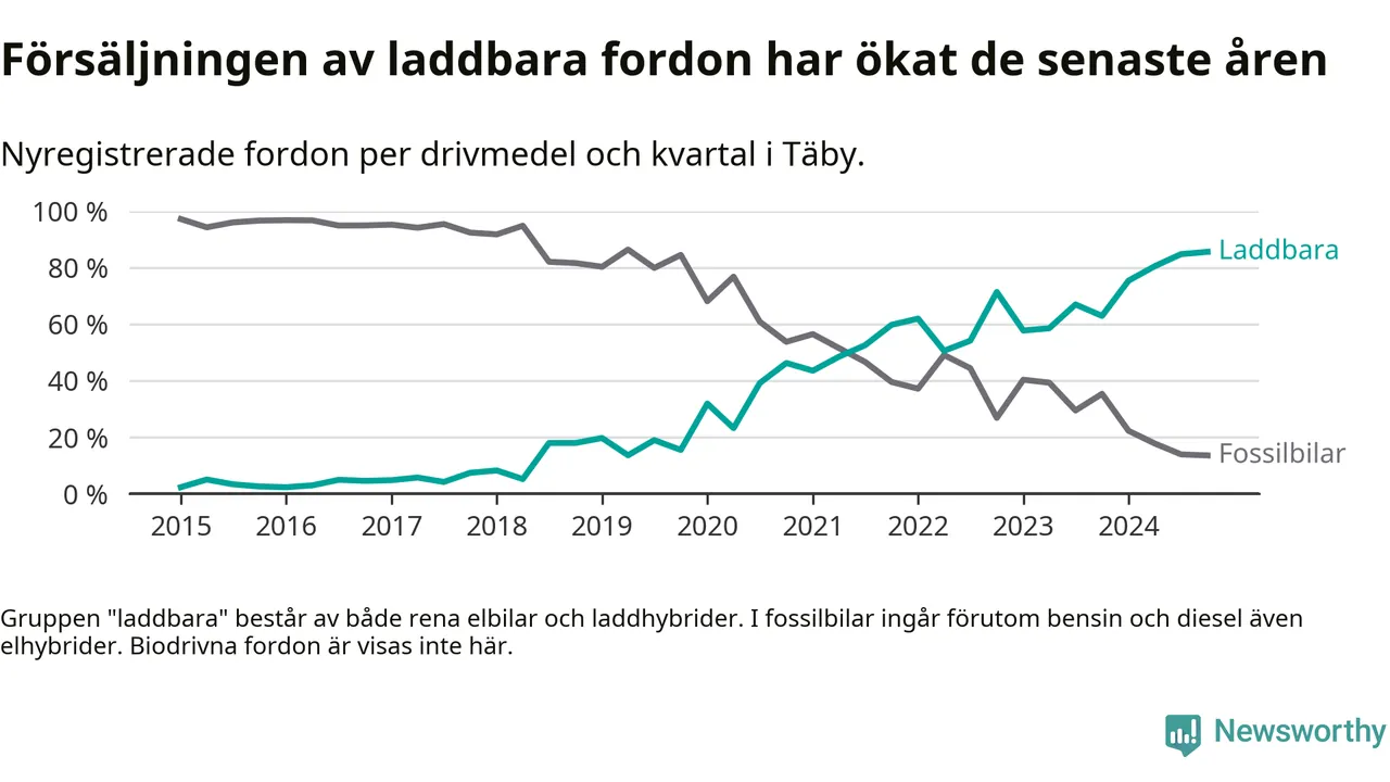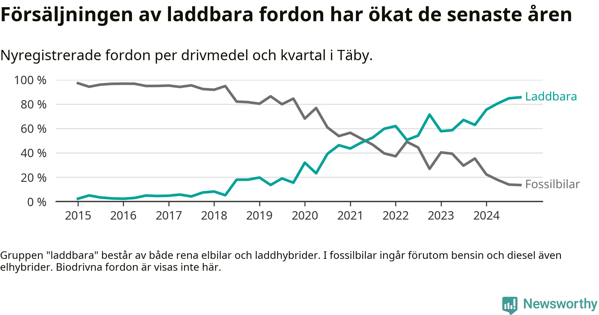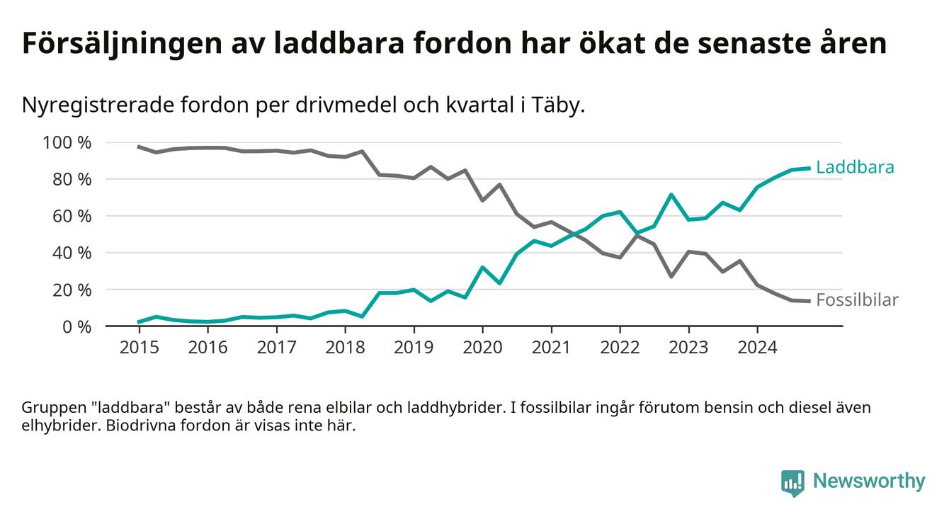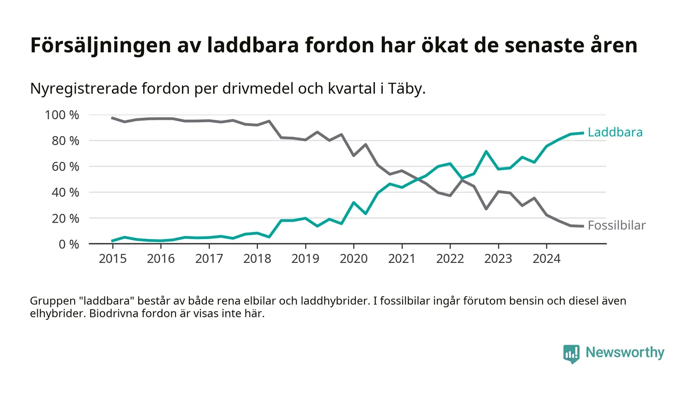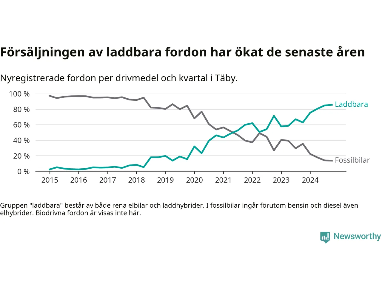 Under fjärde kvartalet 2024 var 86 procent av alla nyregistrerade personbilar i Täby laddbara (sammanlagt registrerades 1 845 nya bilar). Merparten av de laddbara bilarna var rena elbilar (59 procent av alla).