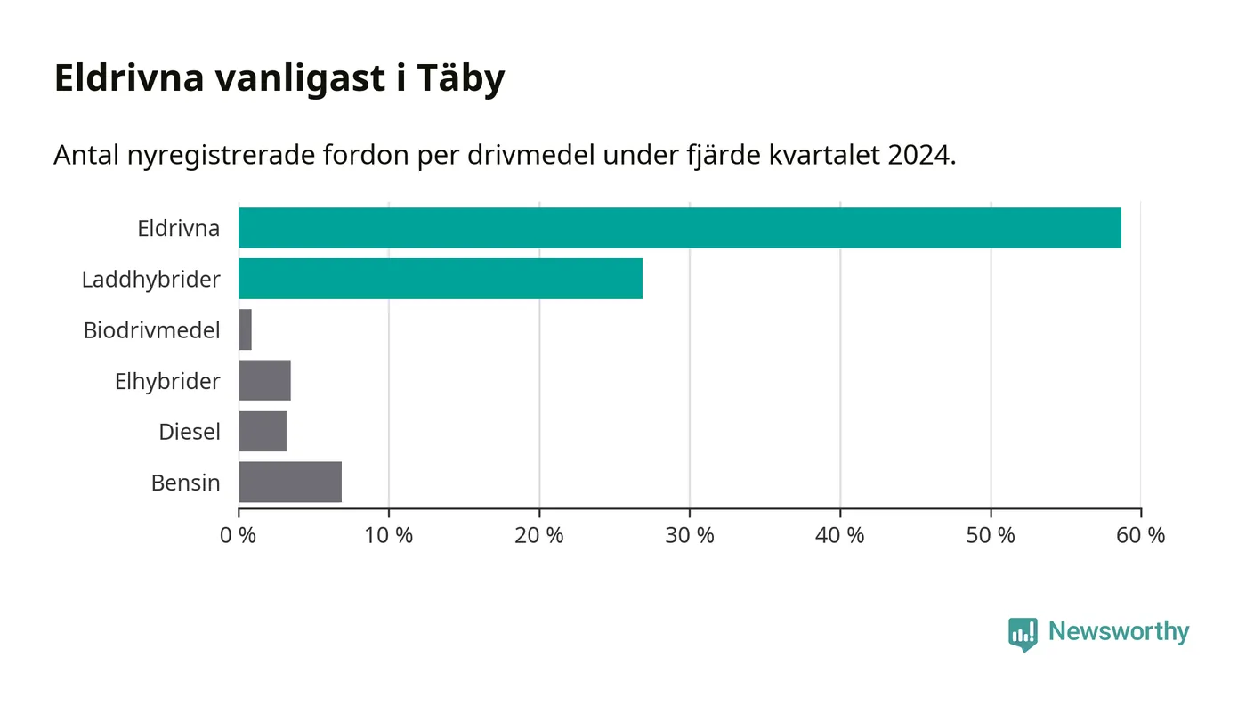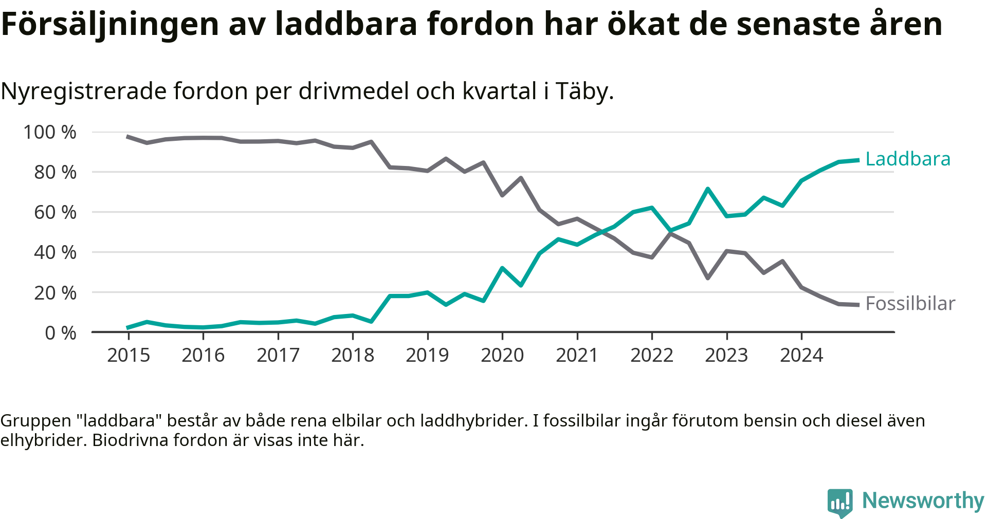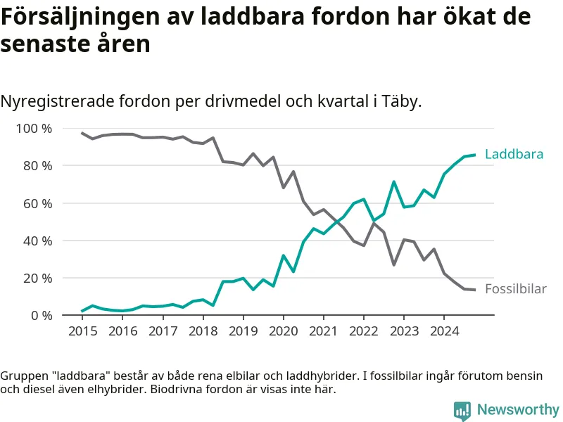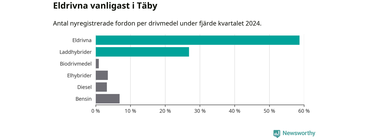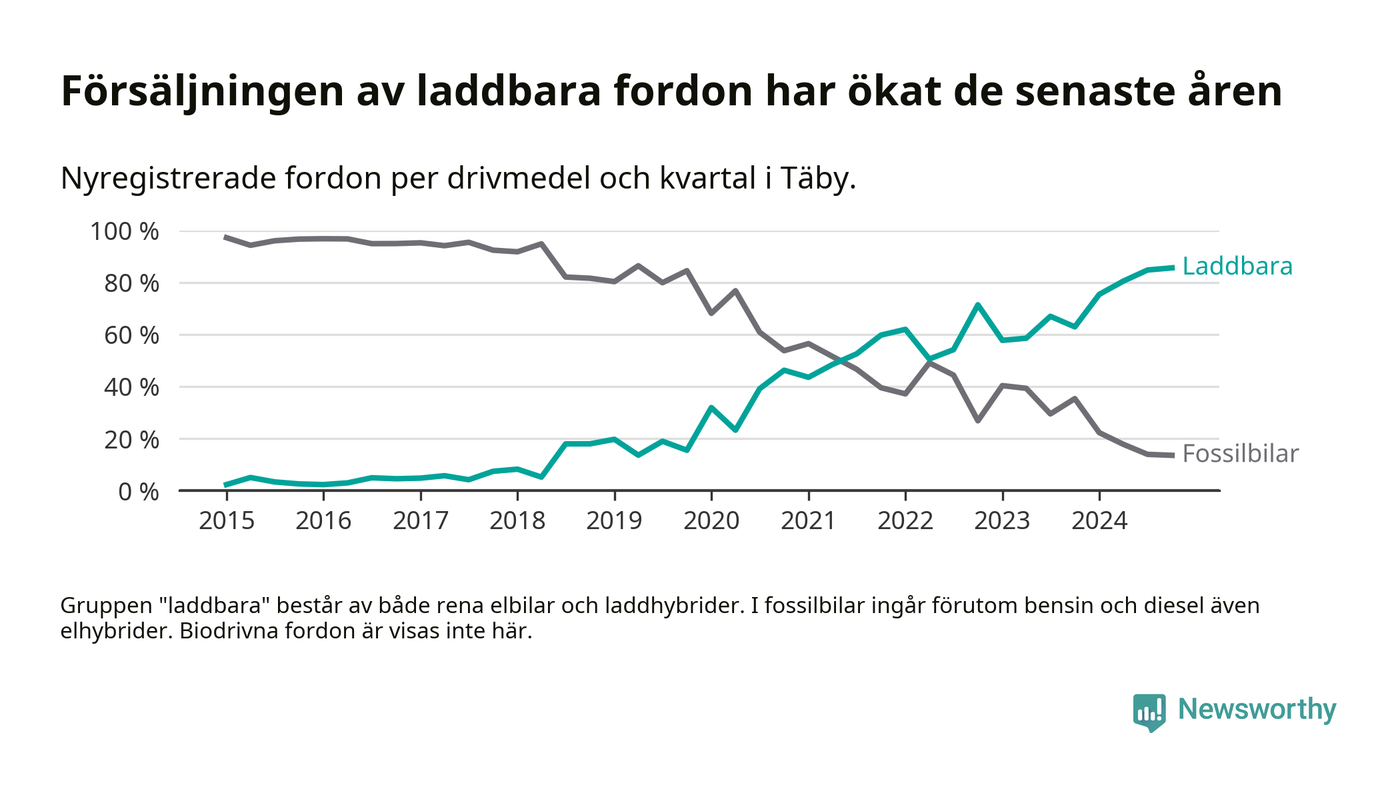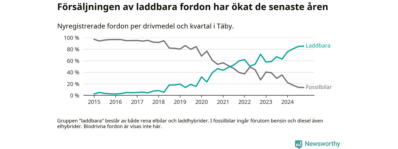 Under fjärde kvartalet 2024 var 86 procent av alla nyregistrerade personbilar i Täby laddbara (sammanlagt registrerades 1 845 nya bilar). Merparten av de laddbara bilarna var rena elbilar (59 procent av alla).