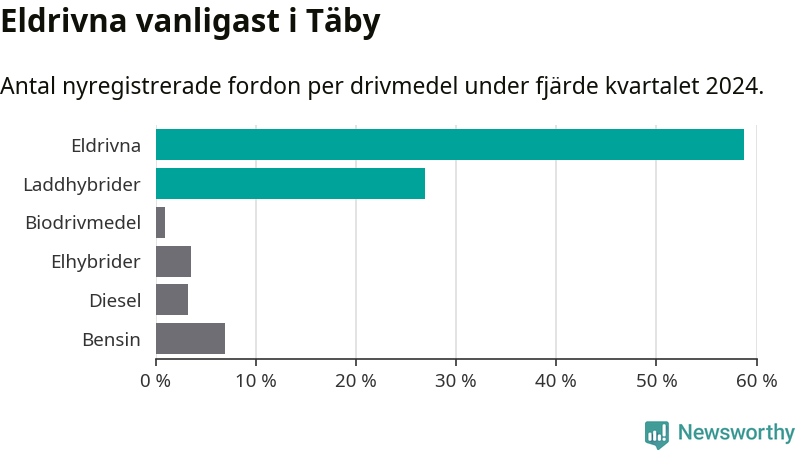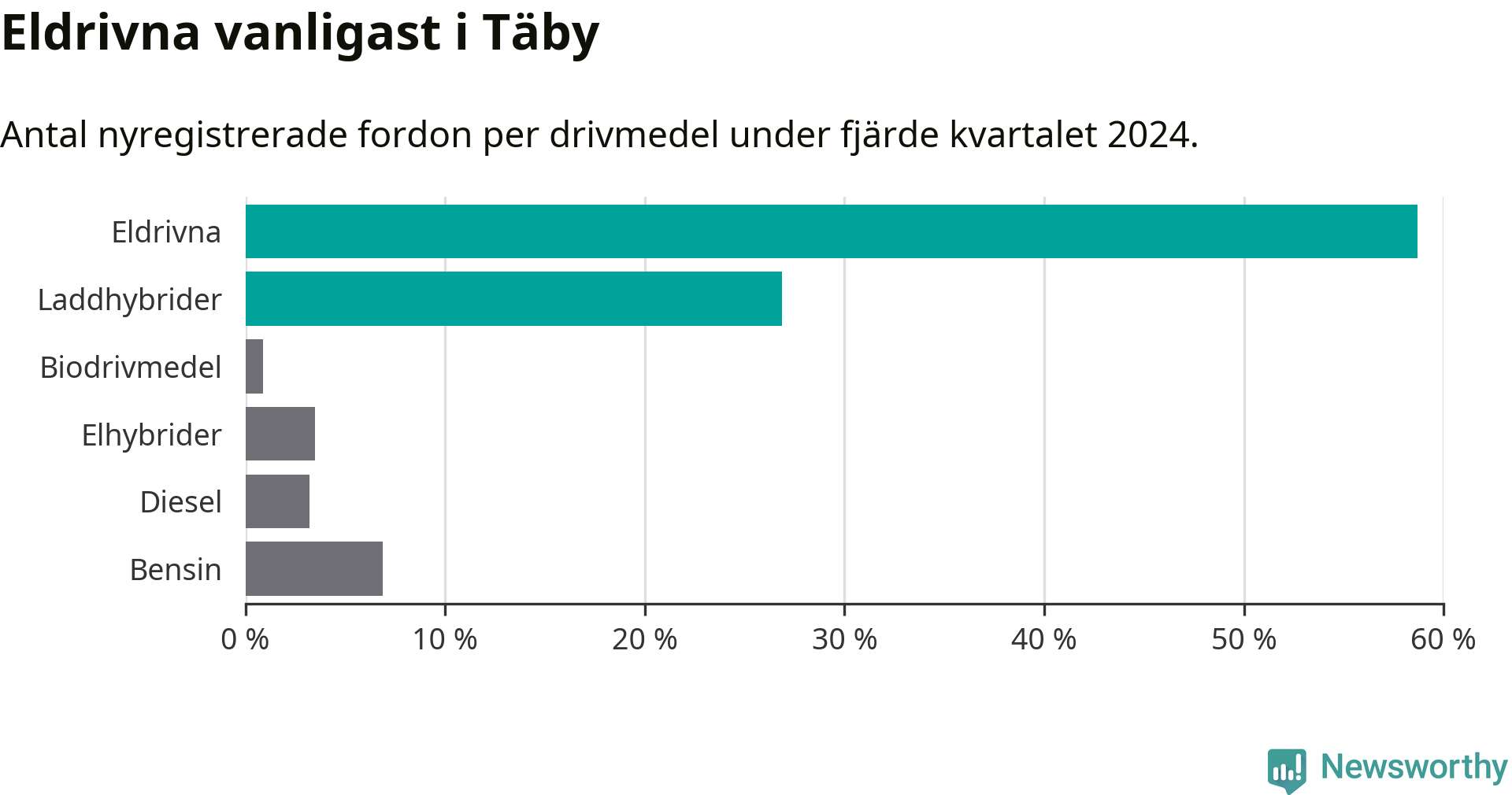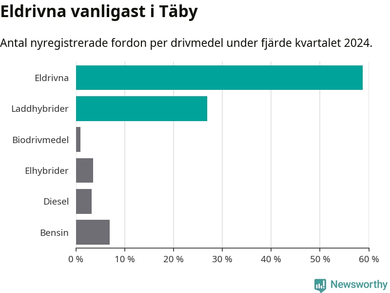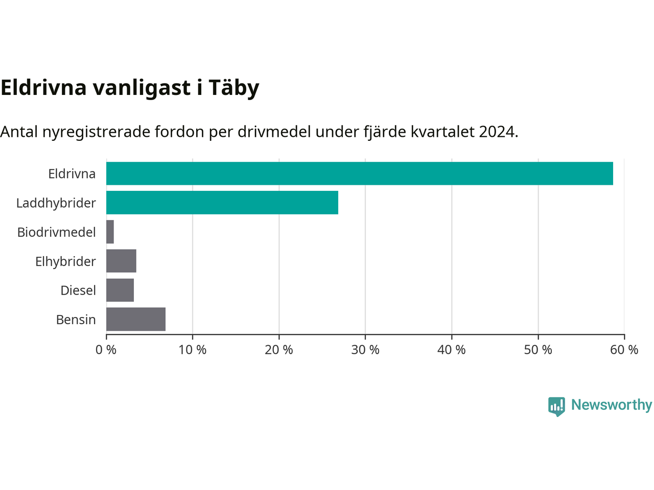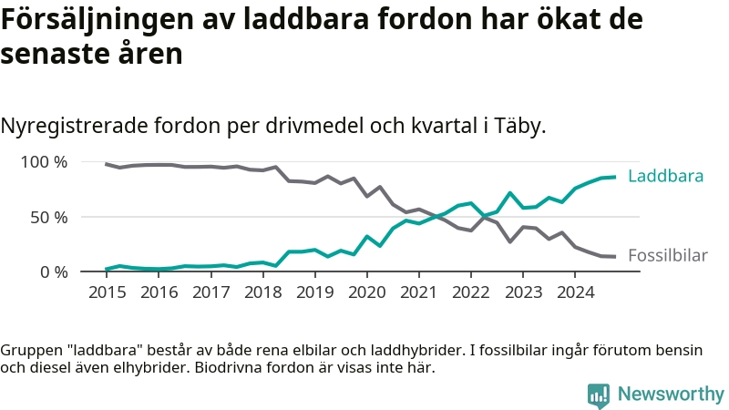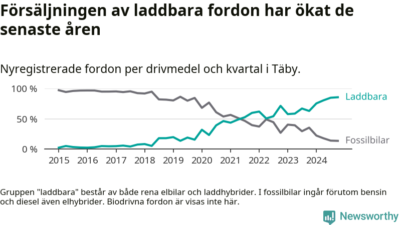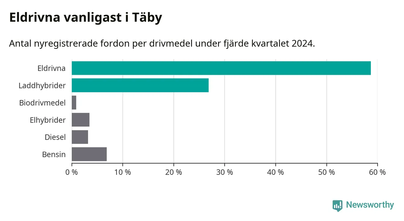 Under fjärde kvartalet 2024 var 86 procent av alla nyregistrerade personbilar i Täby laddbara (sammanlagt registrerades 1 845 nya bilar). Merparten av de laddbara bilarna var rena elbilar (59 procent av alla).