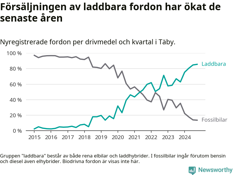 I Täby noterades ett nytt rekord under fjärde kvartalet. Aldrig tidigare har laddbara bilar utgjort en så stor del av alla nya bilar.