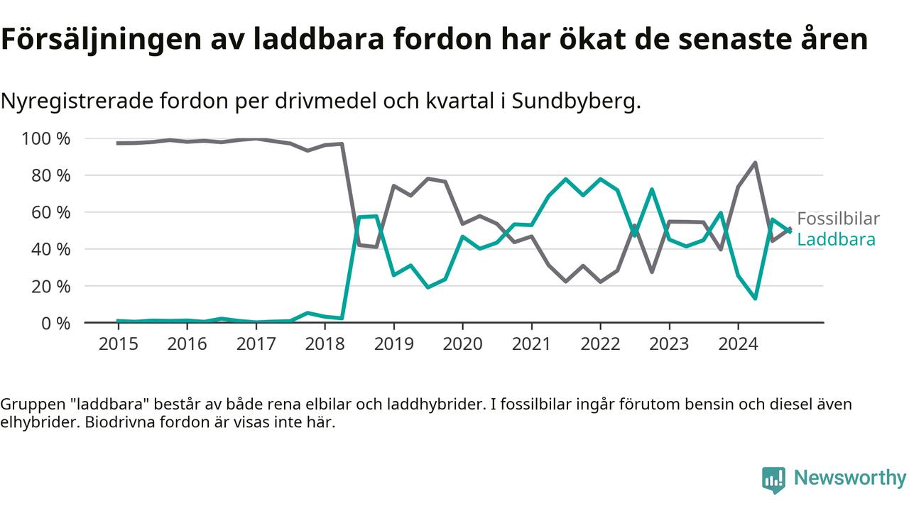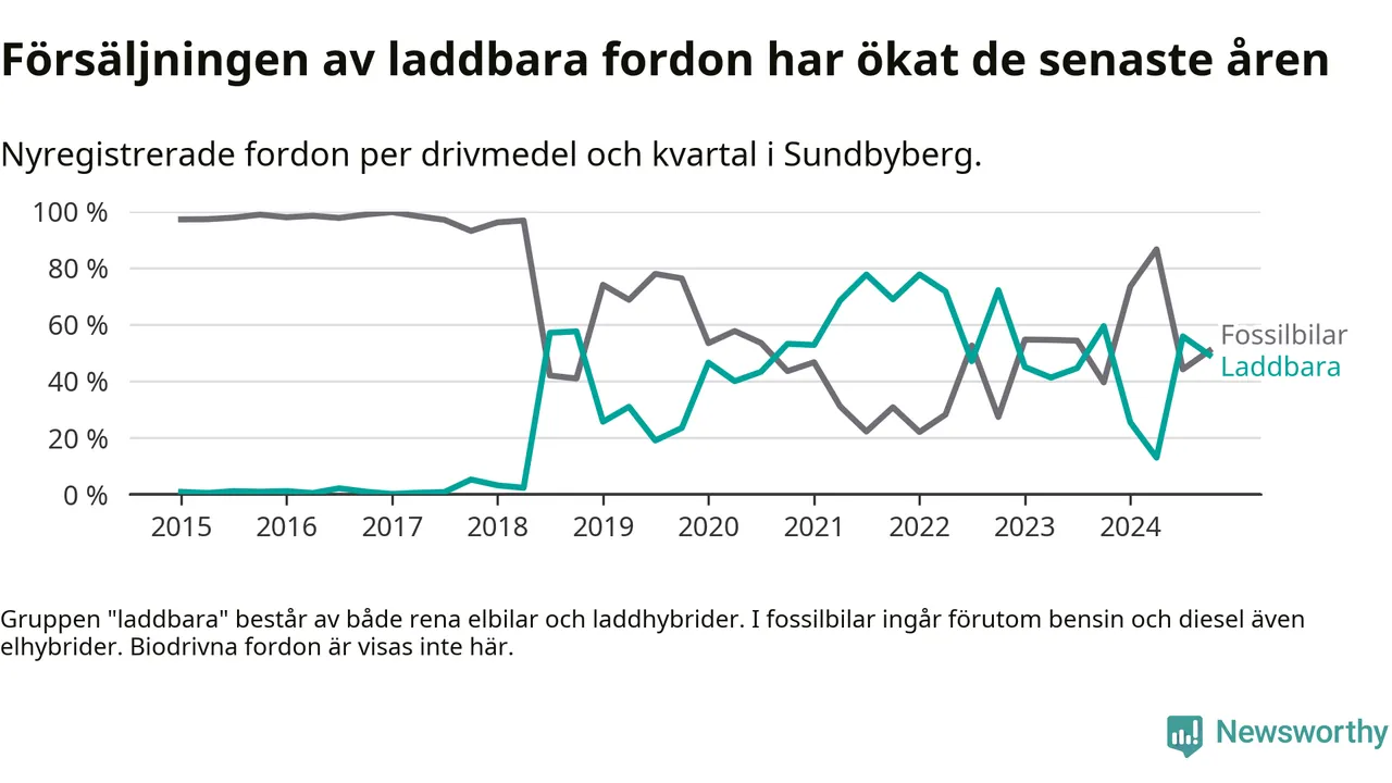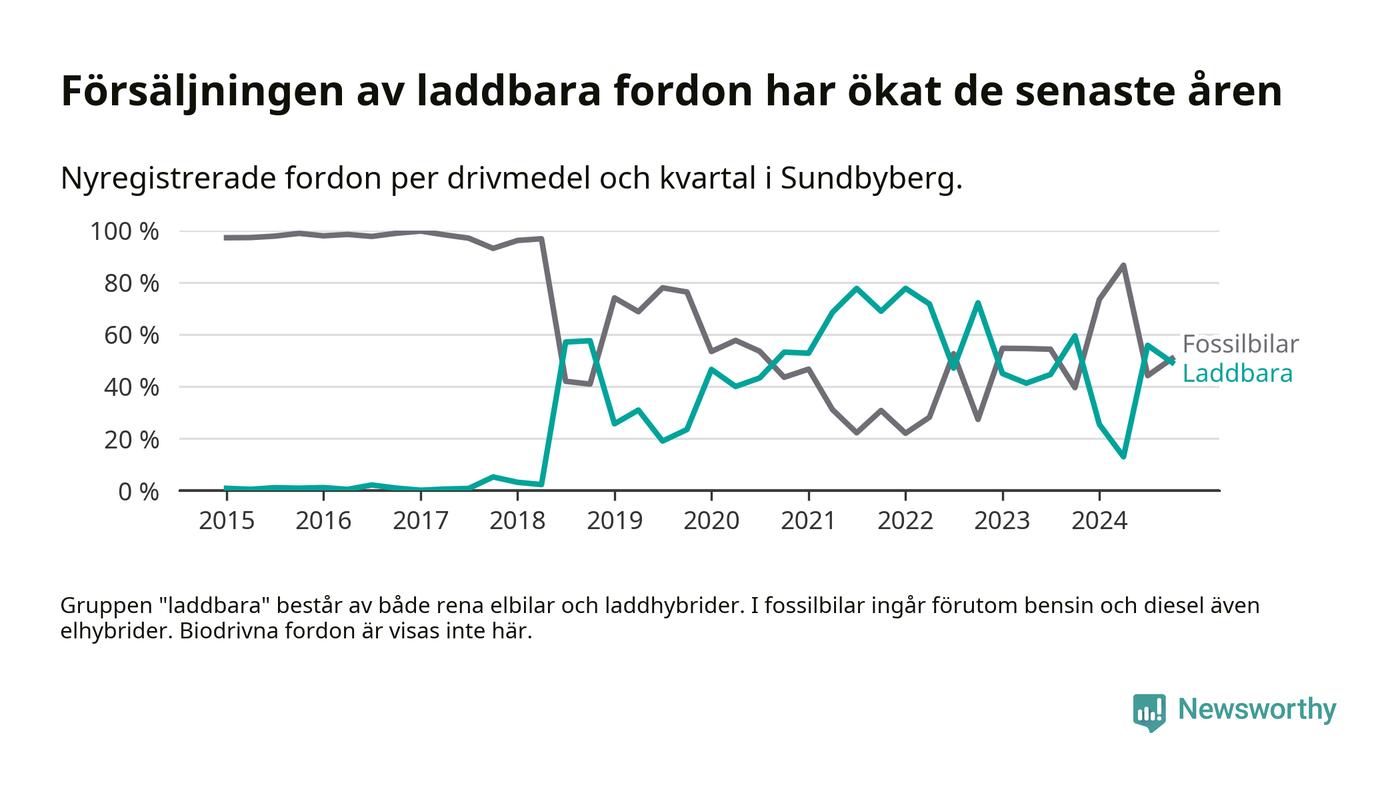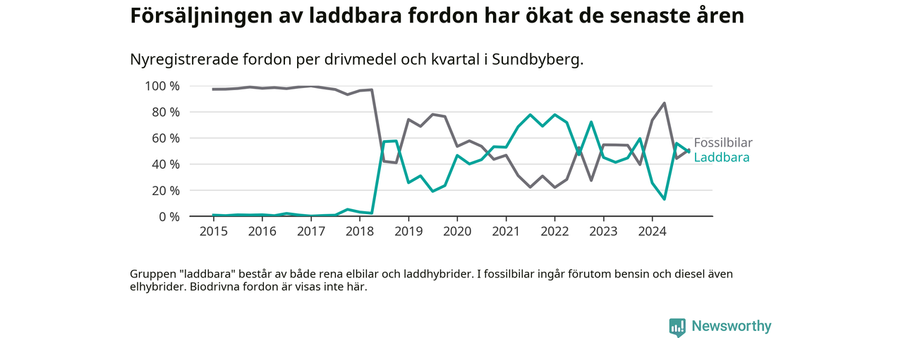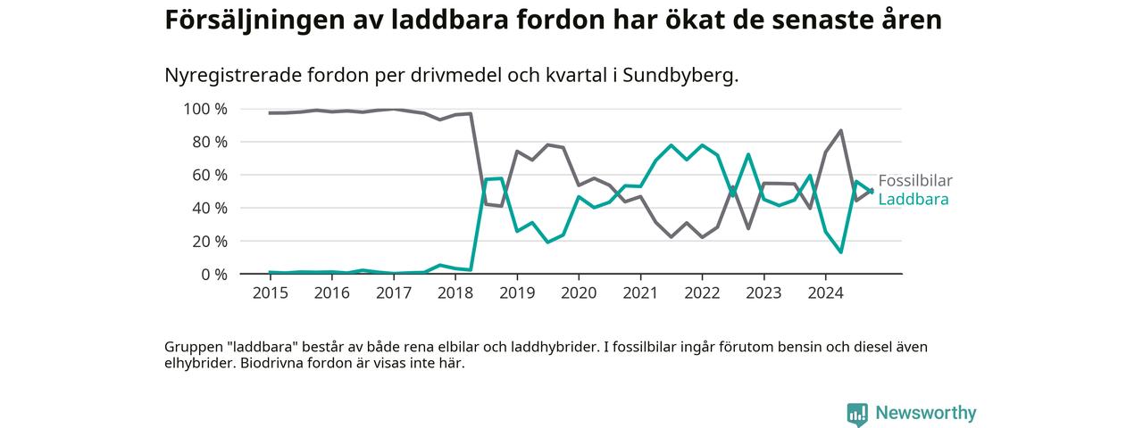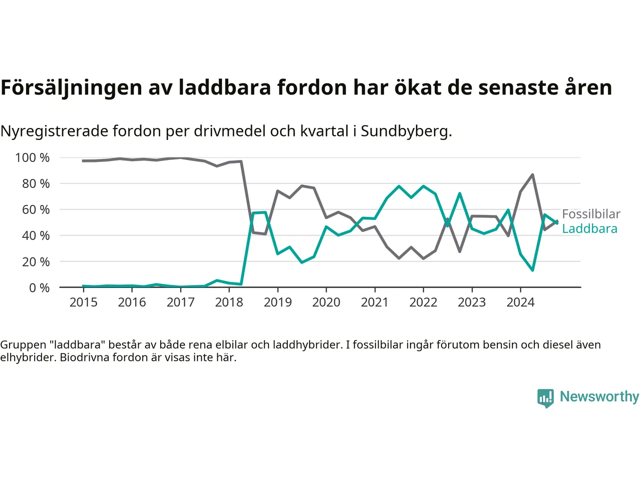 Under fjärde kvartalet 2024 var 49 procent av alla nyregistrerade personbilar i Sundbyberg laddbara (sammanlagt registrerades 264 nya bilar). Merparten av de laddbara bilarna var rena elbilar (31 procent av alla).