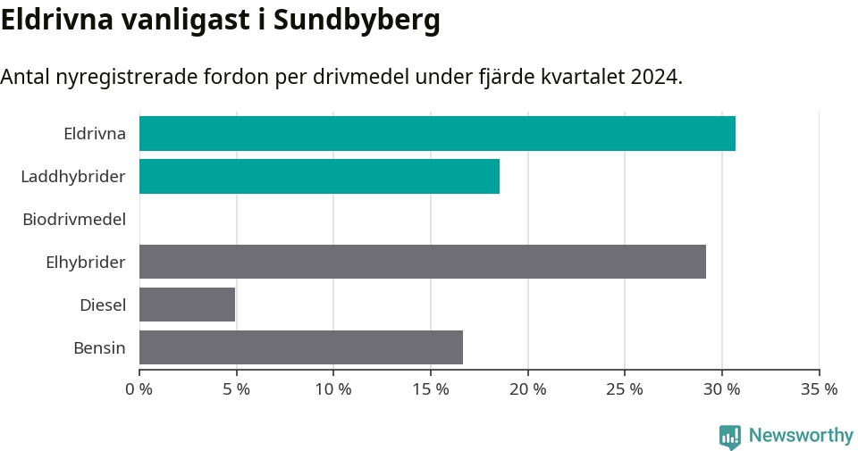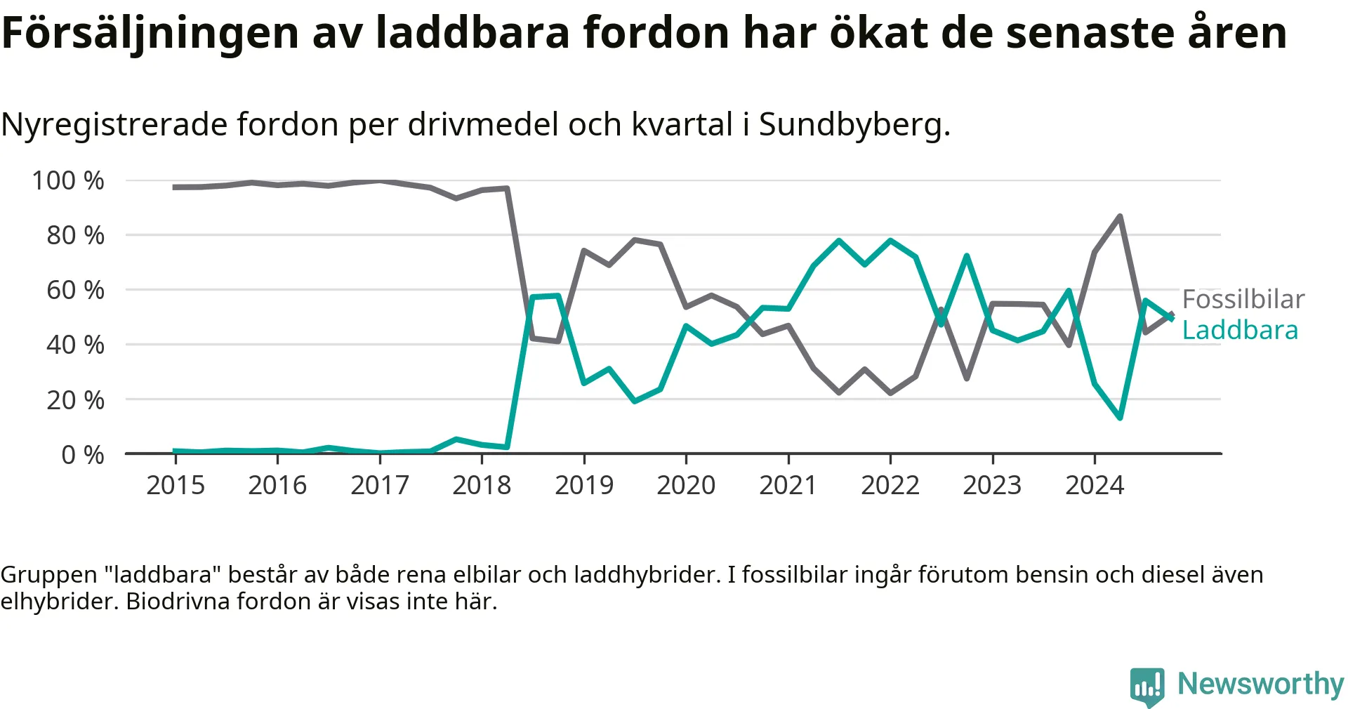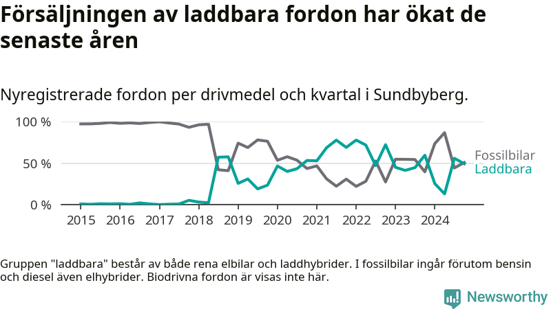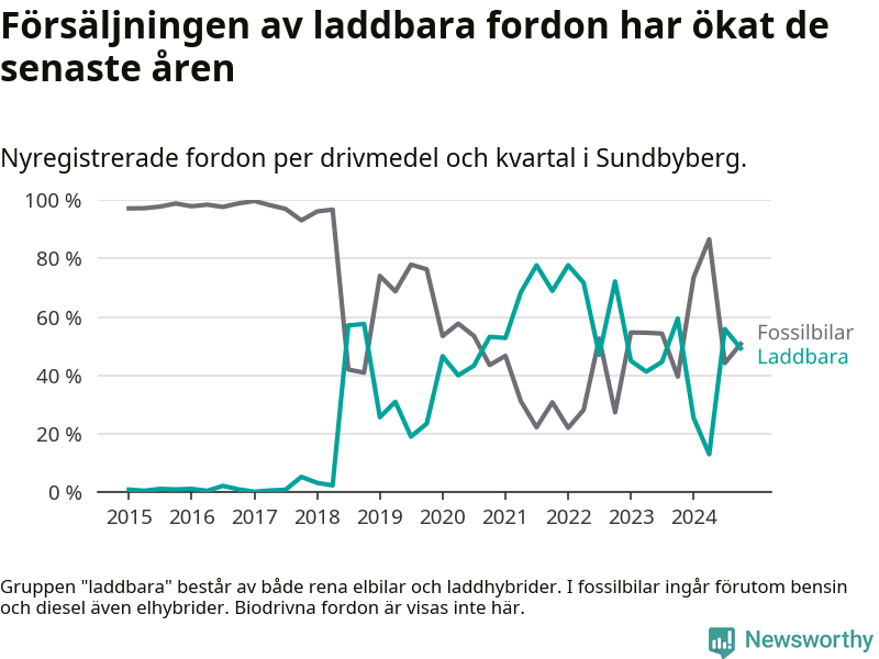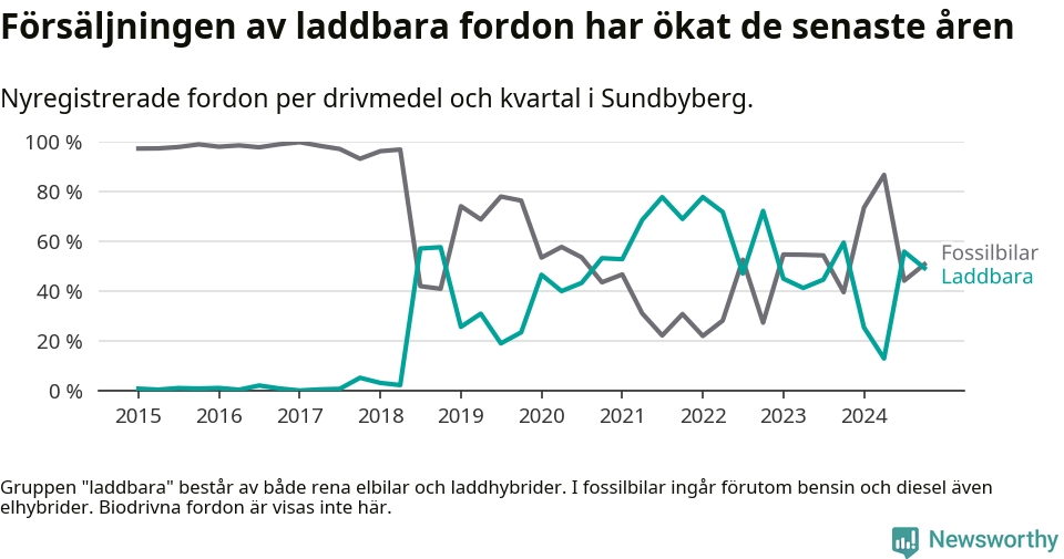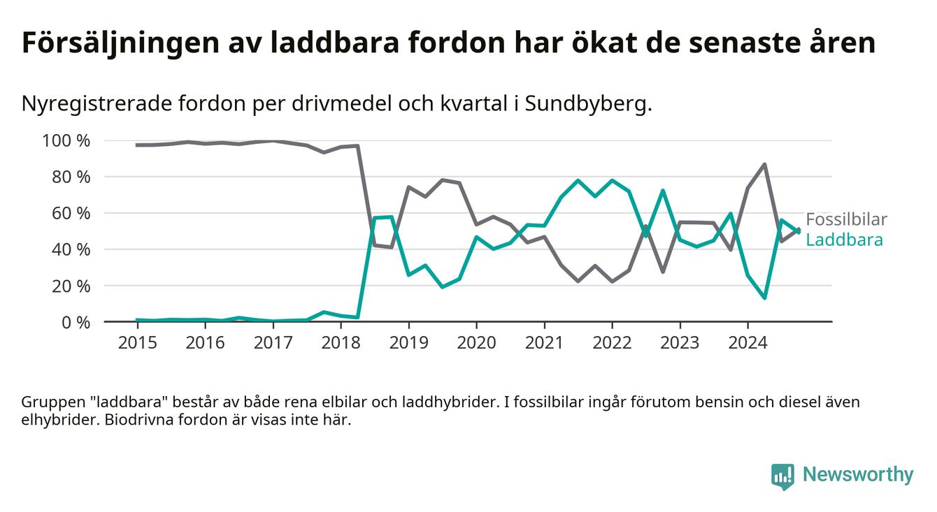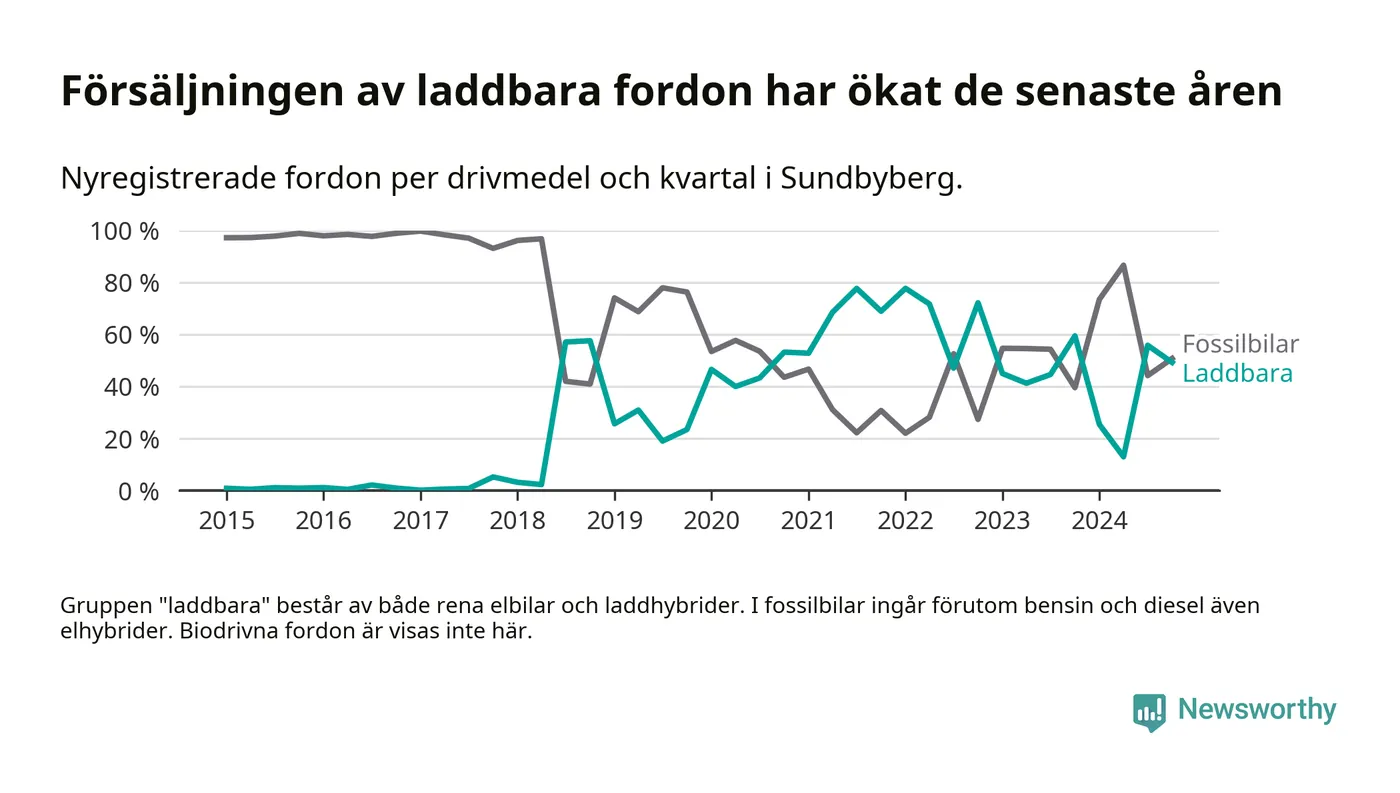 Under fjärde kvartalet 2024 var 49 procent av alla nyregistrerade personbilar i Sundbyberg laddbara (sammanlagt registrerades 264 nya bilar). Merparten av de laddbara bilarna var rena elbilar (31 procent av alla).