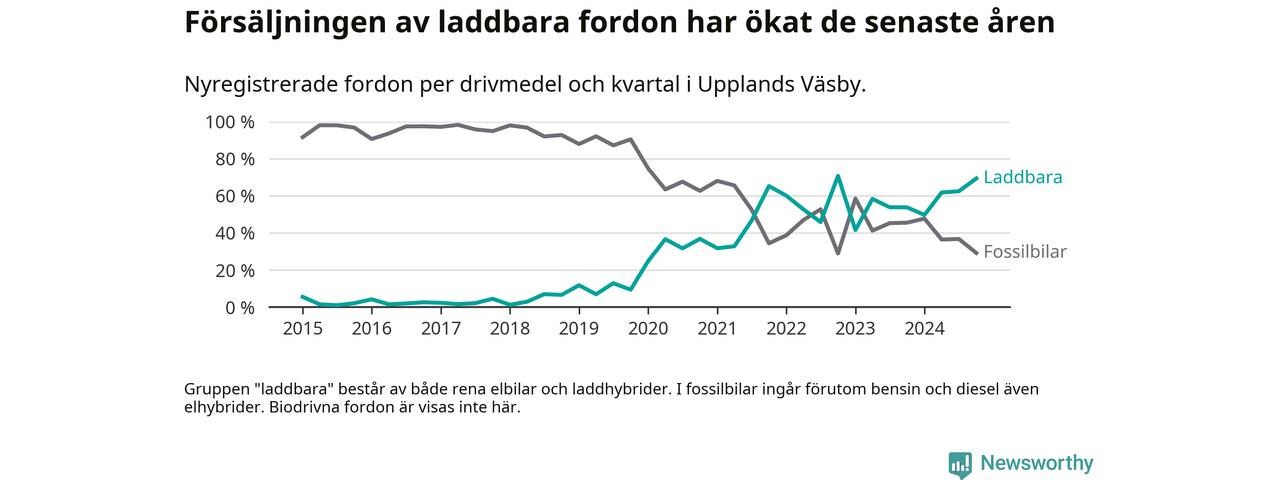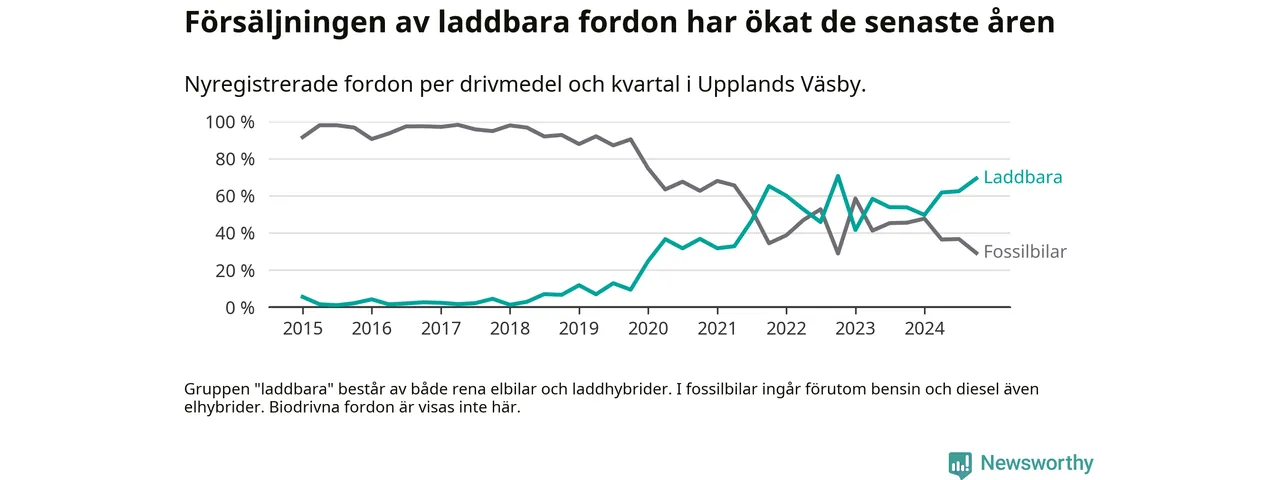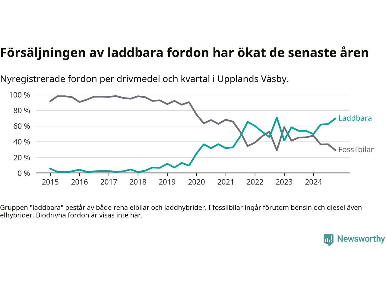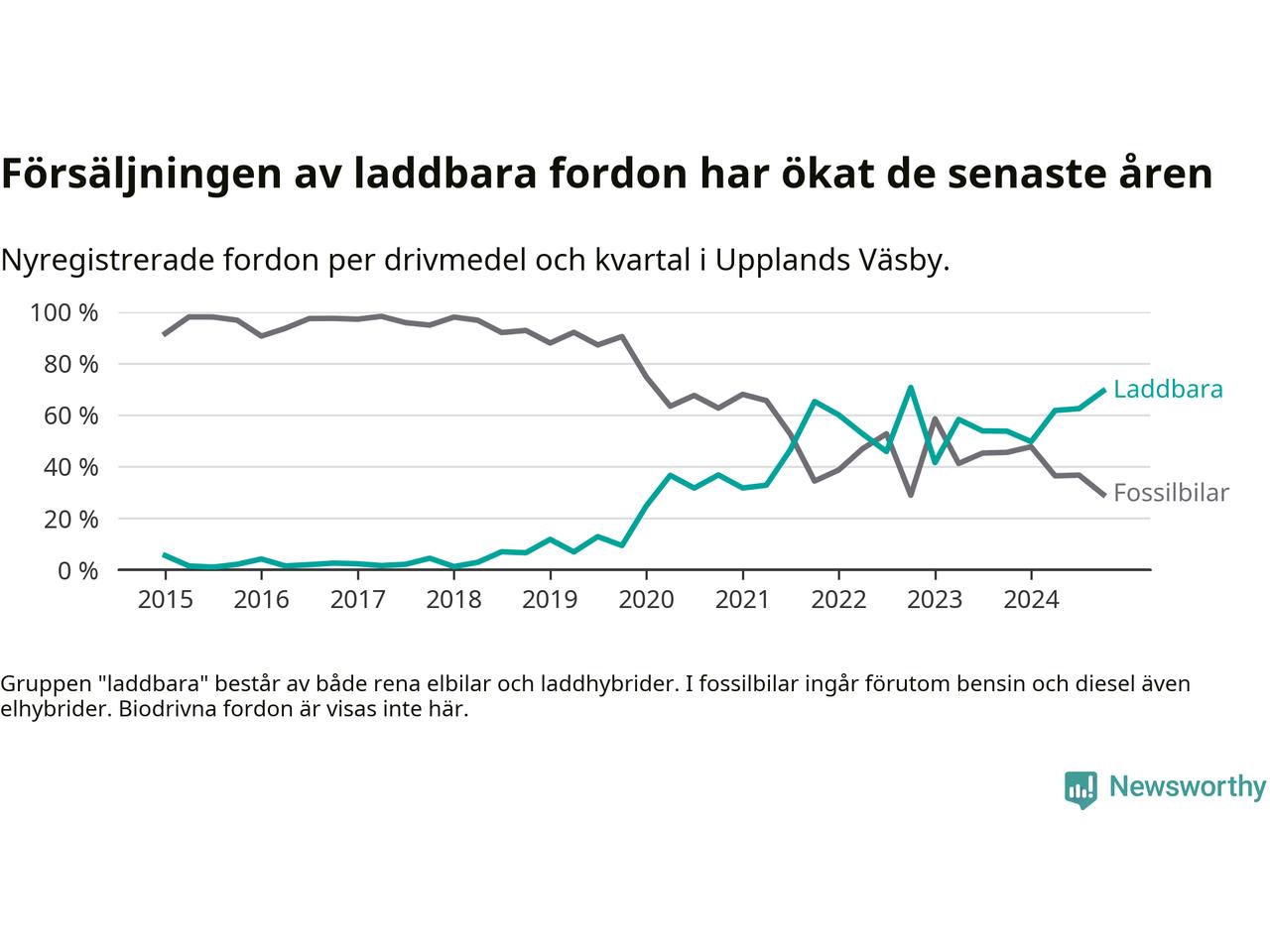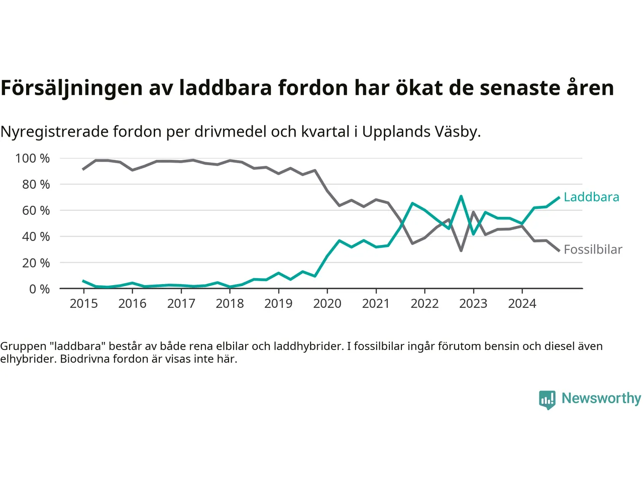 Under fjärde kvartalet 2024 var 69 procent av alla nyregistrerade personbilar i Upplands Väsby laddbara (sammanlagt registrerades 264 nya bilar). Merparten av de laddbara bilarna var rena elbilar (47 procent av alla).