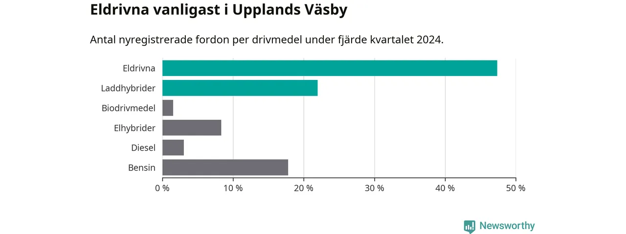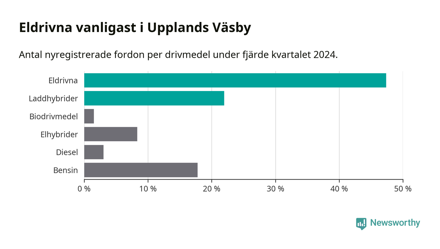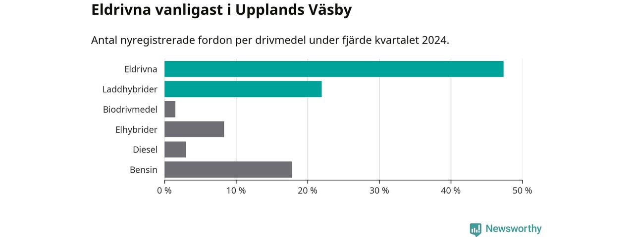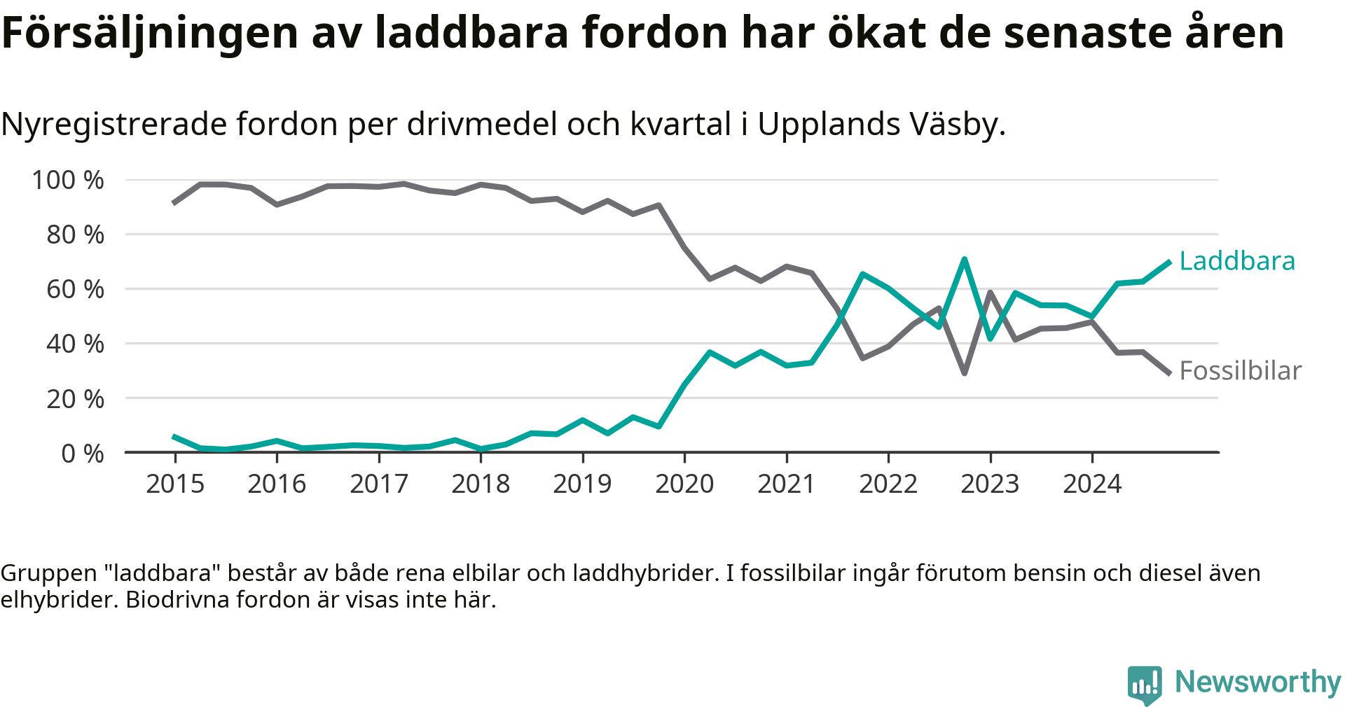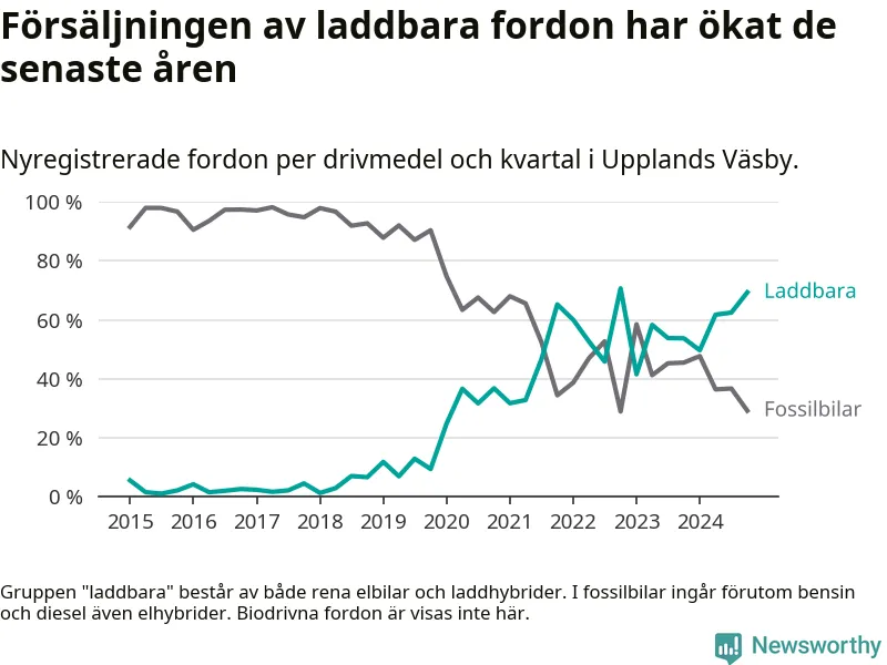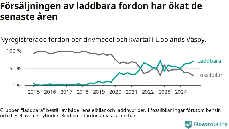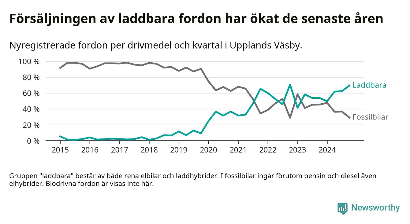 Under fjärde kvartalet 2024 var 69 procent av alla nyregistrerade personbilar i Upplands Väsby laddbara (sammanlagt registrerades 264 nya bilar). Merparten av de laddbara bilarna var rena elbilar (47 procent av alla).
