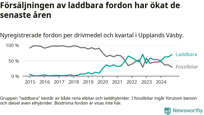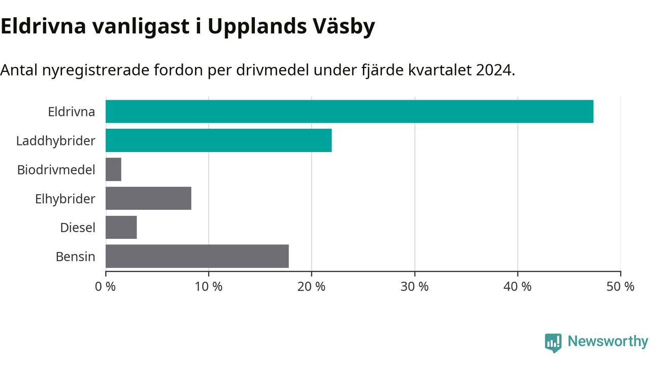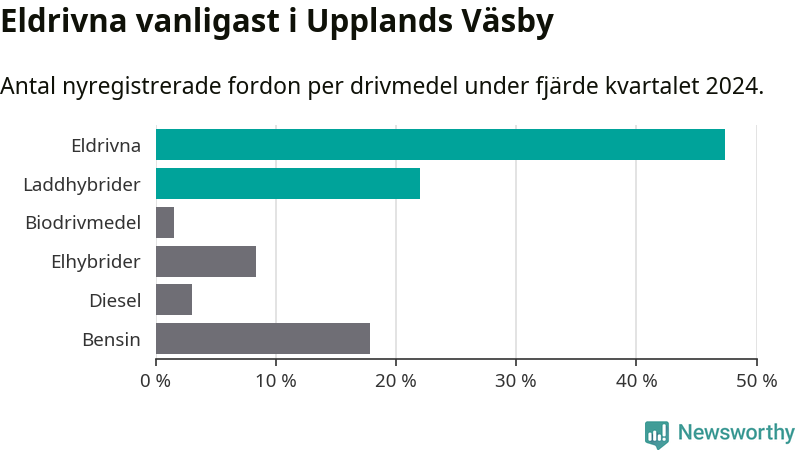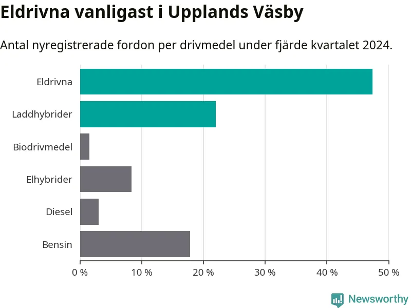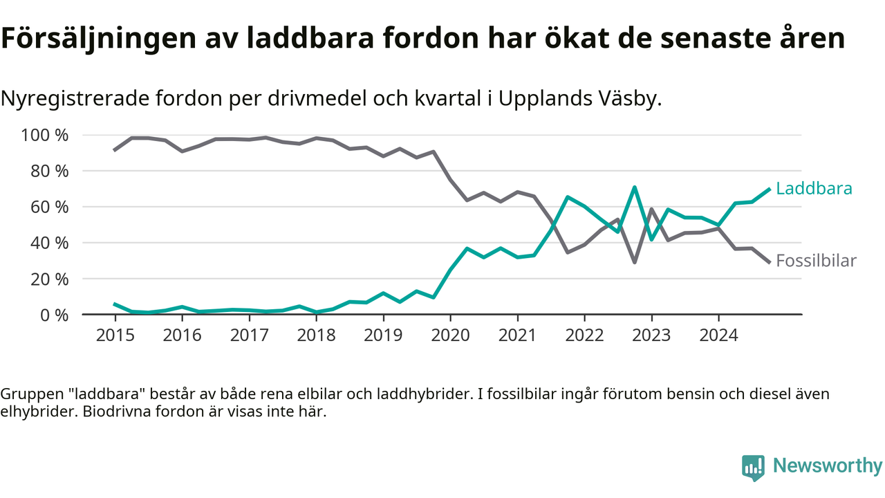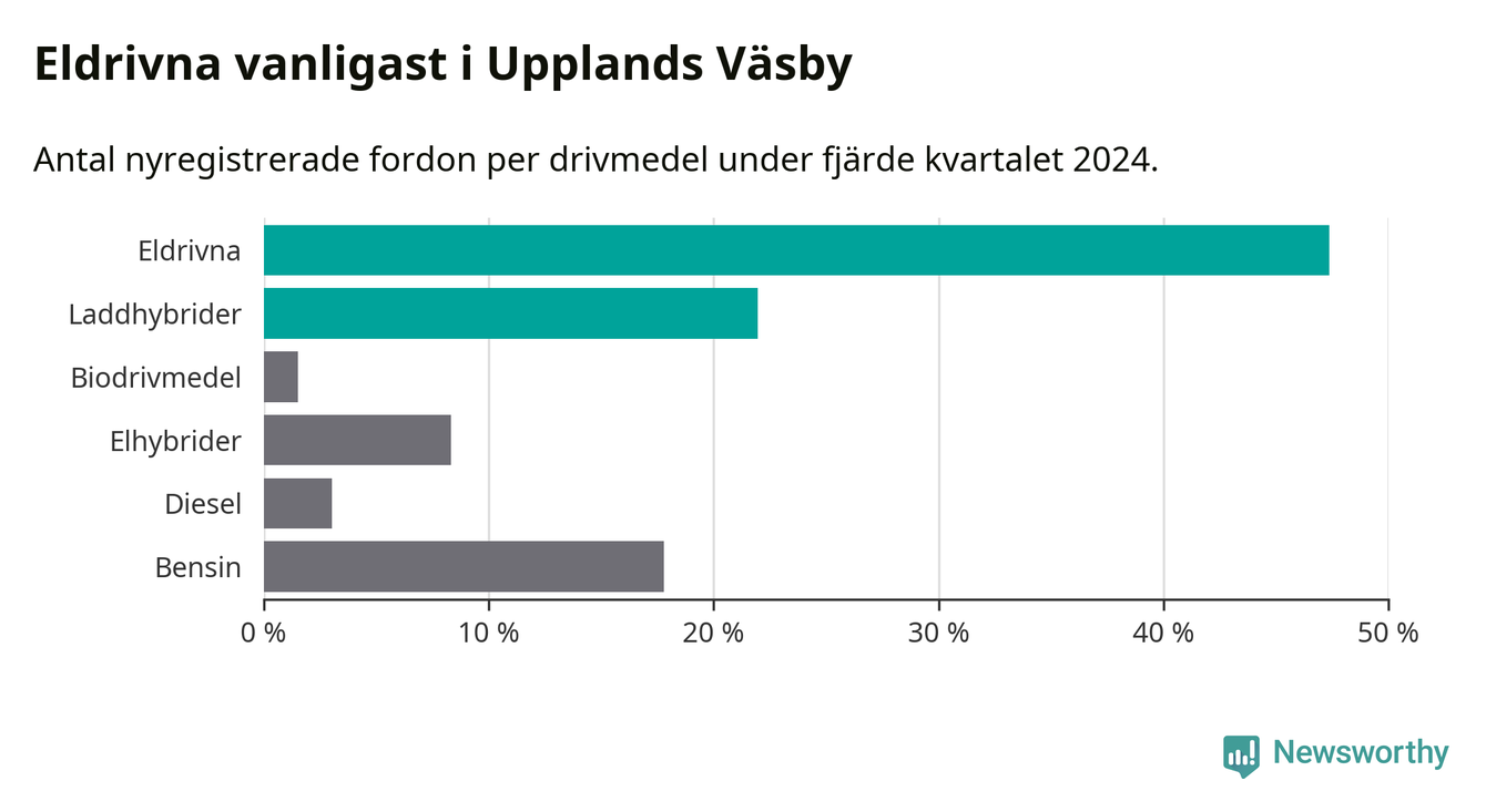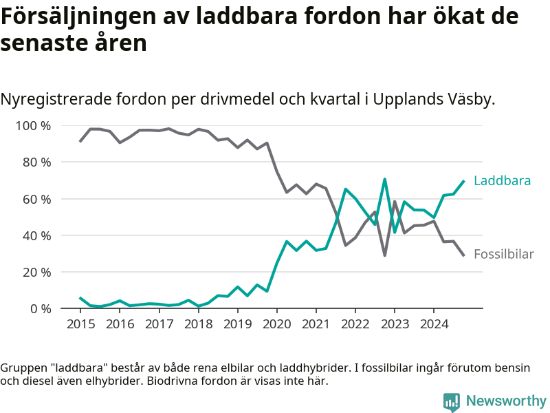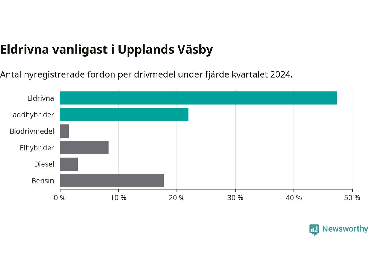 Under fjärde kvartalet 2024 var 69 procent av alla nyregistrerade personbilar i Upplands Väsby laddbara (sammanlagt registrerades 264 nya bilar). Merparten av de laddbara bilarna var rena elbilar (47 procent av alla).