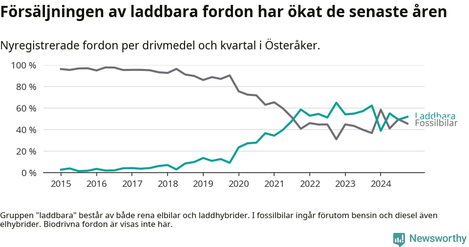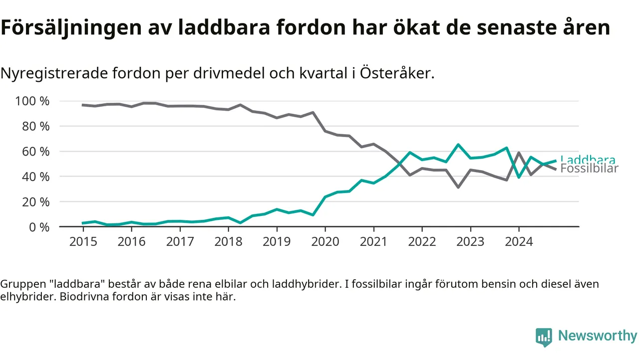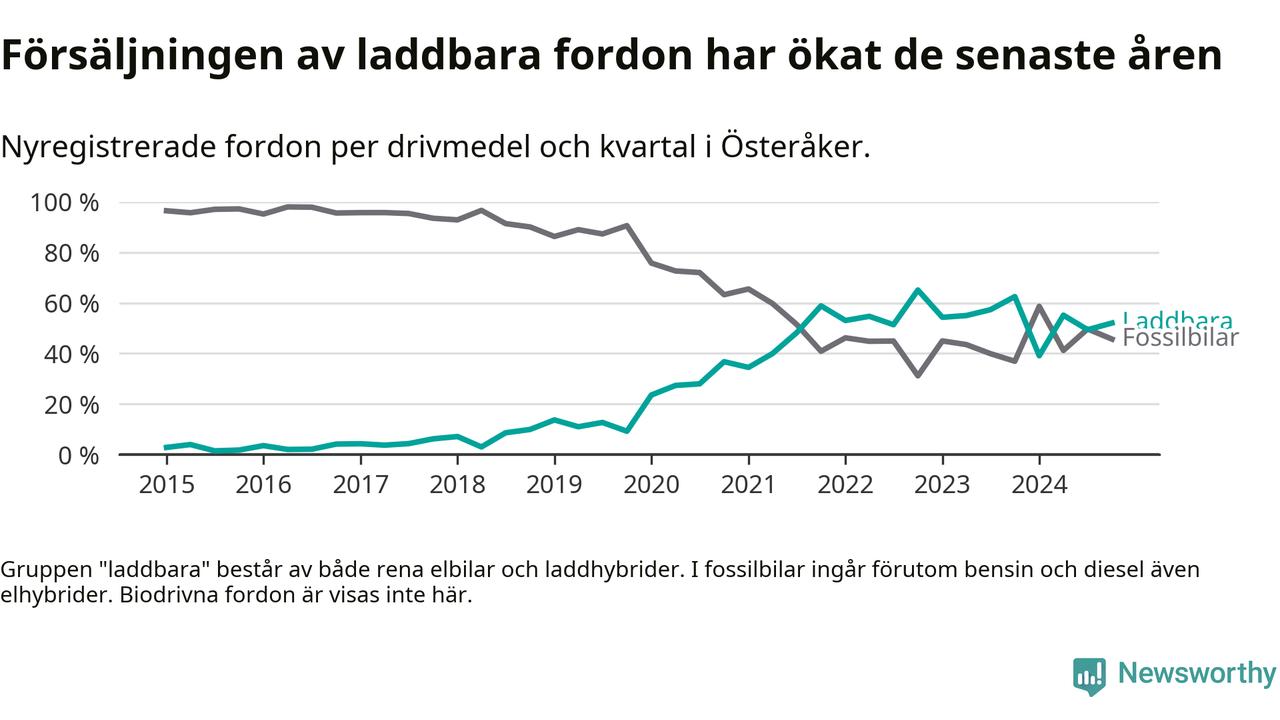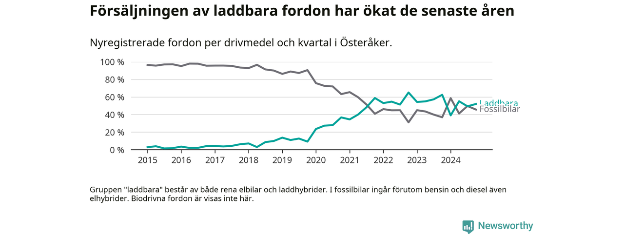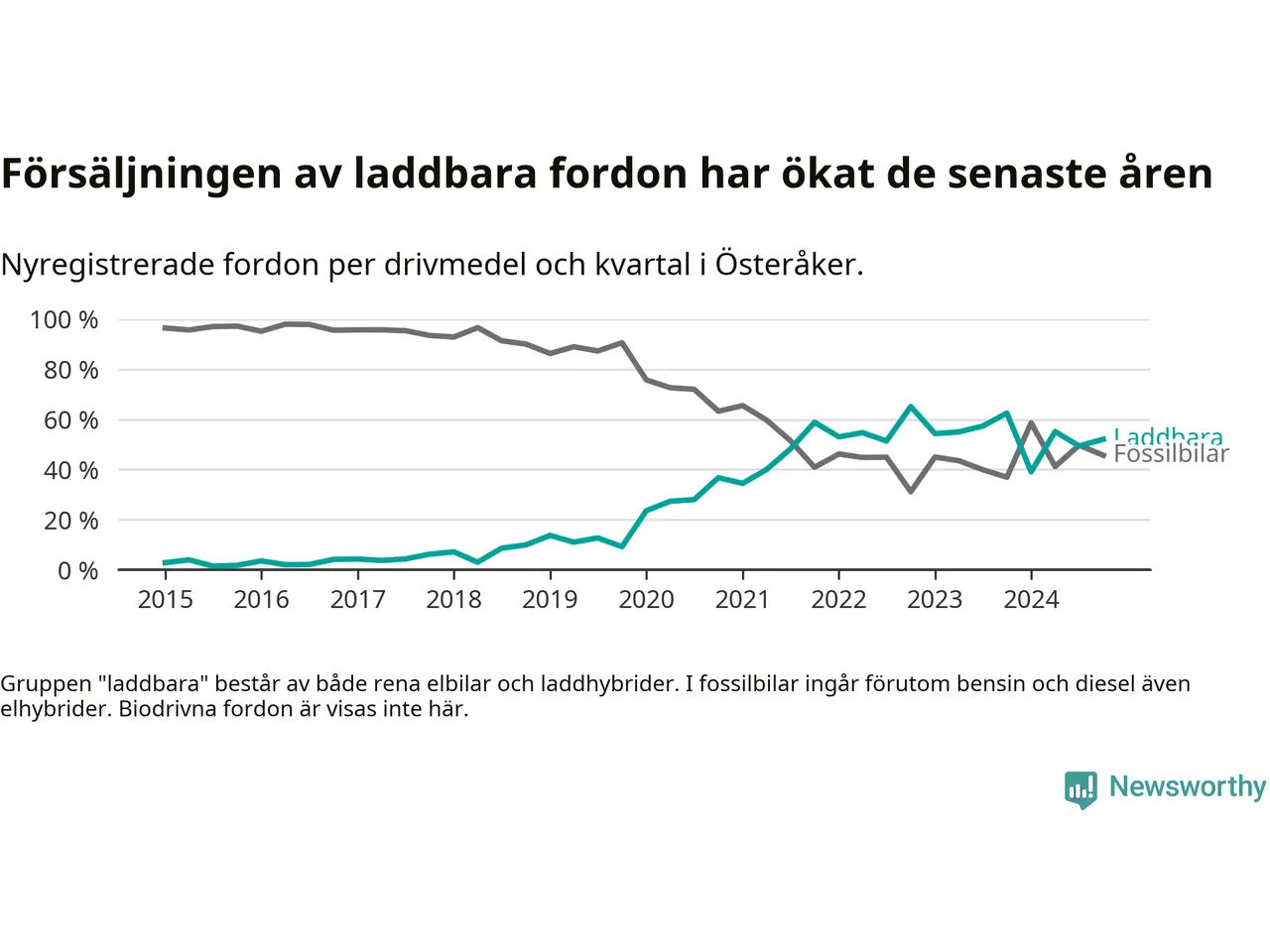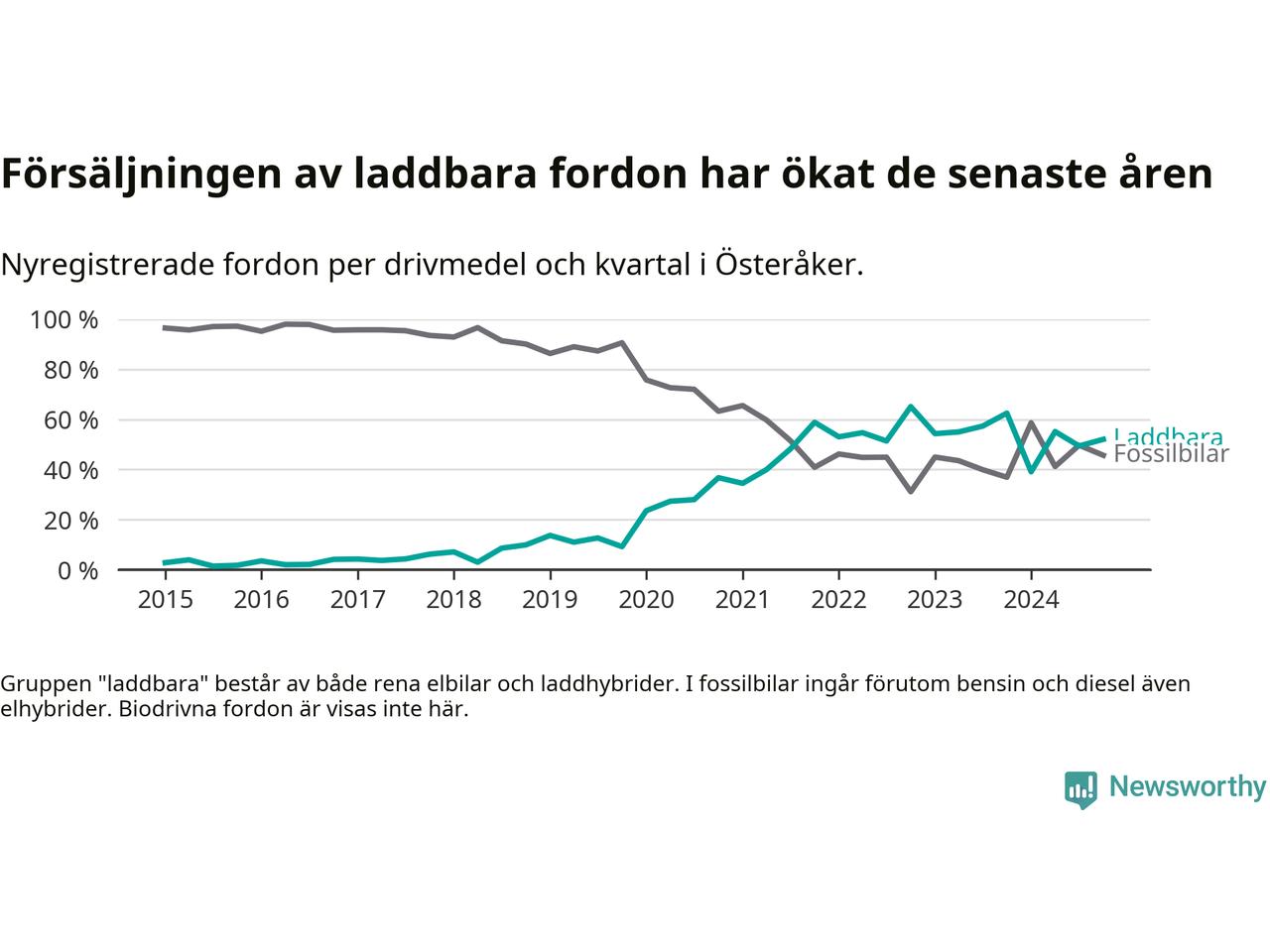 Under fjärde kvartalet 2024 var 52 procent av alla nyregistrerade personbilar i Österåker laddbara (sammanlagt registrerades 440 nya bilar). Merparten av de laddbara bilarna var rena elbilar (32 procent av alla).