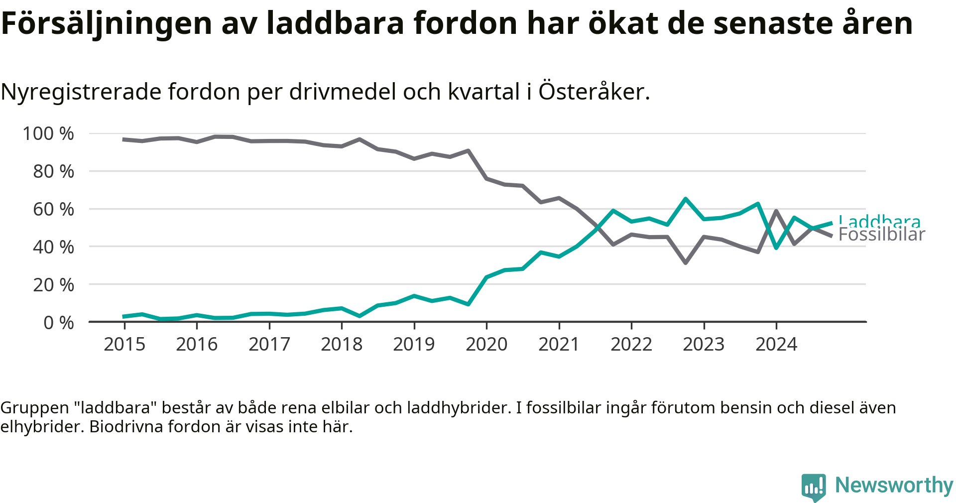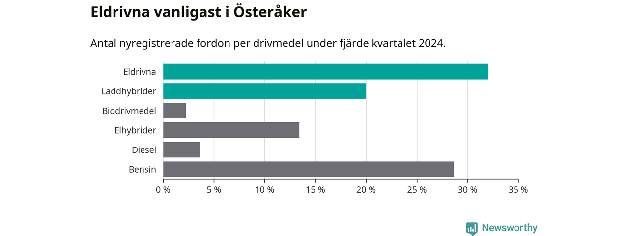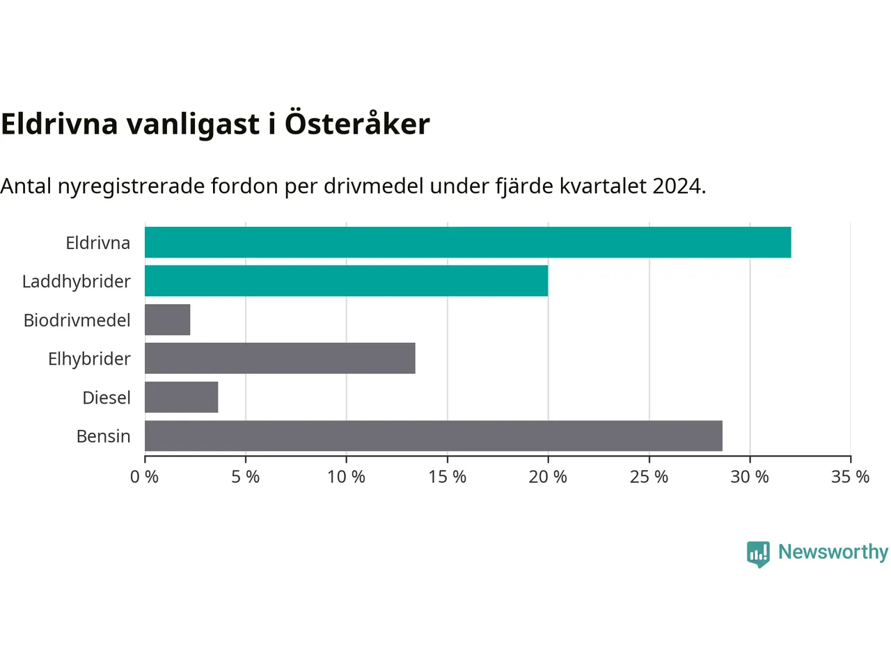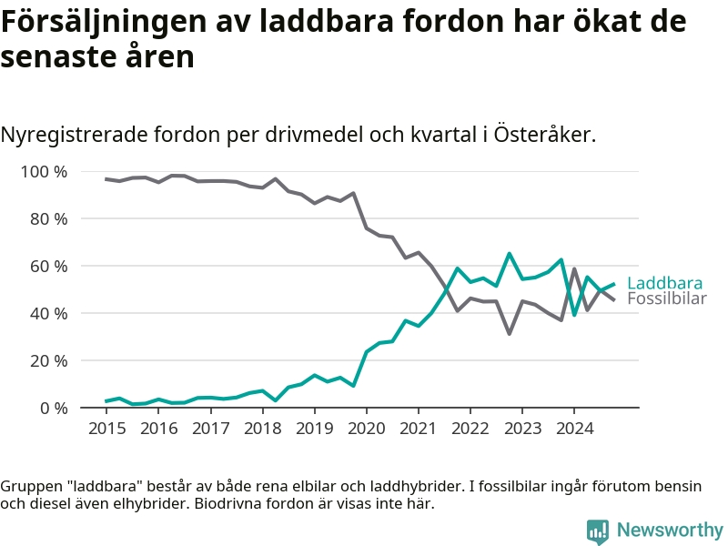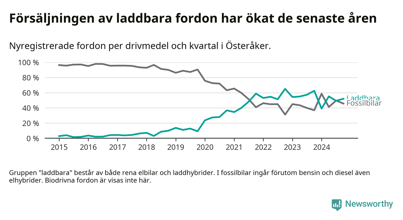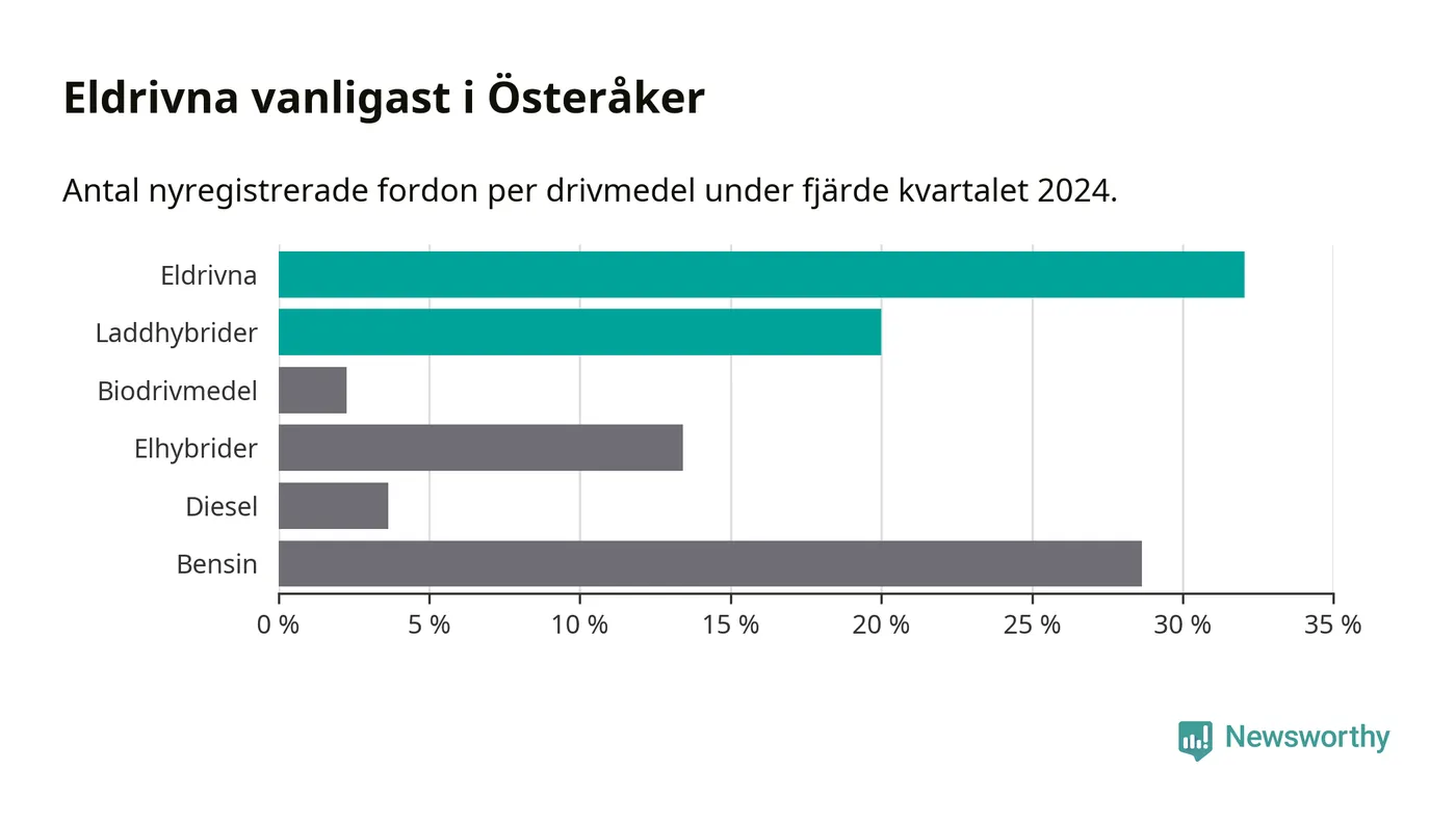 Under fjärde kvartalet 2024 var 52 procent av alla nyregistrerade personbilar i Österåker laddbara (sammanlagt registrerades 440 nya bilar). Merparten av de laddbara bilarna var rena elbilar (32 procent av alla).