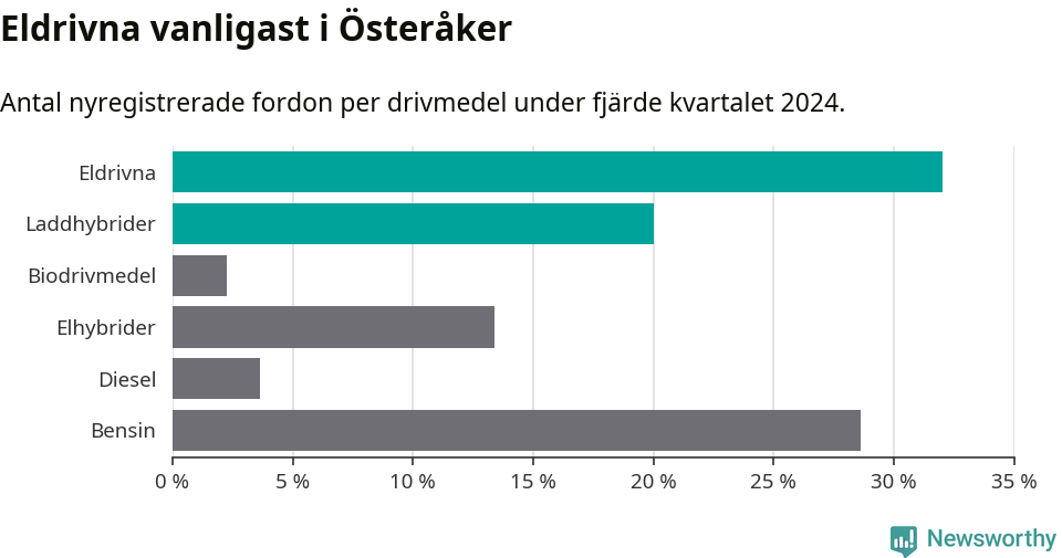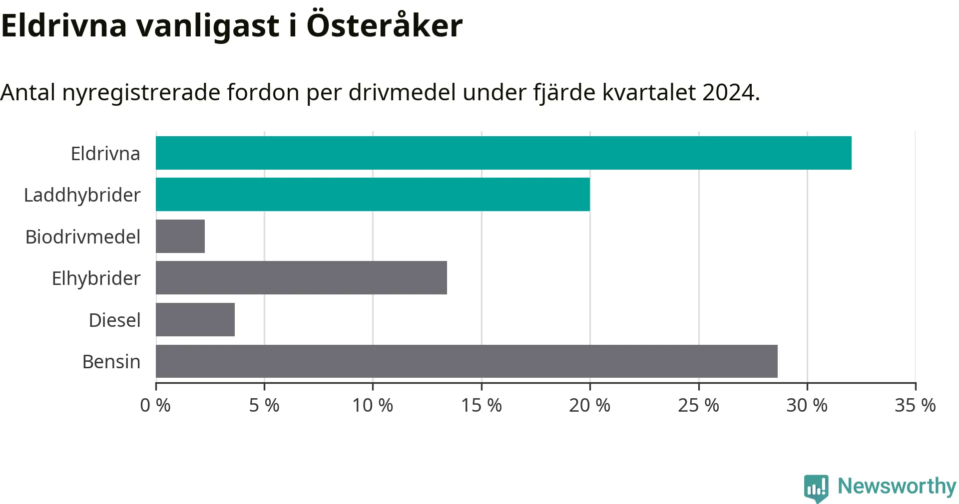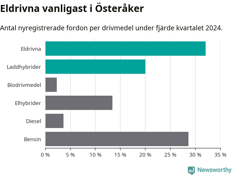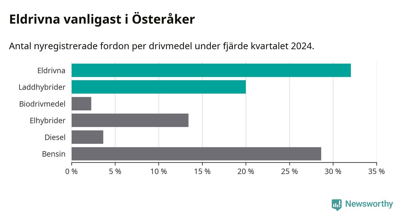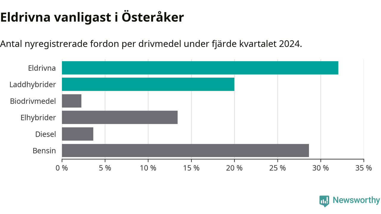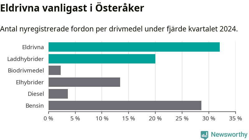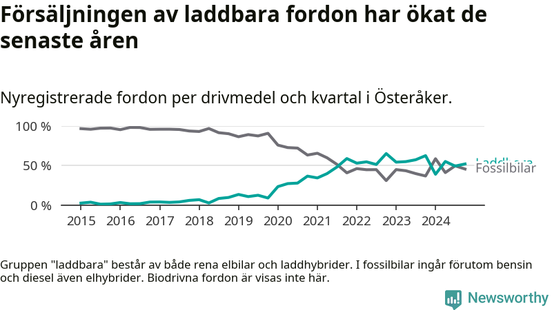 Under fjärde kvartalet 2024 var 52 procent av alla nyregistrerade personbilar i Österåker laddbara (sammanlagt registrerades 440 nya bilar). Merparten av de laddbara bilarna var rena elbilar (32 procent av alla).