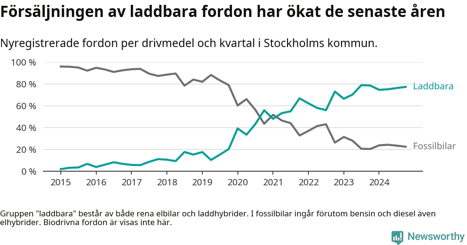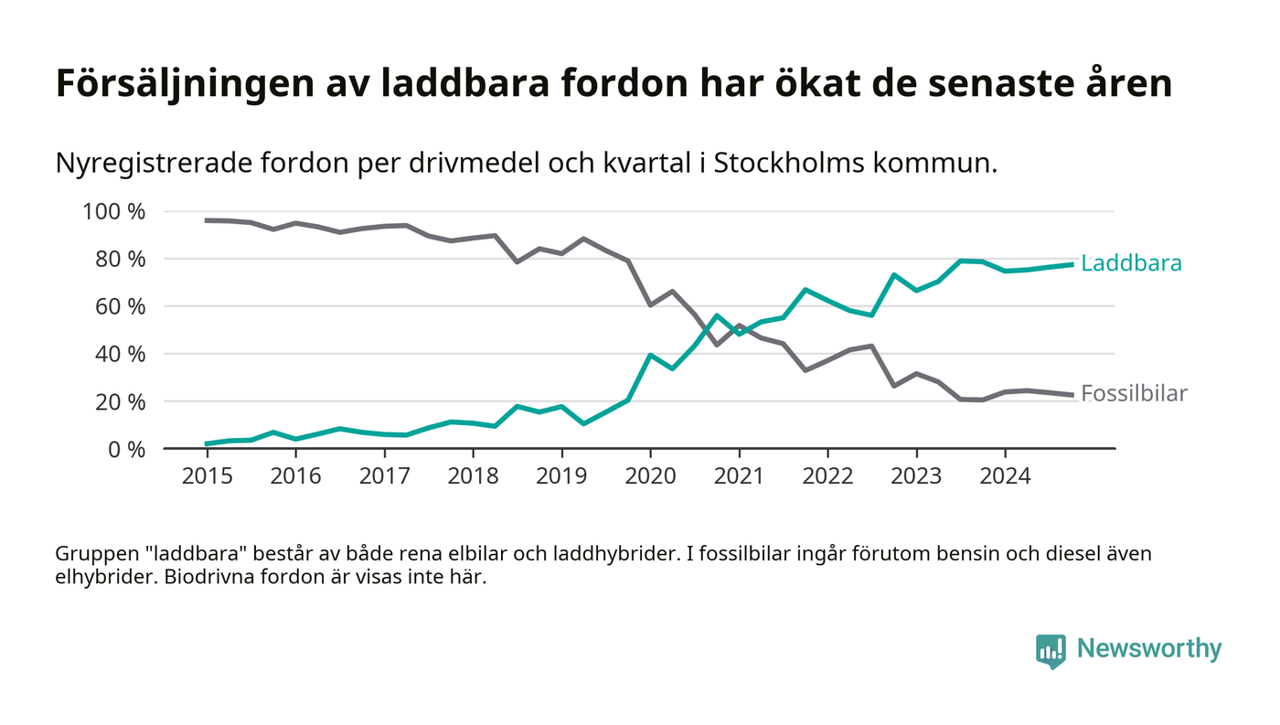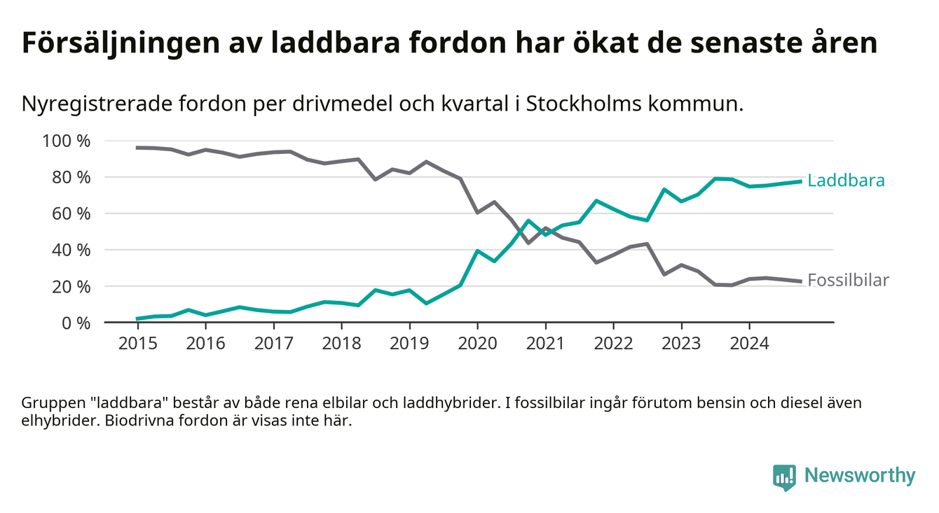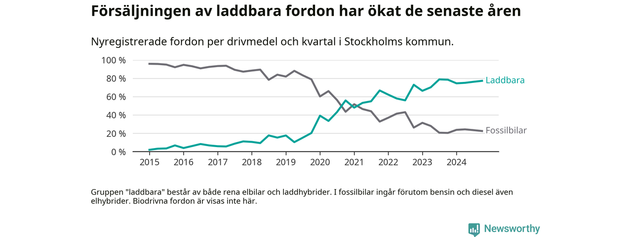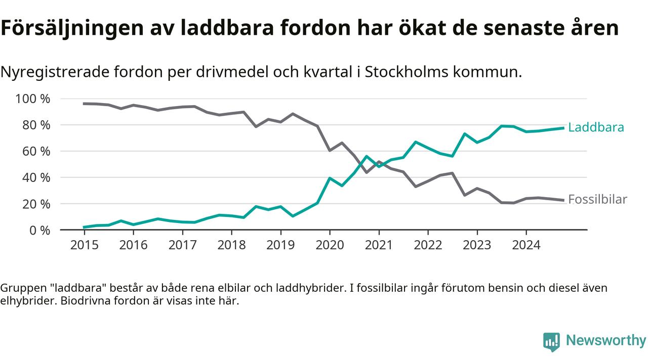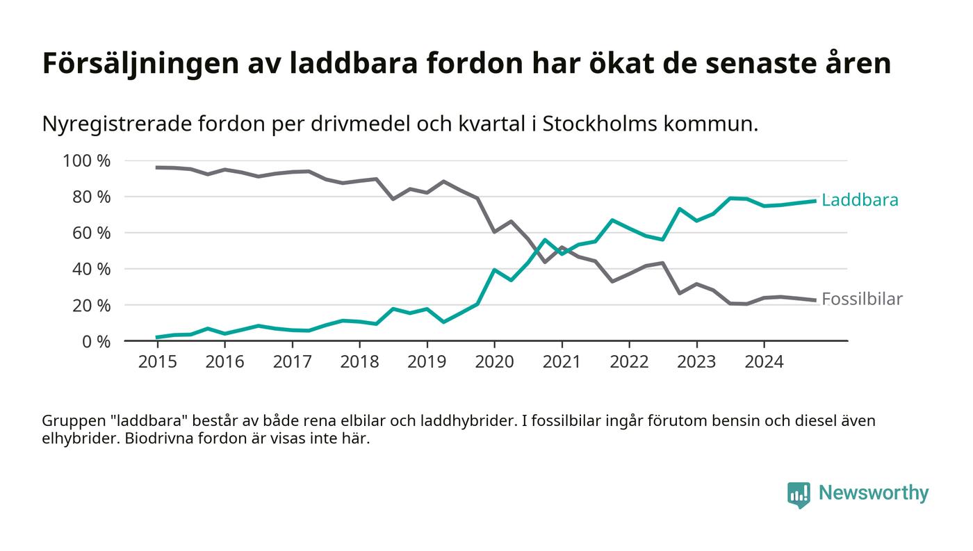 Under fjärde kvartalet 2024 var 77 procent av alla nyregistrerade personbilar i Stockholms kommun laddbara (sammanlagt registrerades 16 176 nya bilar). Merparten av de laddbara bilarna var rena elbilar (47 procent av alla).