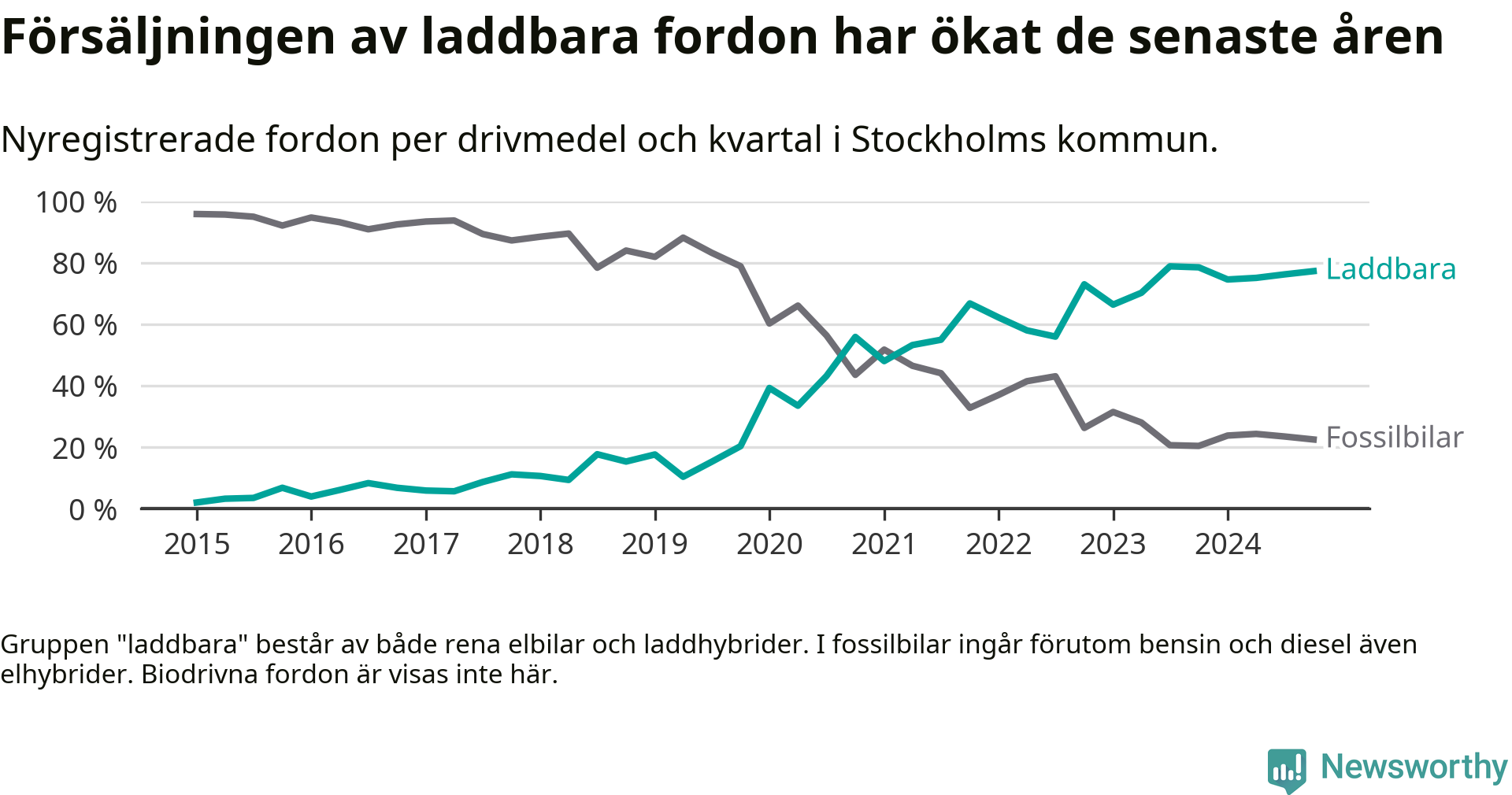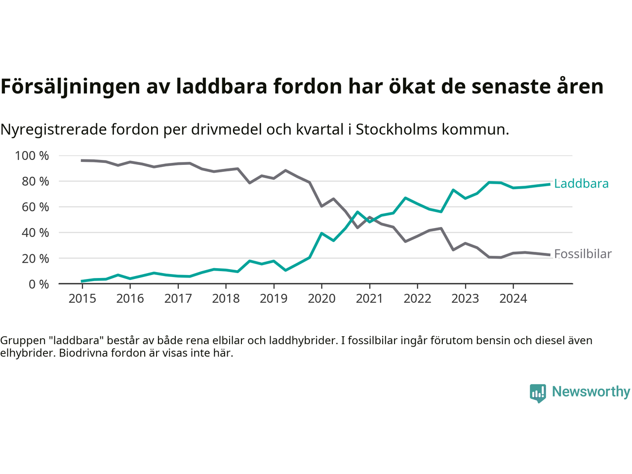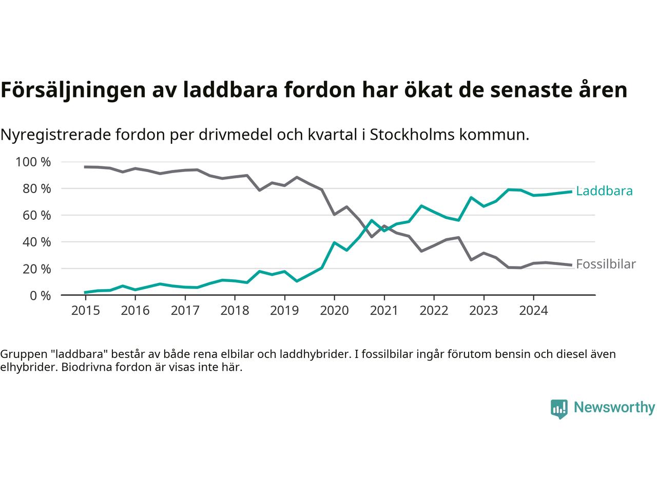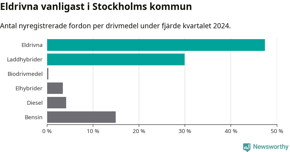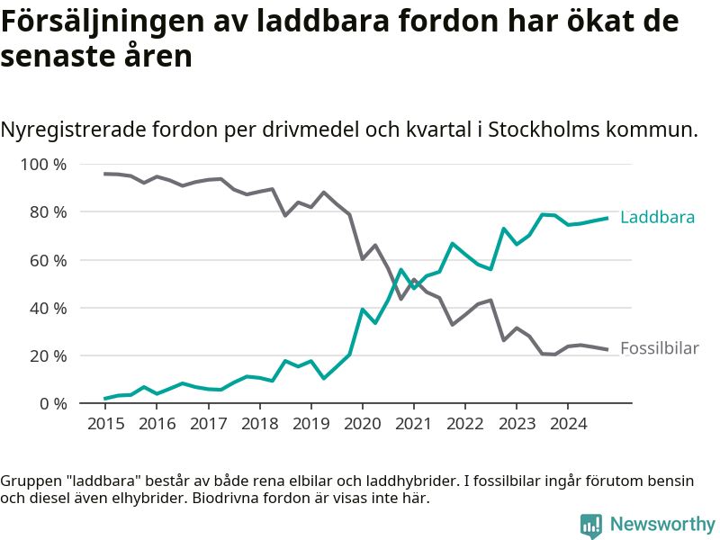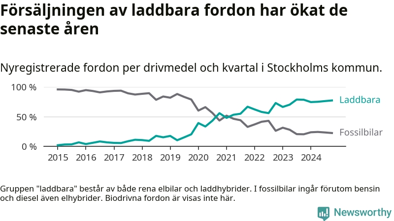 Under fjärde kvartalet 2024 var 77 procent av alla nyregistrerade personbilar i Stockholms kommun laddbara (sammanlagt registrerades 16 176 nya bilar). Merparten av de laddbara bilarna var rena elbilar (47 procent av alla).