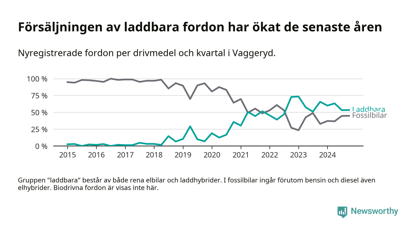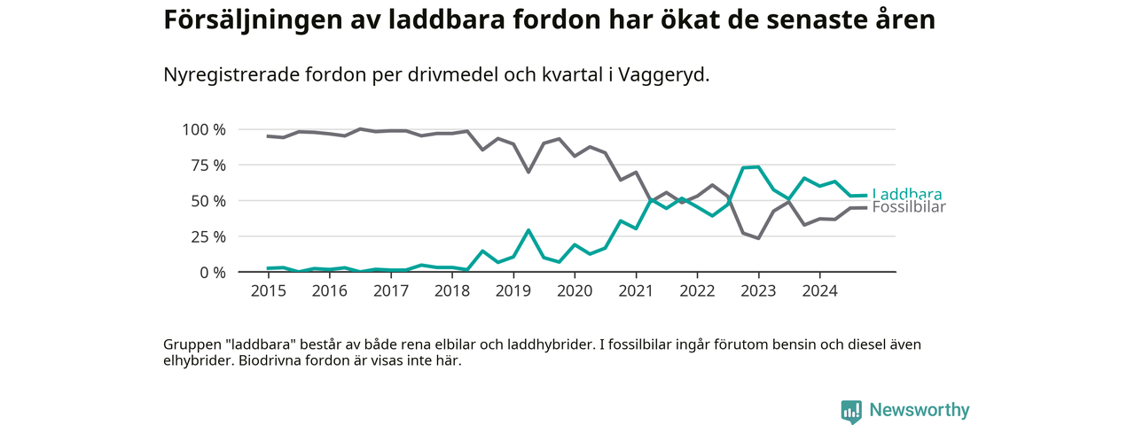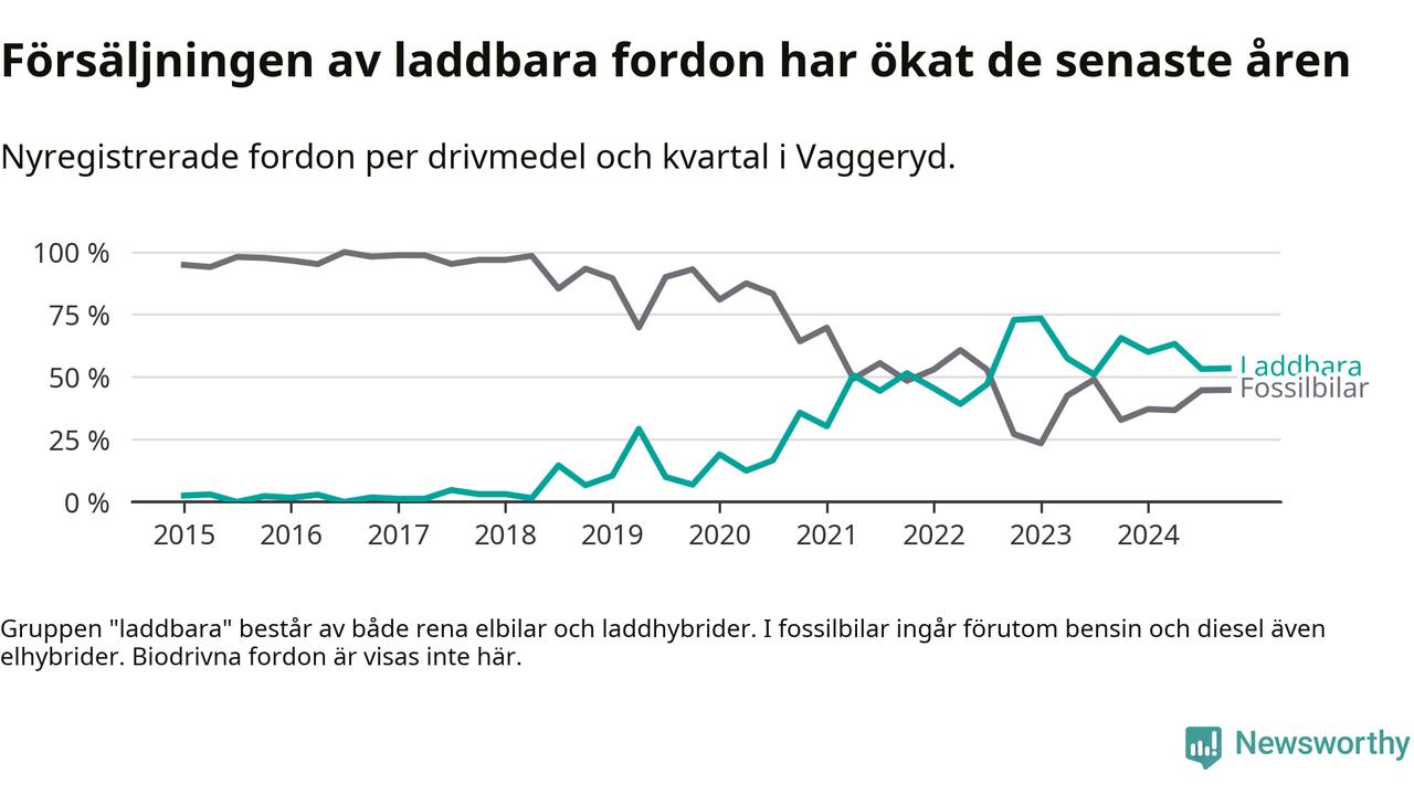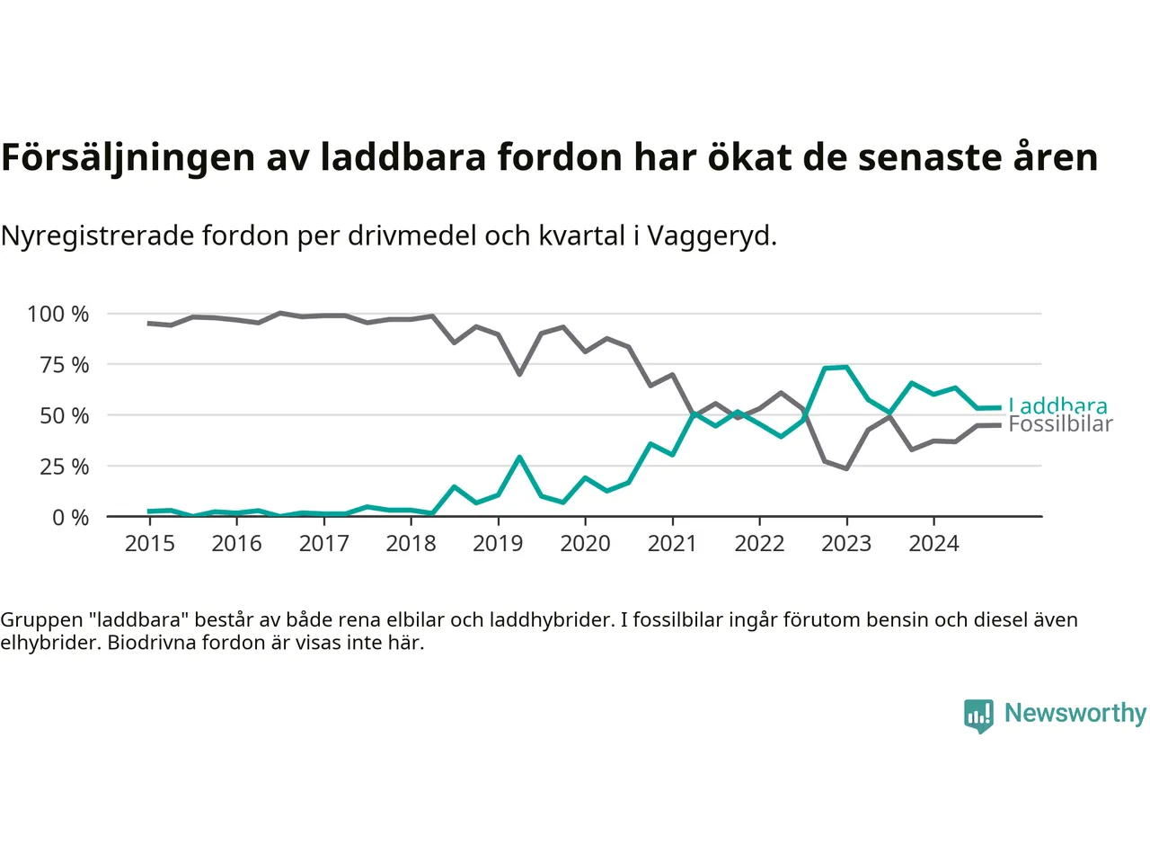 Under fjärde kvartalet 2024 var 53 procent av alla nyregistrerade personbilar i Vaggeryd laddbara (sammanlagt registrerades 58 nya bilar). Merparten av de laddbara bilarna var rena elbilar (38 procent av alla).