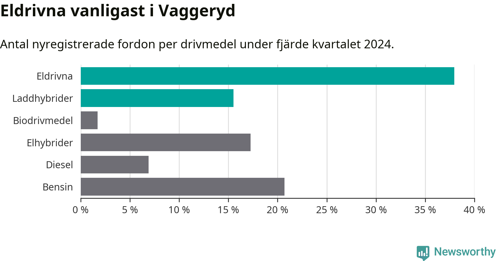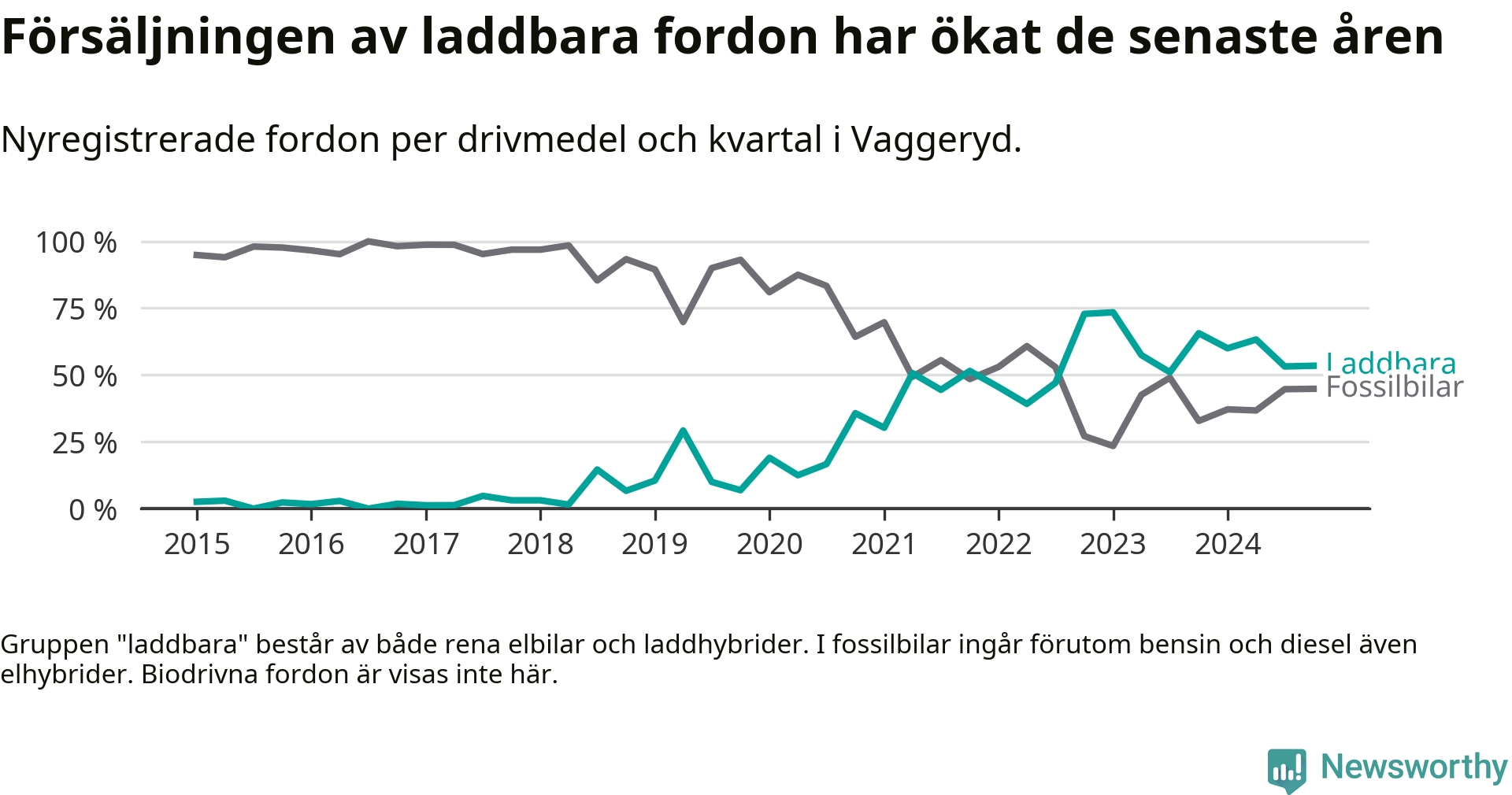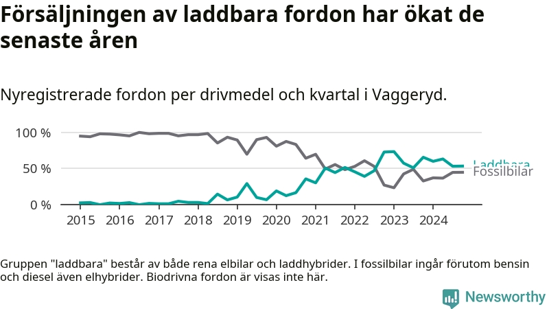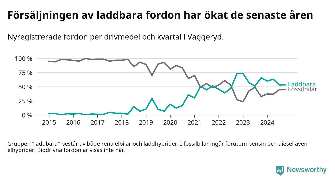 Under fjärde kvartalet 2024 var 53 procent av alla nyregistrerade personbilar i Vaggeryd laddbara (sammanlagt registrerades 58 nya bilar). Merparten av de laddbara bilarna var rena elbilar (38 procent av alla).