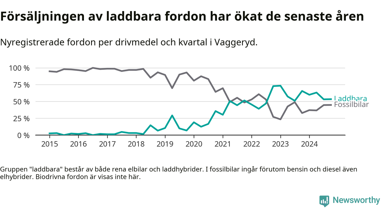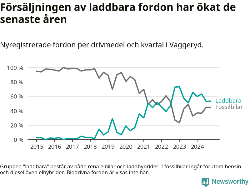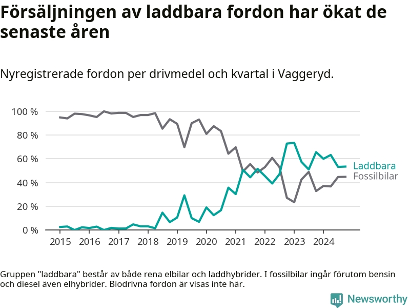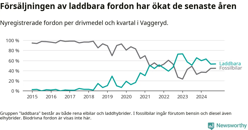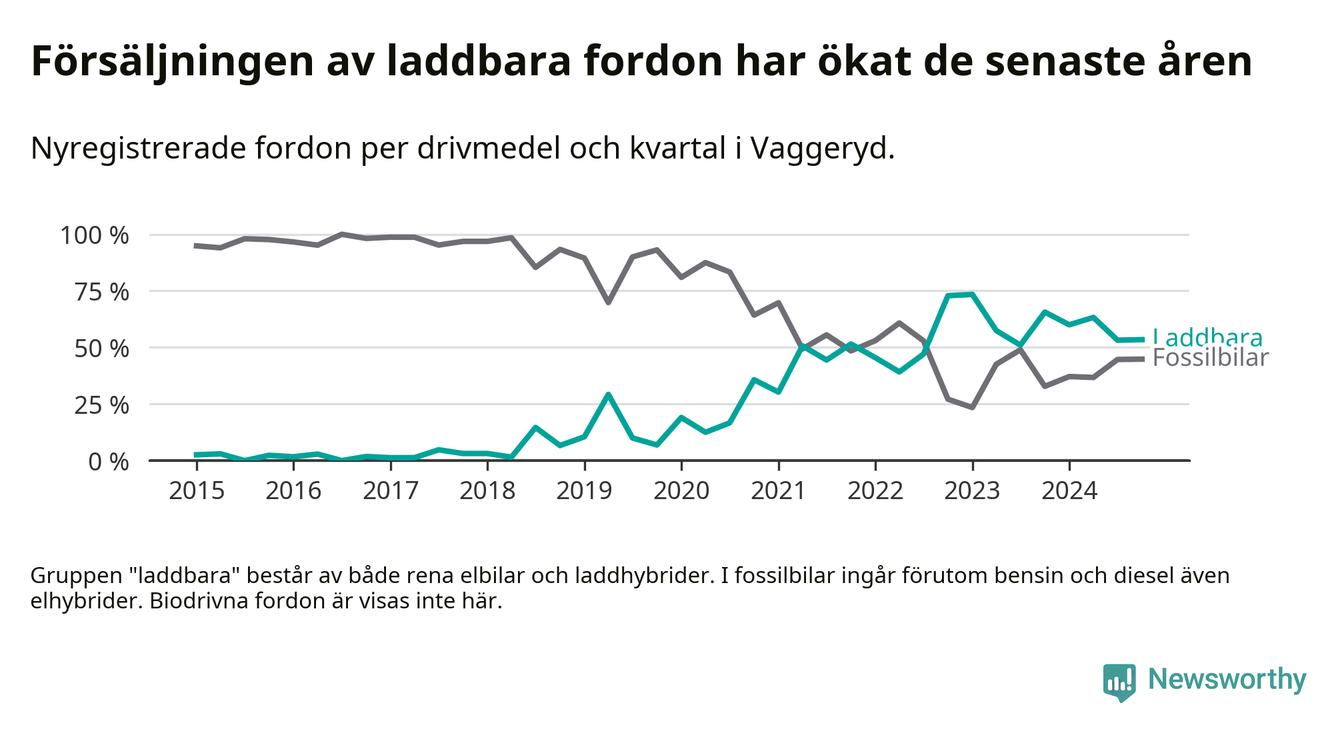 I Vaggeryd ökade andelen laddbara bilar under fjärde kvartalet jämfört med kvartalet innan. Nyregistreringen peakade under första kvartalet 2023 då 73 procent av de nya bilarna var laddbara.