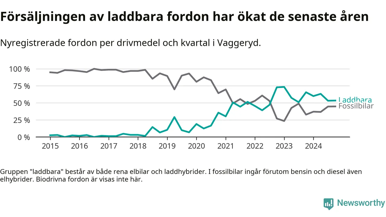 Under fjärde kvartalet var hälften av alla nyregistrerade bilar i Vaggeryds kommun rena elbilar eller laddhybrider, en ökning jämfört med kvartalet innan. I riket vände elbilskurvorna också upp något i slutet av året – men utsläppen ökar.