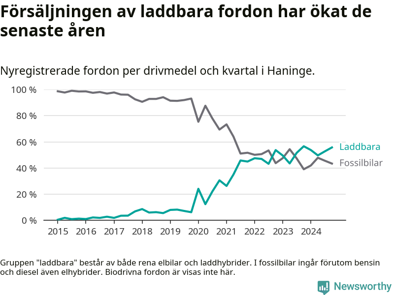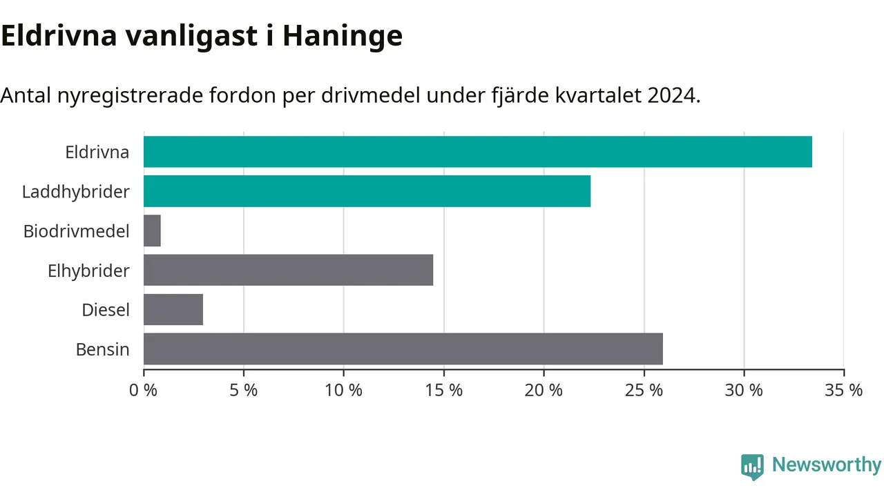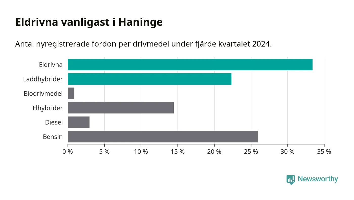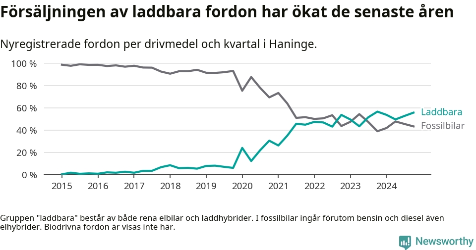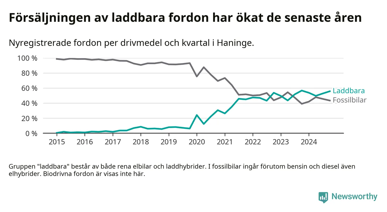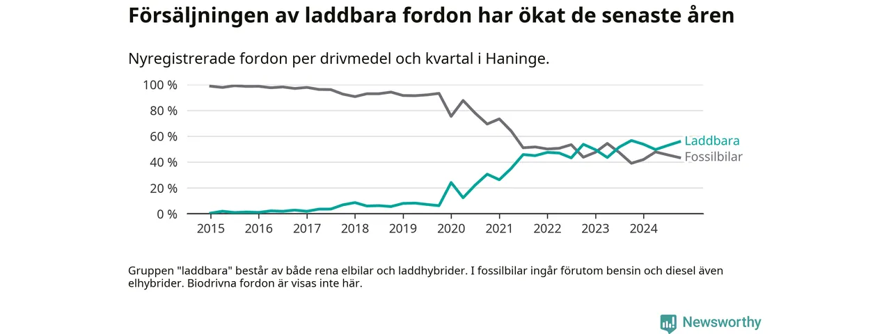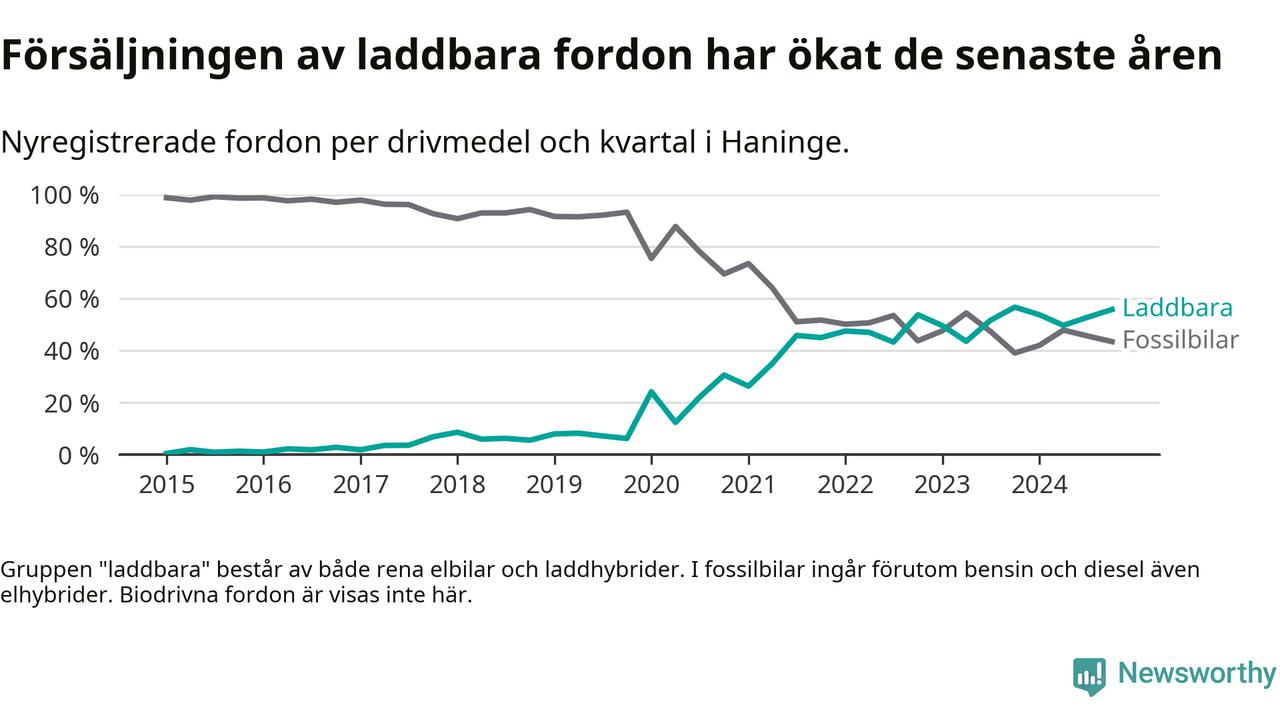Under fjärde kvartalet 2024 var 56 procent av alla nyregistrerade personbilar i Haninge laddbara (sammanlagt registrerades 470 nya bilar). Merparten av de laddbara bilarna var rena elbilar (33 procent av alla).