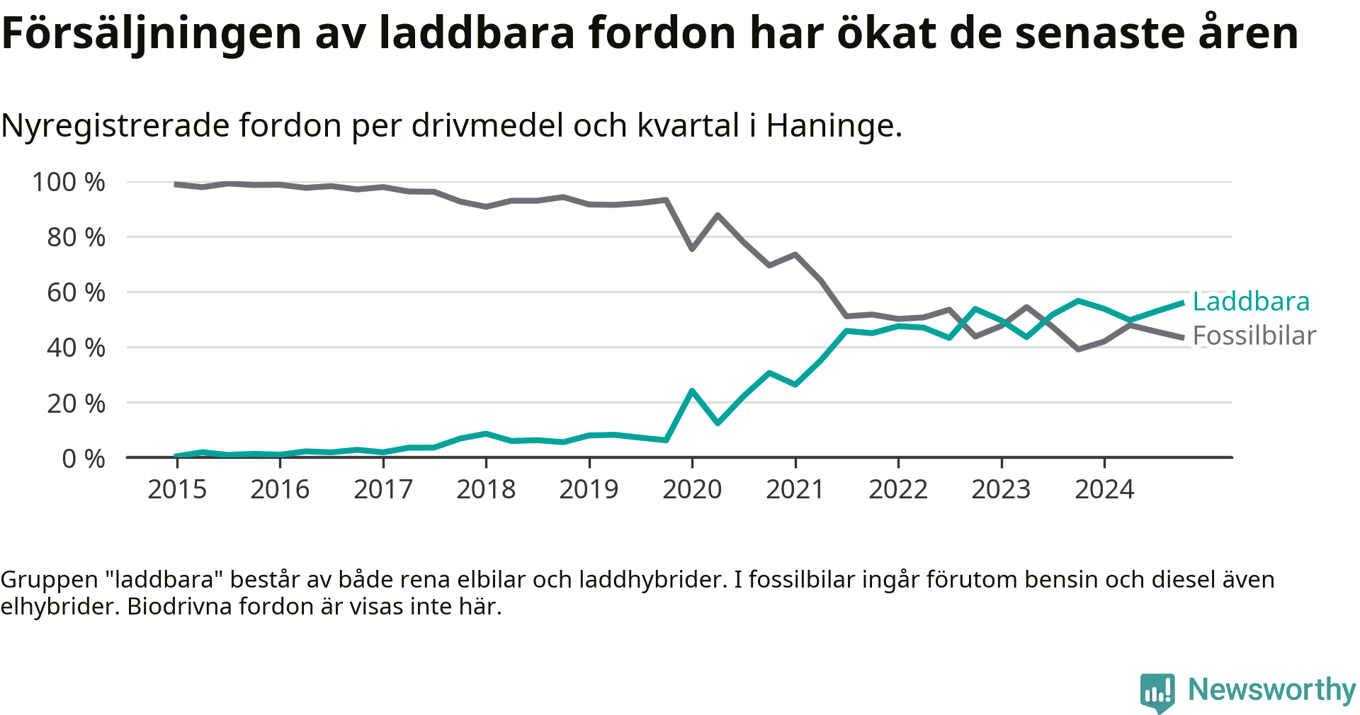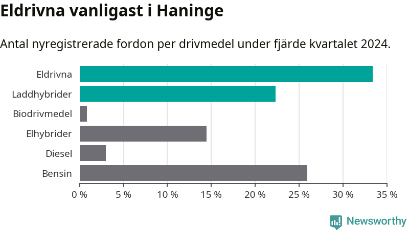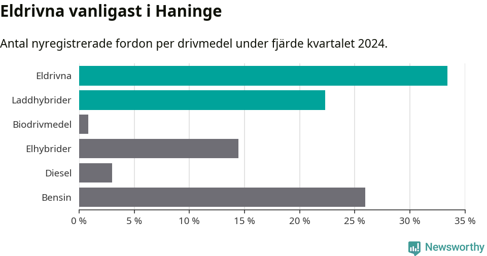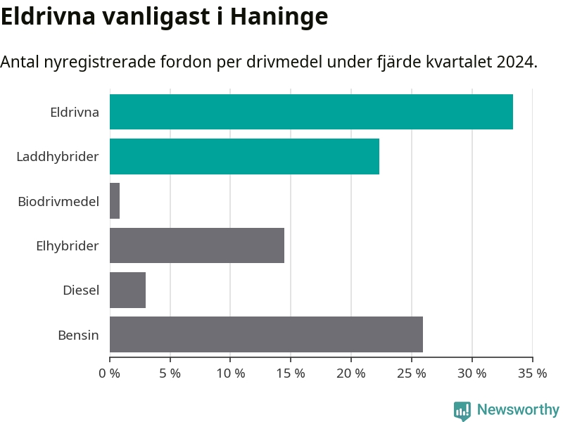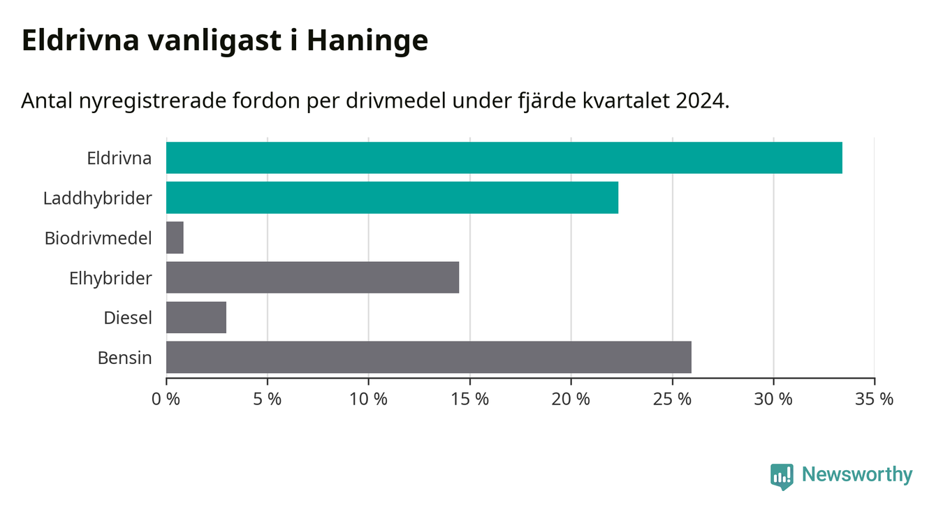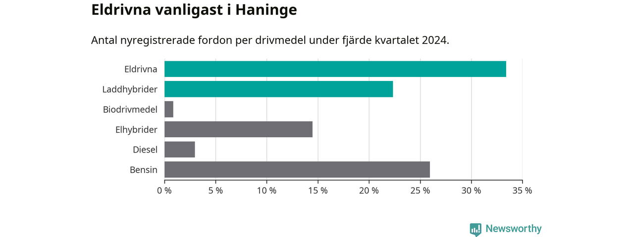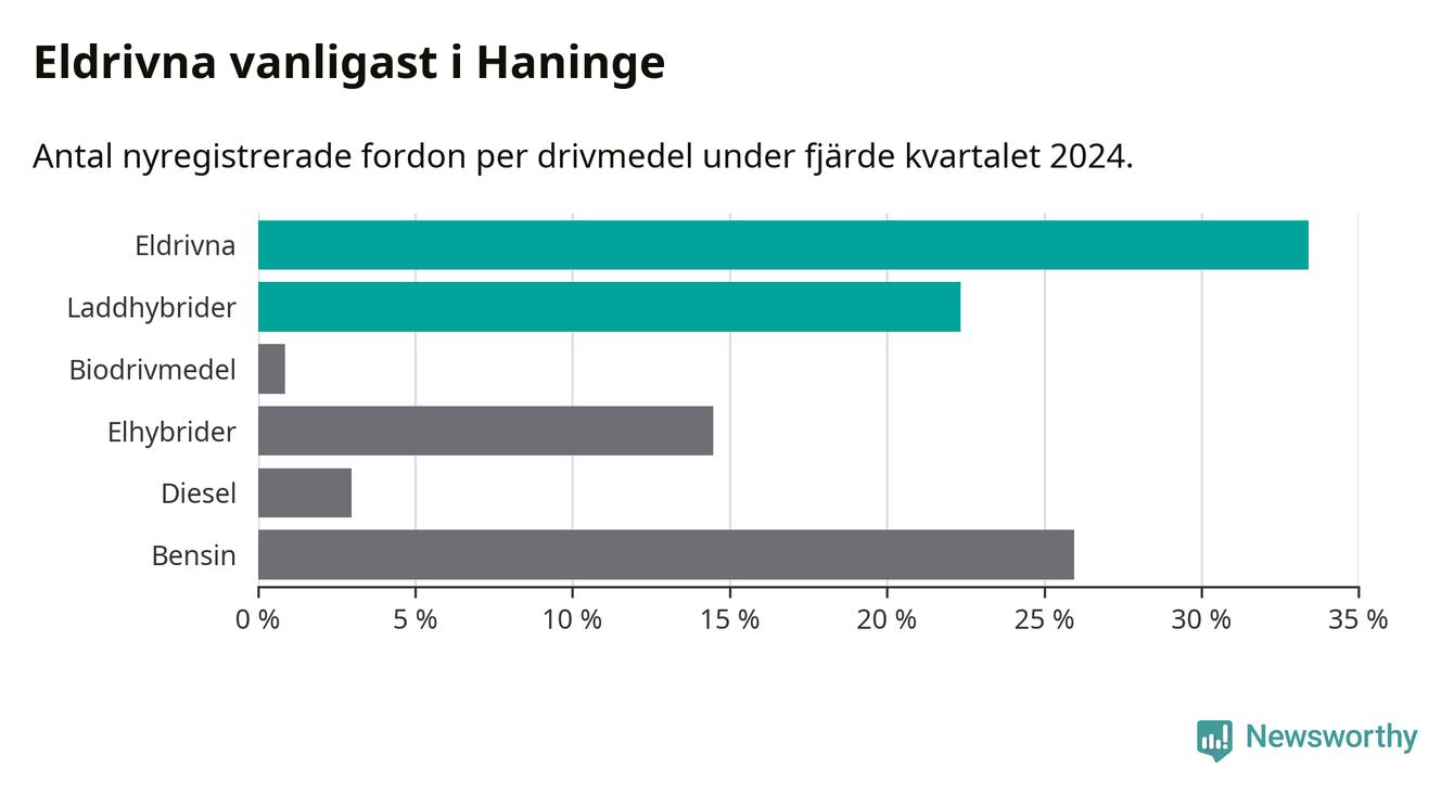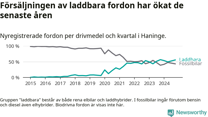 Under fjärde kvartalet 2024 var 56 procent av alla nyregistrerade personbilar i Haninge laddbara (sammanlagt registrerades 470 nya bilar). Merparten av de laddbara bilarna var rena elbilar (33 procent av alla).