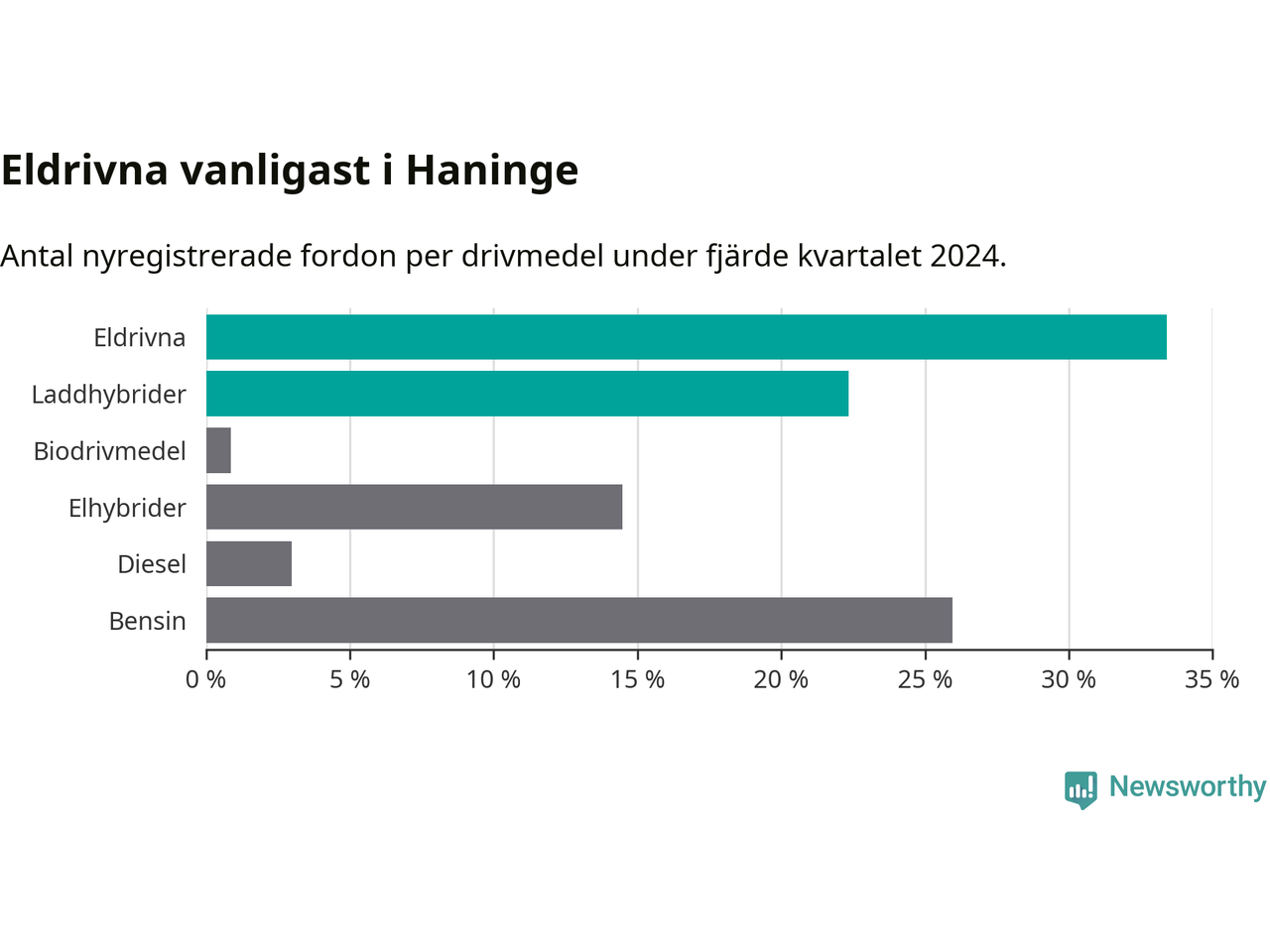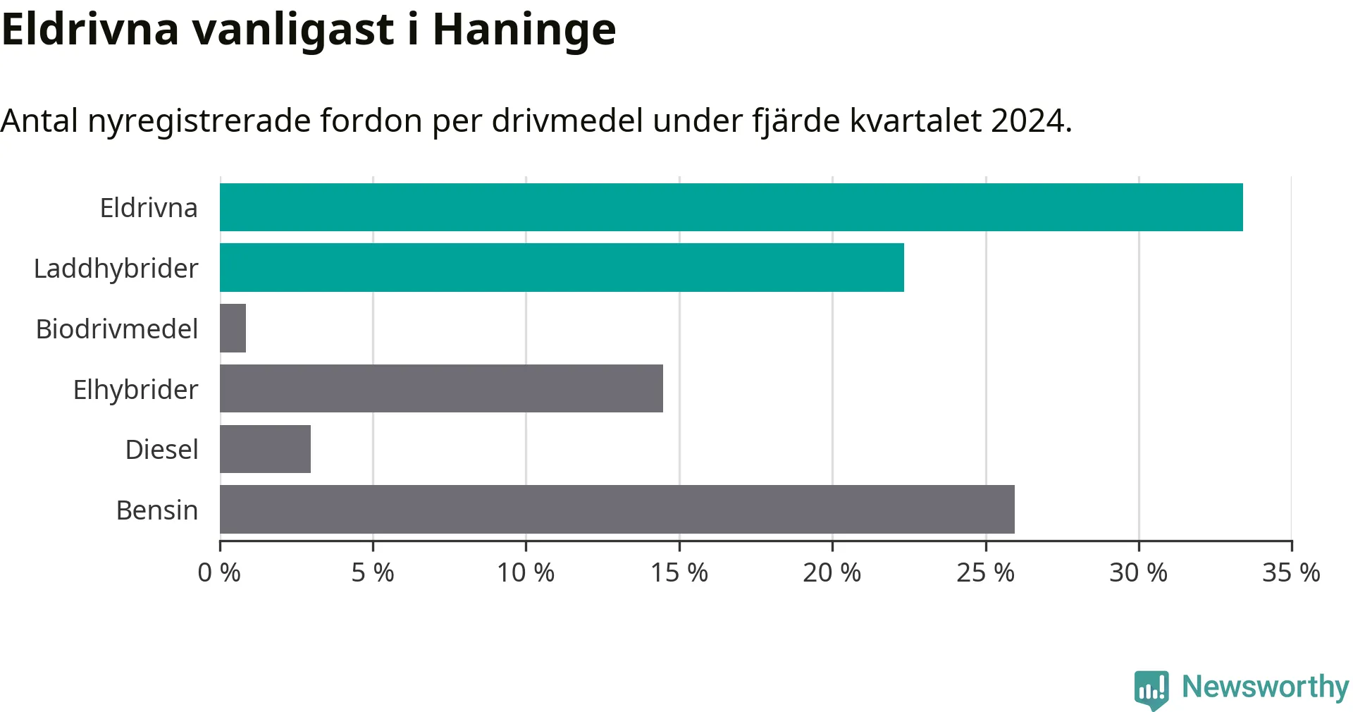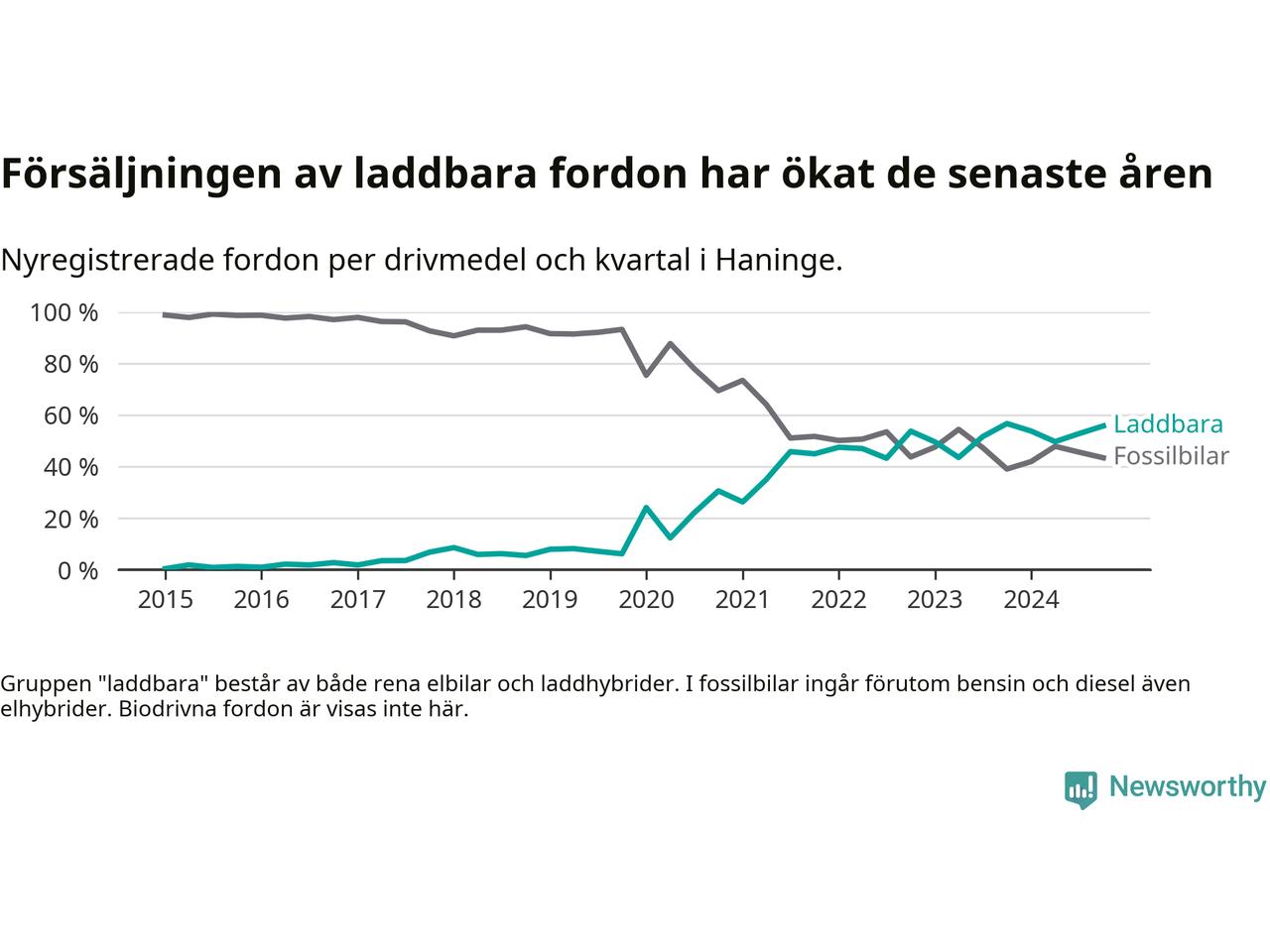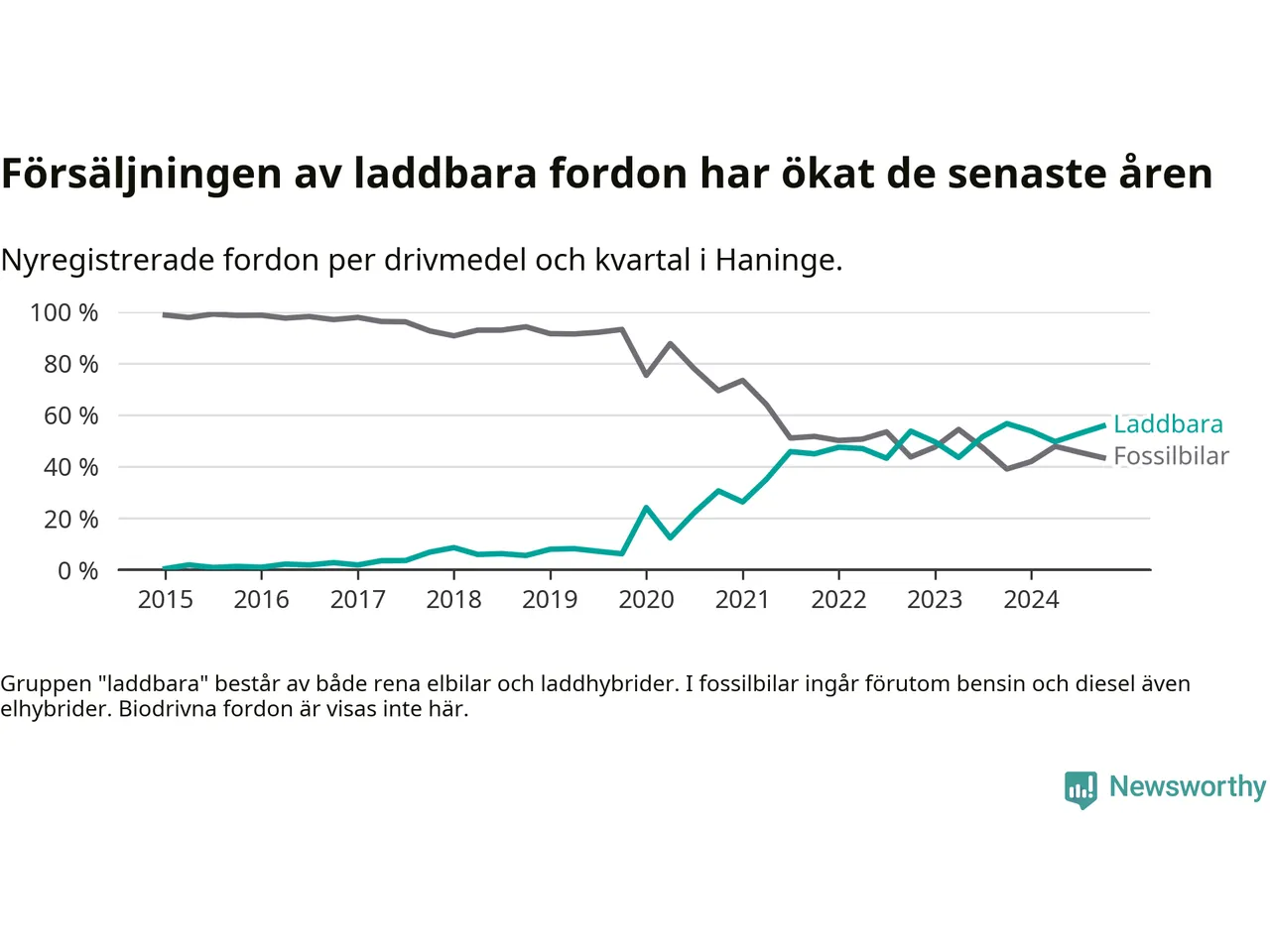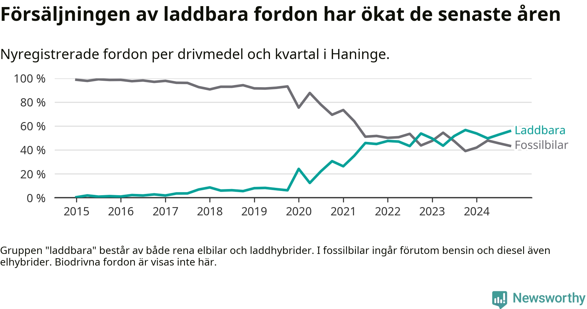 Under fjärde kvartalet 2024 var 56 procent av alla nyregistrerade personbilar i Haninge laddbara (sammanlagt registrerades 470 nya bilar). Merparten av de laddbara bilarna var rena elbilar (33 procent av alla).