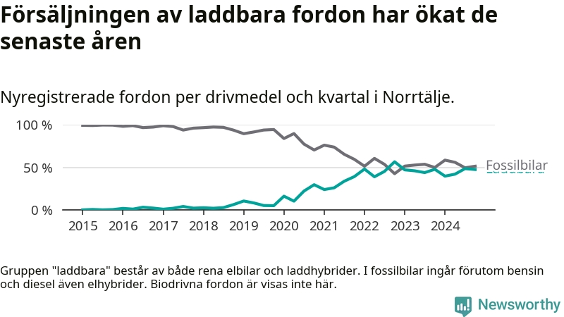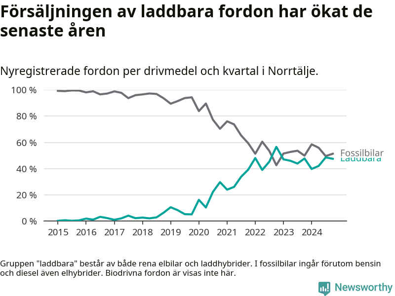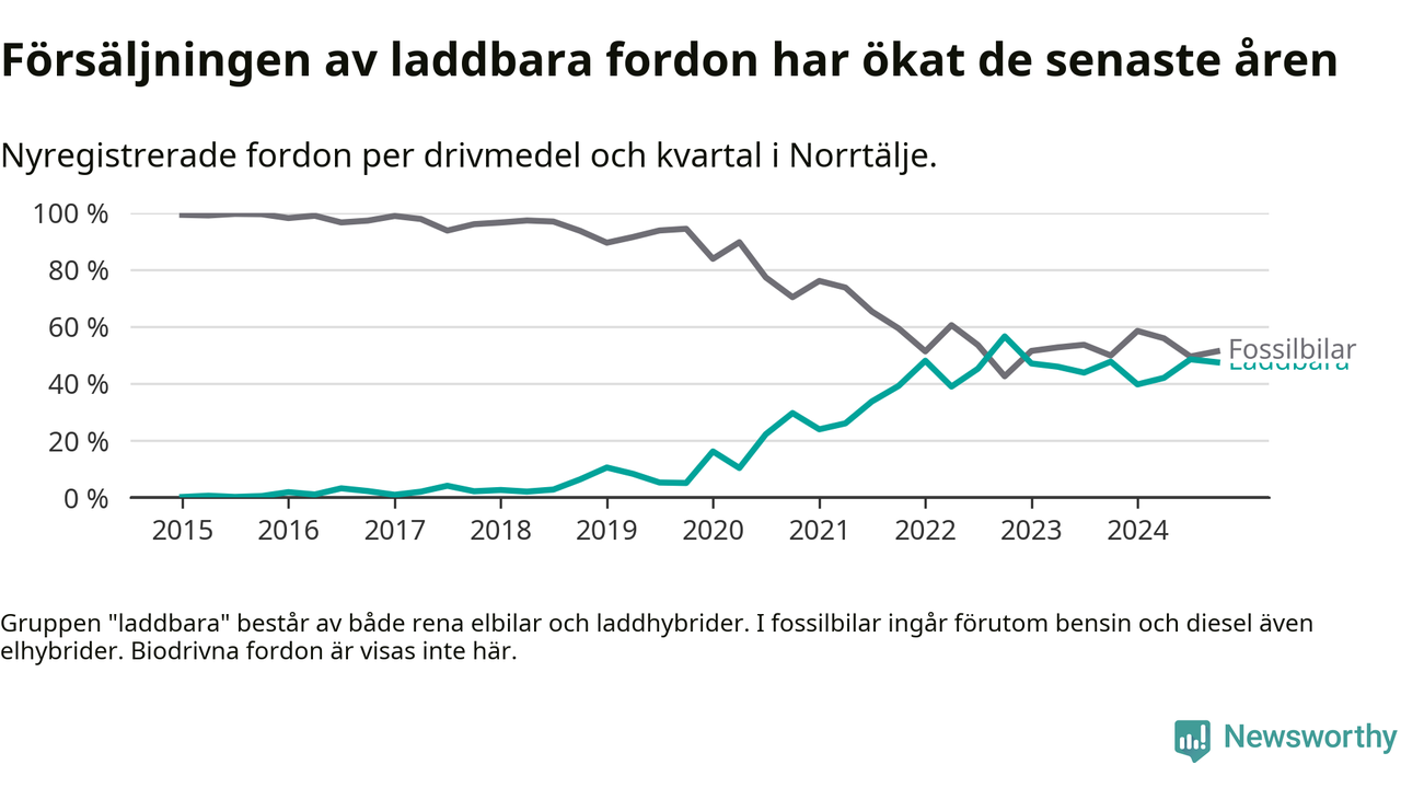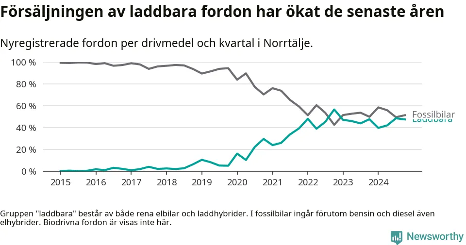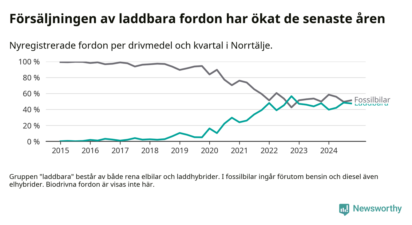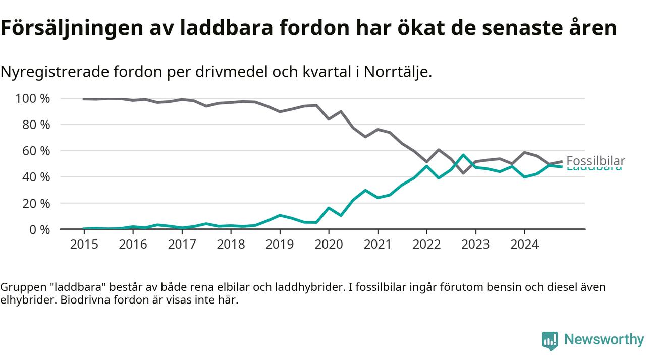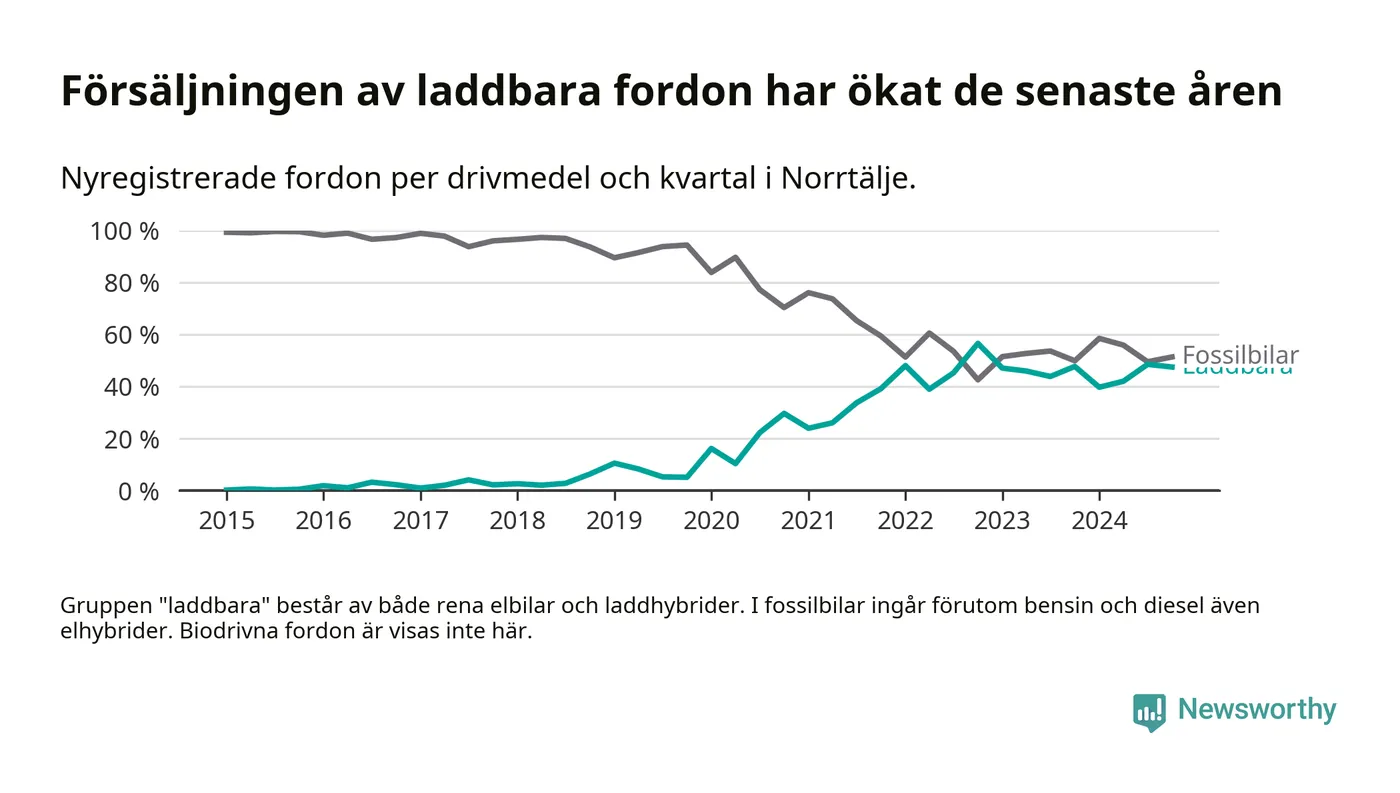 Under fjärde kvartalet 2024 var 47 procent av alla nyregistrerade personbilar i Norrtälje laddbara (sammanlagt registrerades 337 nya bilar). Merparten av de laddbara bilarna var rena elbilar (33 procent av alla).