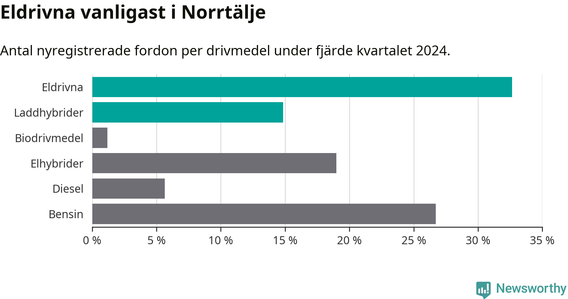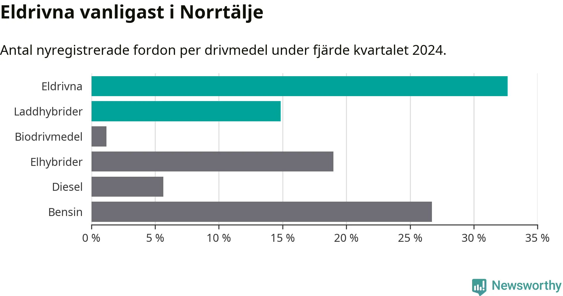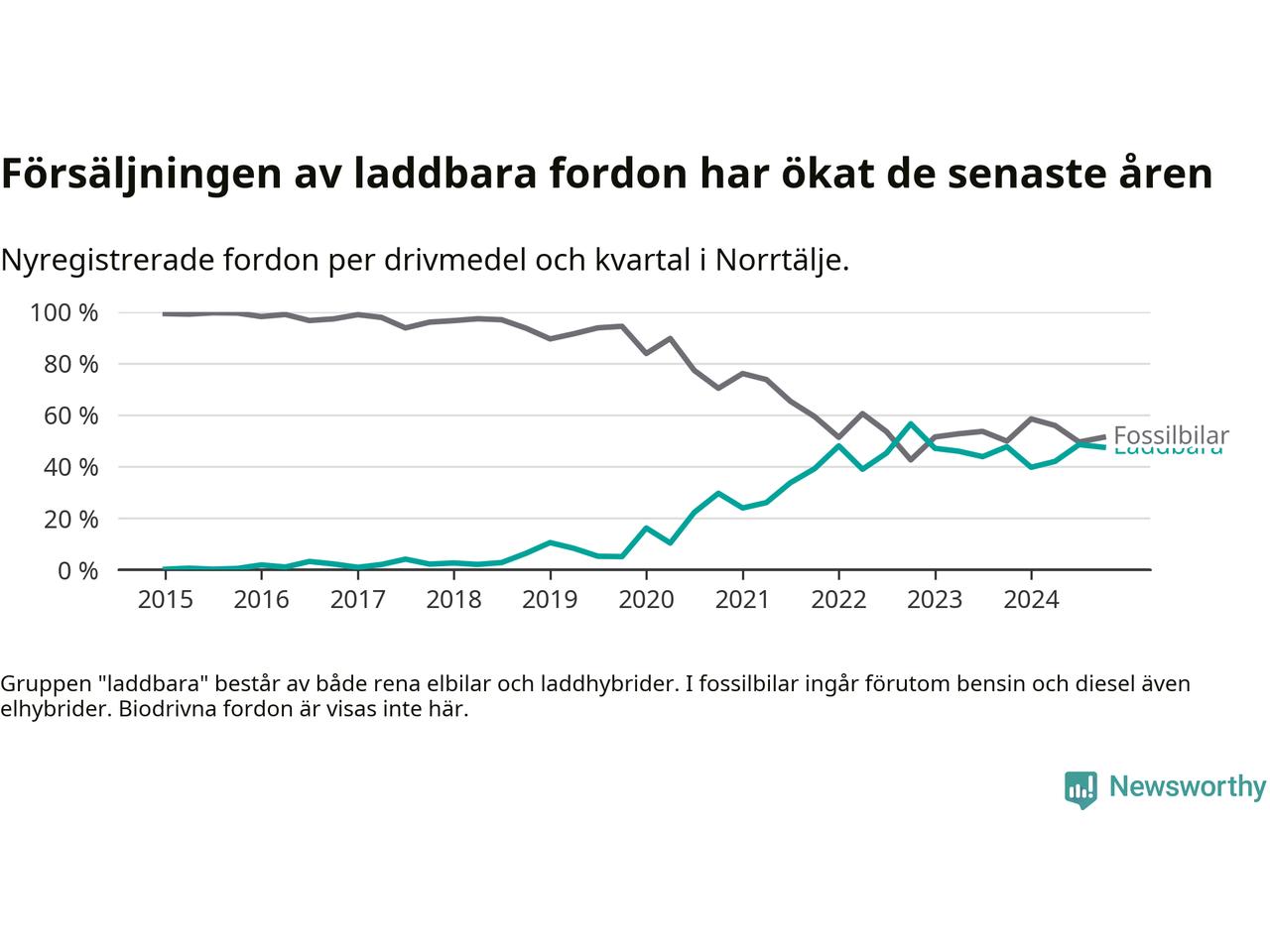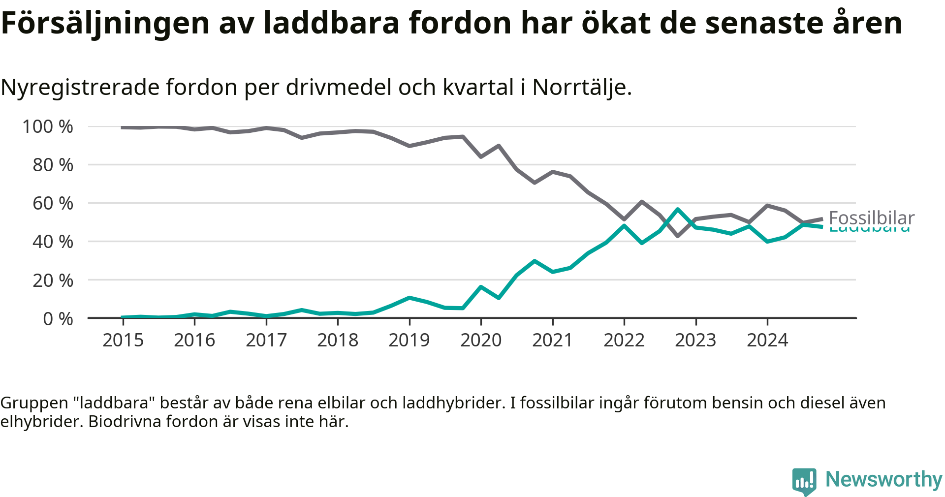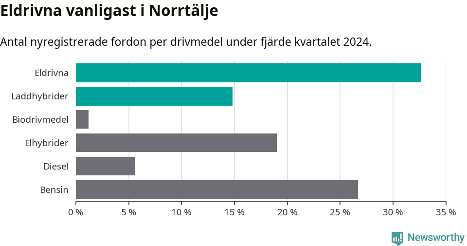 Under fjärde kvartalet 2024 var 47 procent av alla nyregistrerade personbilar i Norrtälje laddbara (sammanlagt registrerades 337 nya bilar). Merparten av de laddbara bilarna var rena elbilar (33 procent av alla).