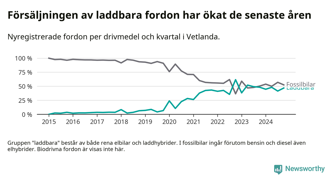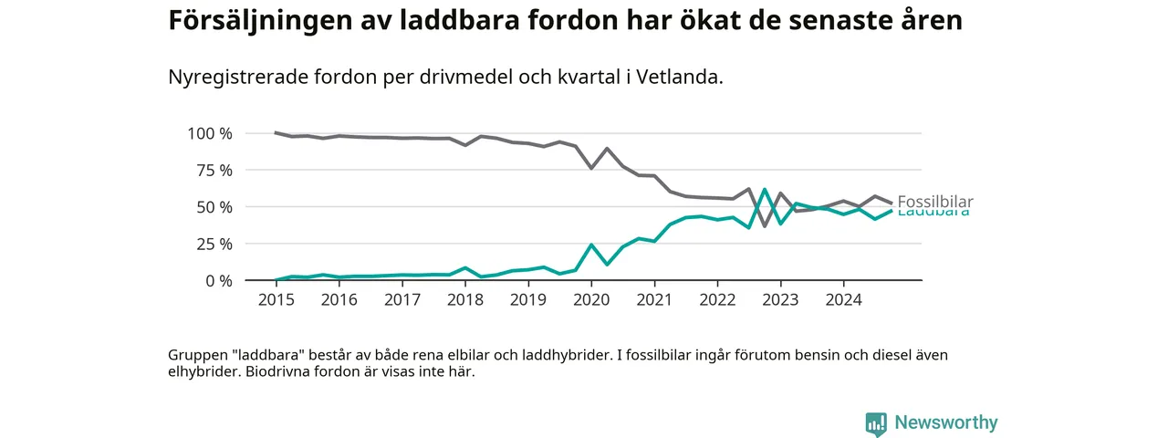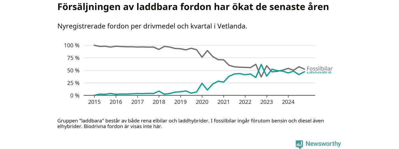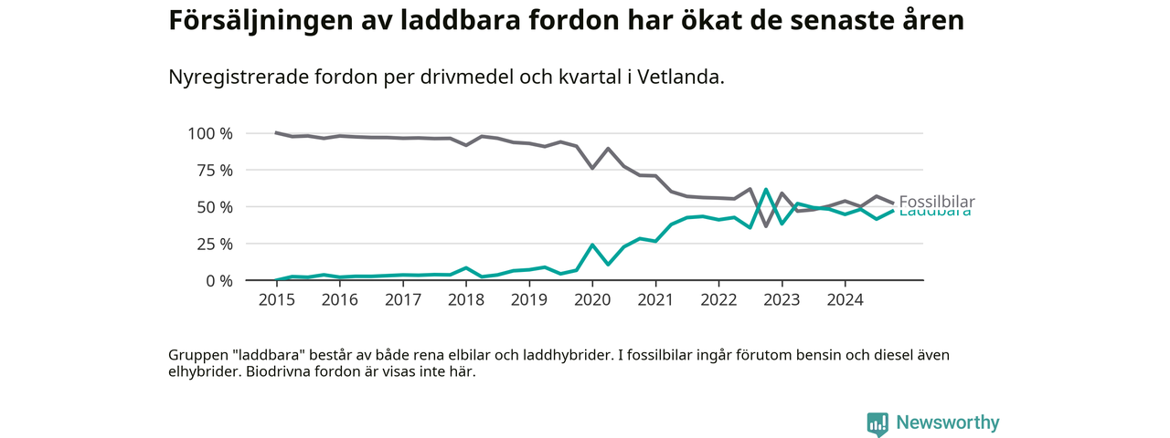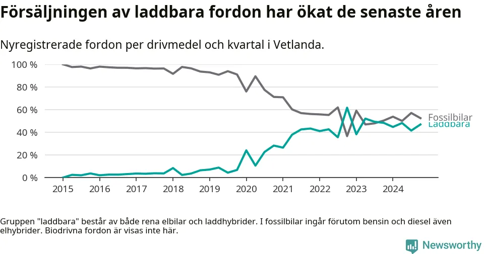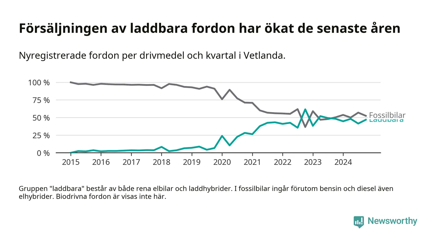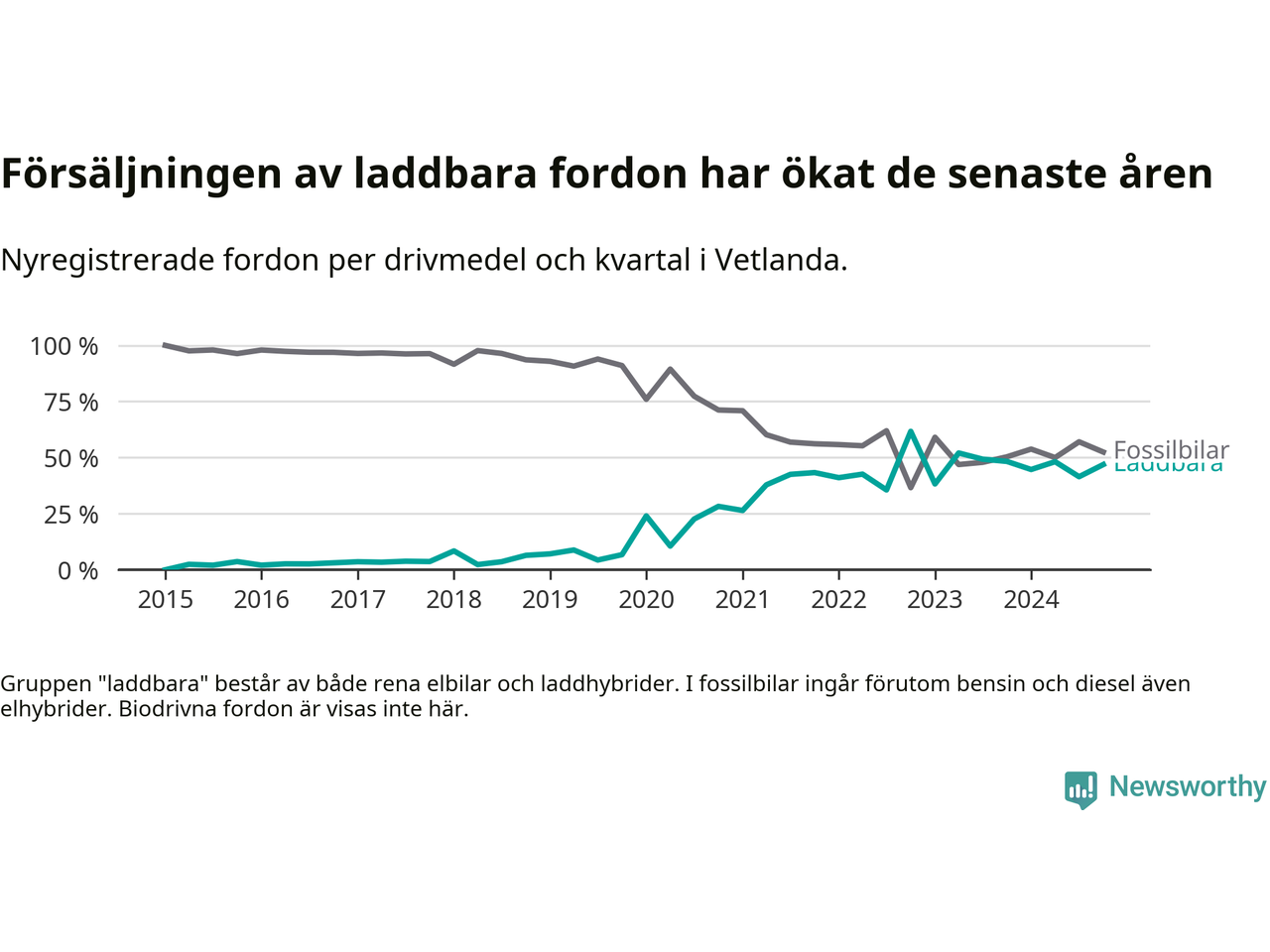 Under fjärde kvartalet 2024 var 47 procent av alla nyregistrerade personbilar i Vetlanda laddbara (sammanlagt registrerades 162 nya bilar). Merparten av de laddbara bilarna var rena elbilar (26 procent av alla).