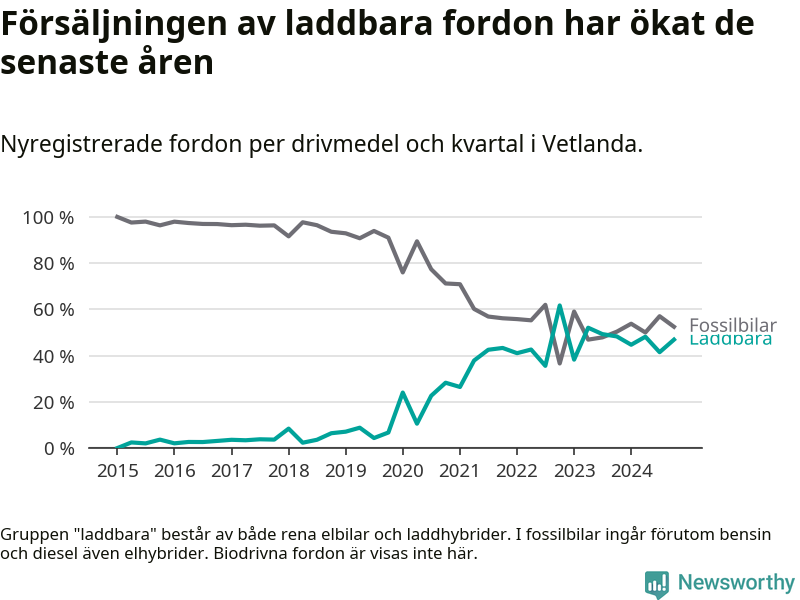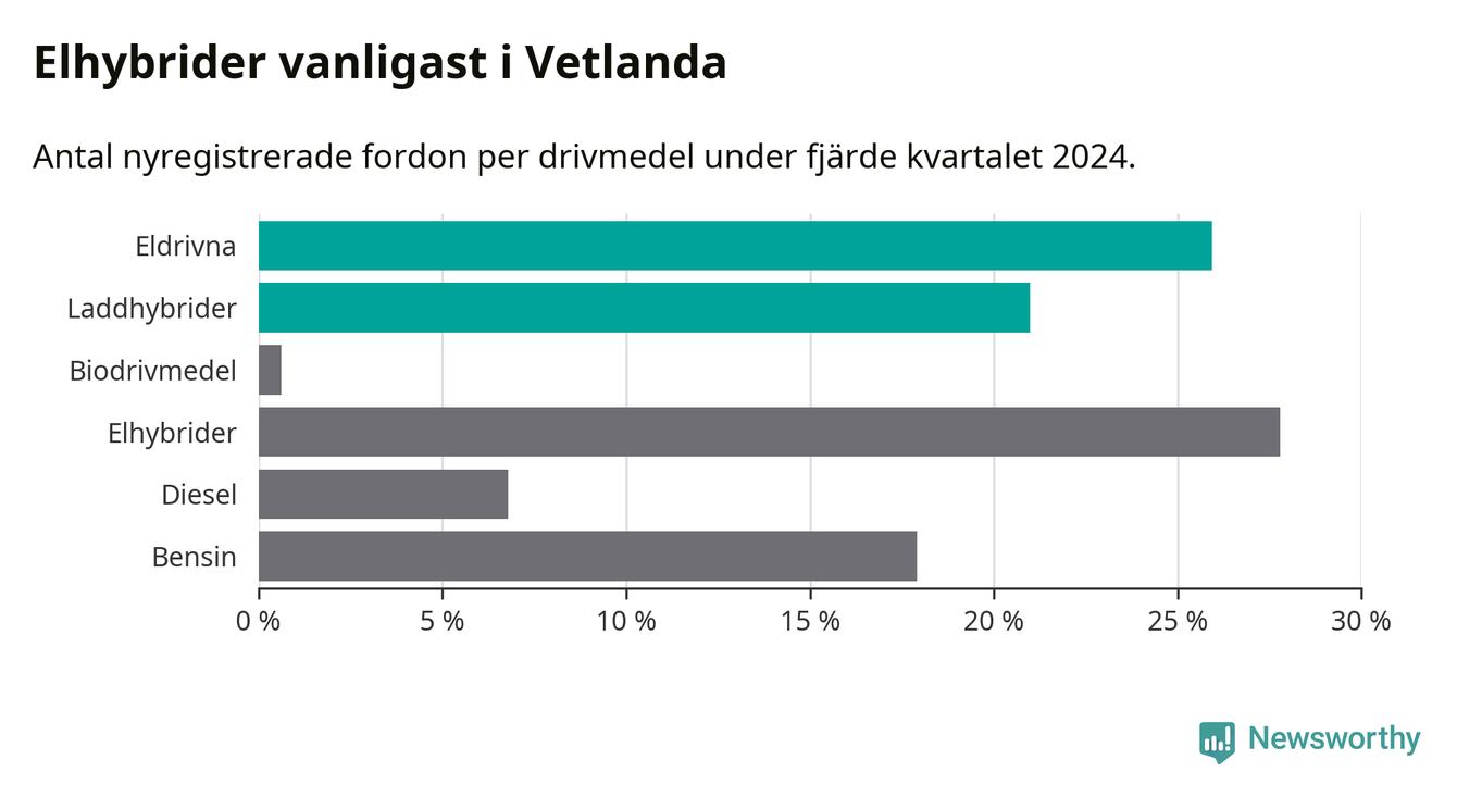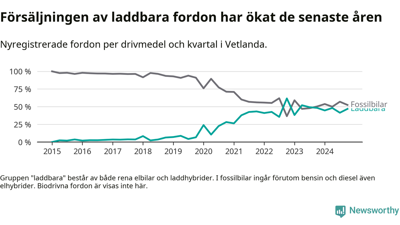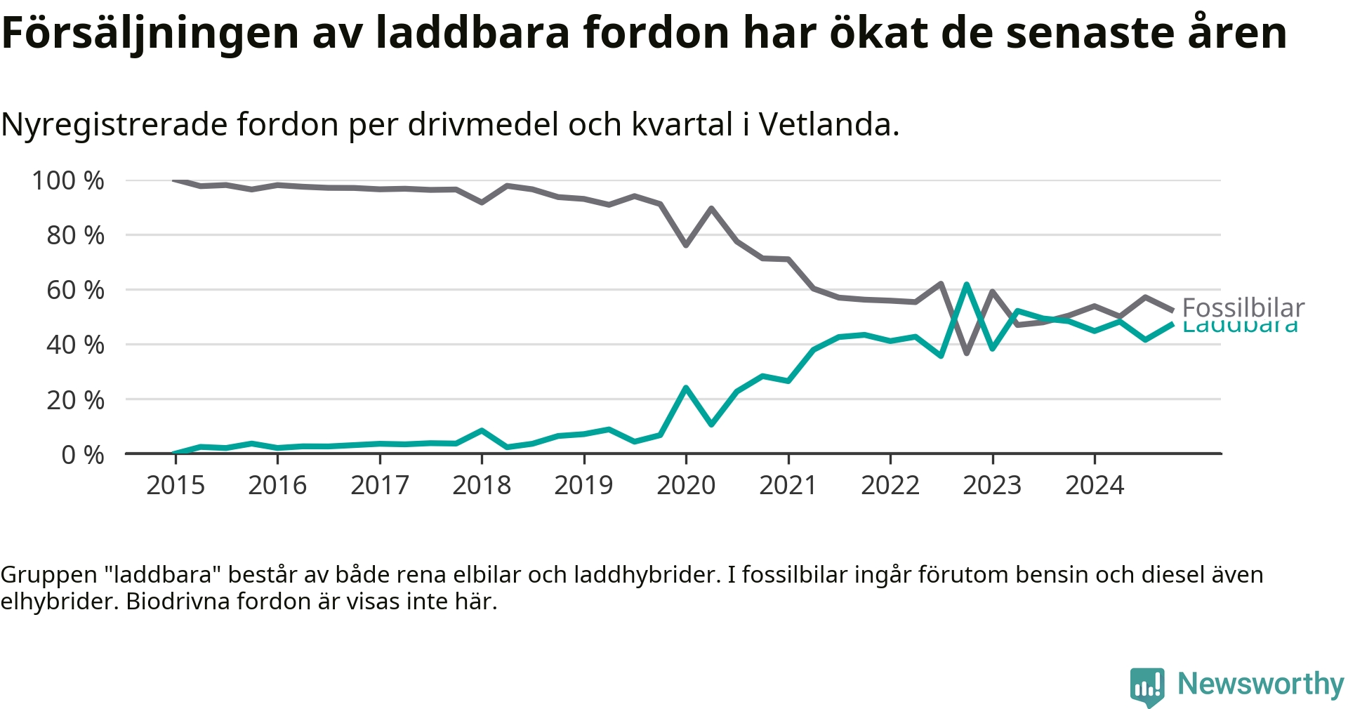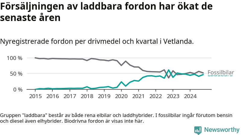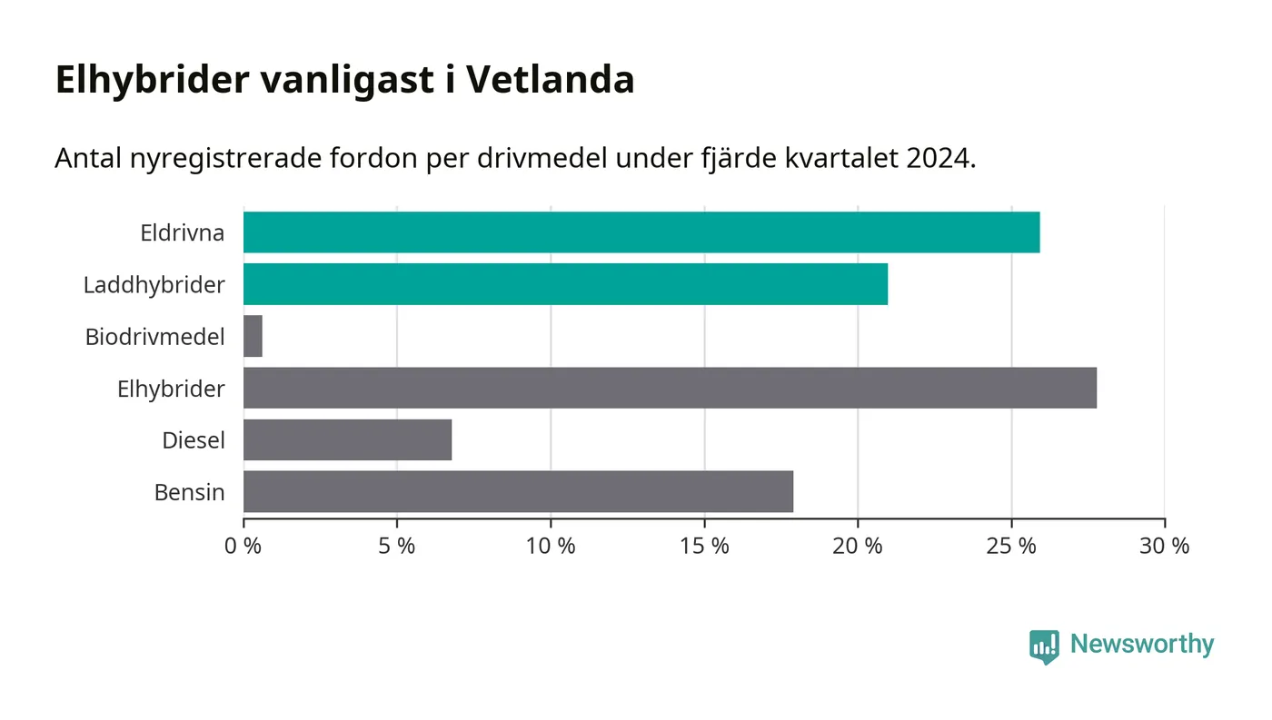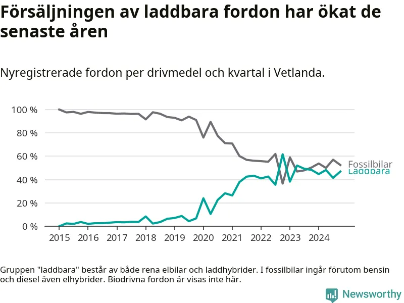 Under fjärde kvartalet 2024 var 47 procent av alla nyregistrerade personbilar i Vetlanda laddbara (sammanlagt registrerades 162 nya bilar). Merparten av de laddbara bilarna var rena elbilar (26 procent av alla).