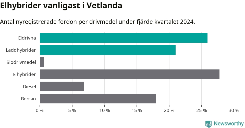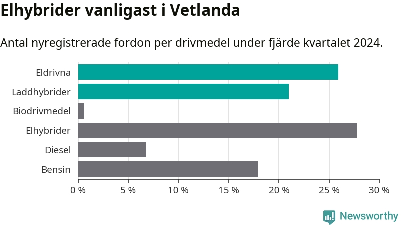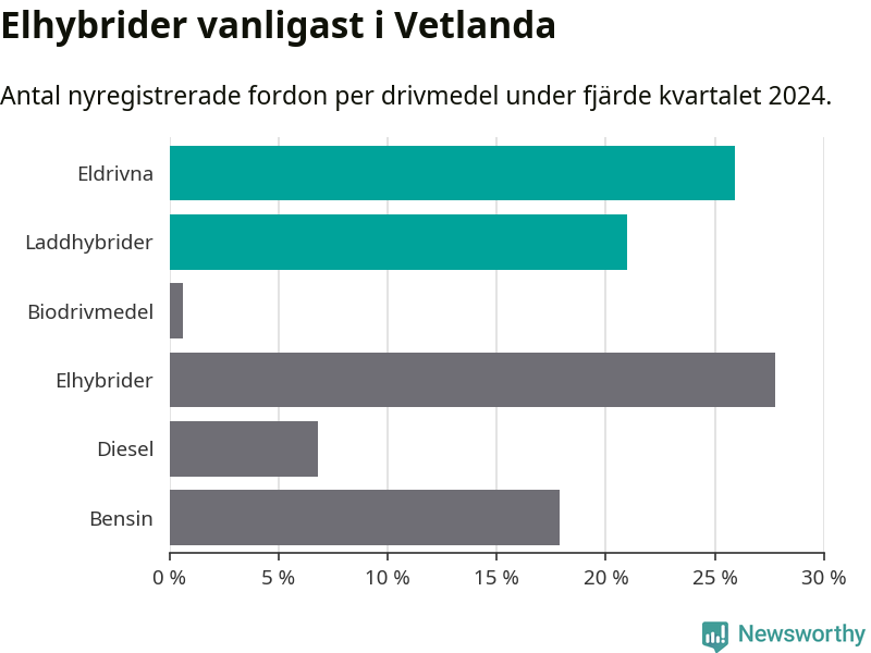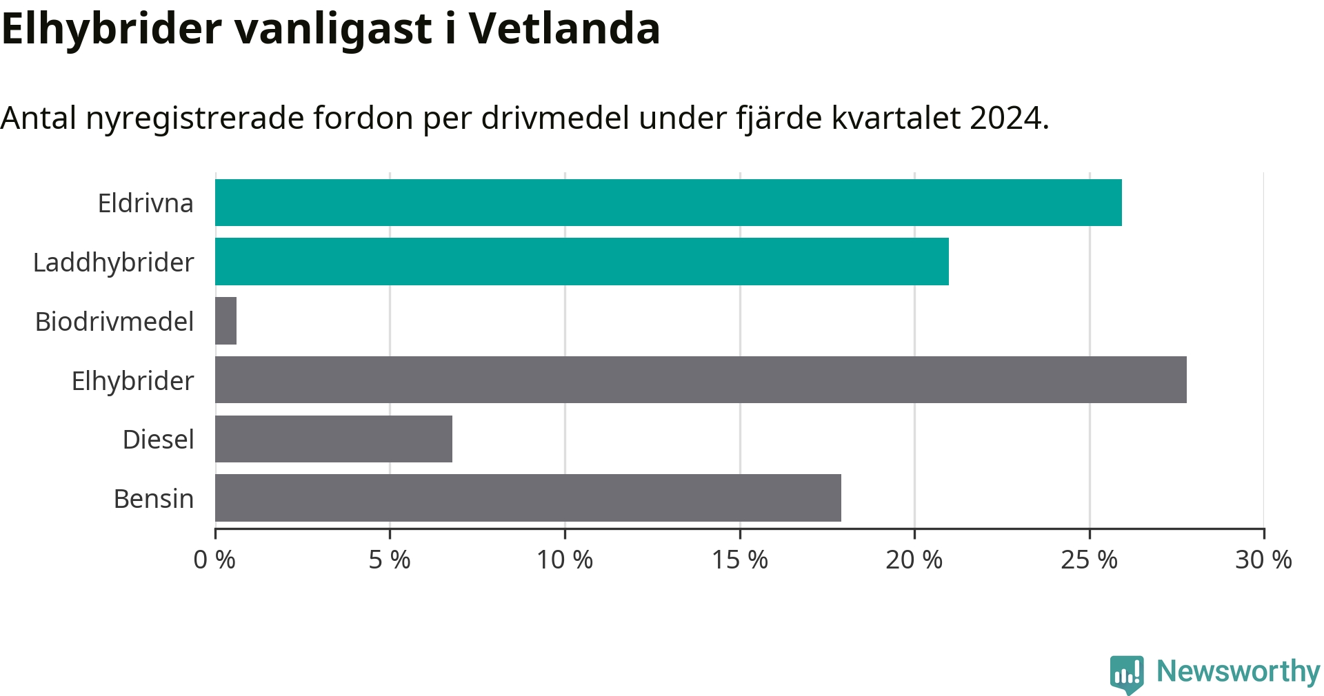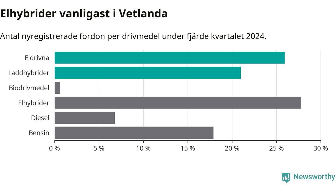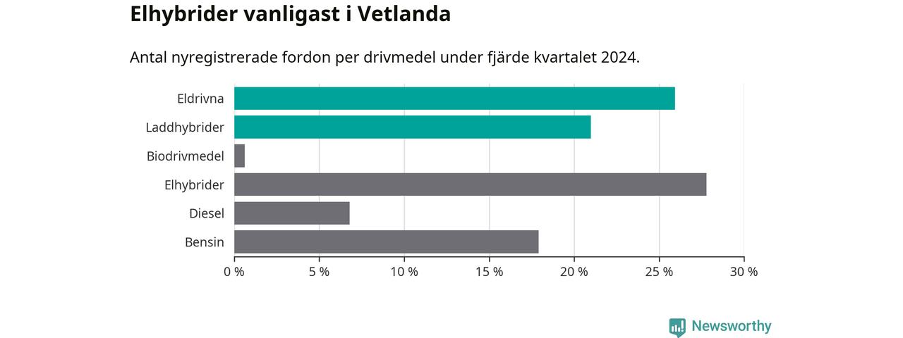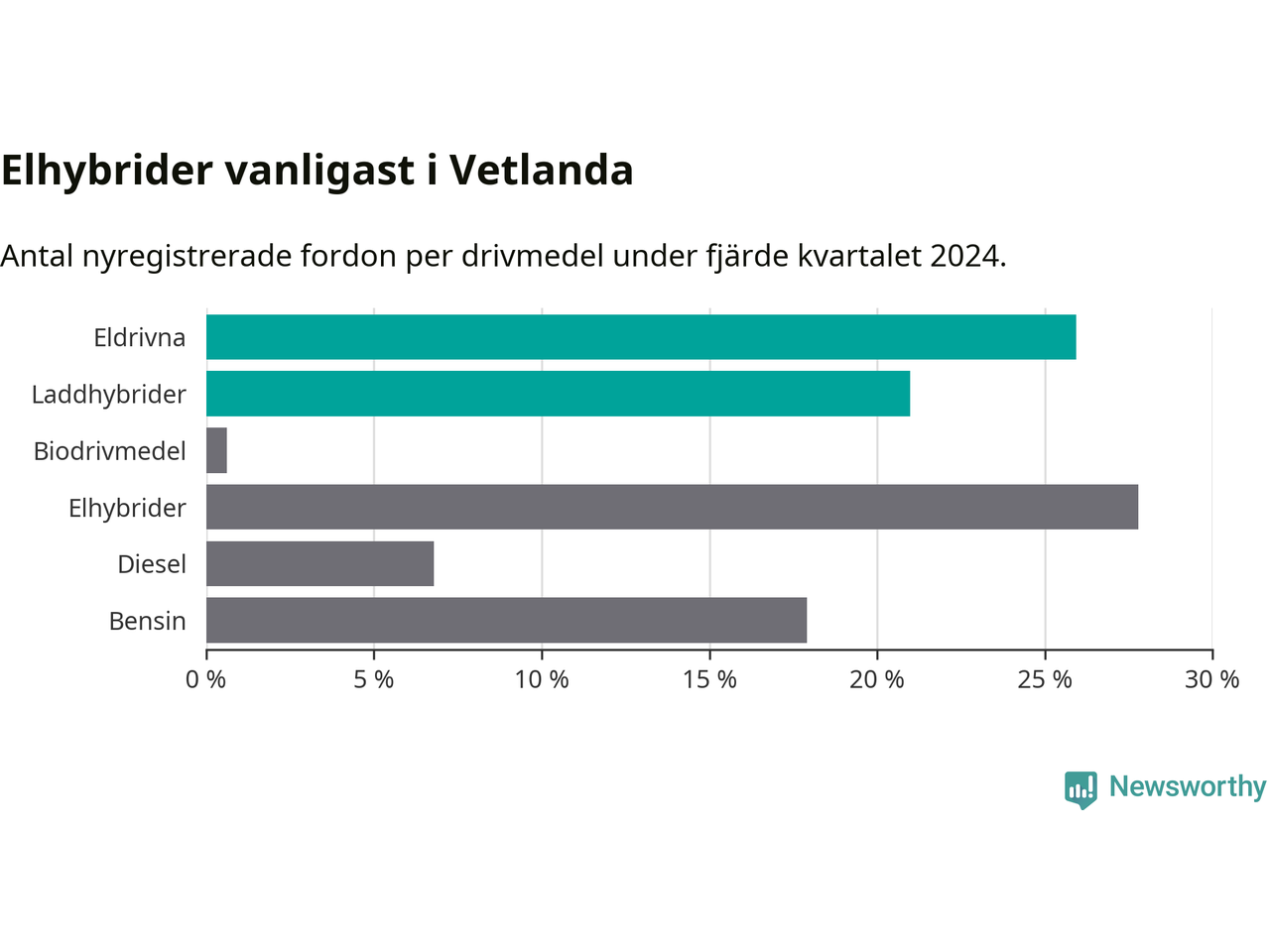 Under fjärde kvartalet 2024 var 47 procent av alla nyregistrerade personbilar i Vetlanda laddbara (sammanlagt registrerades 162 nya bilar). Merparten av de laddbara bilarna var rena elbilar (26 procent av alla).