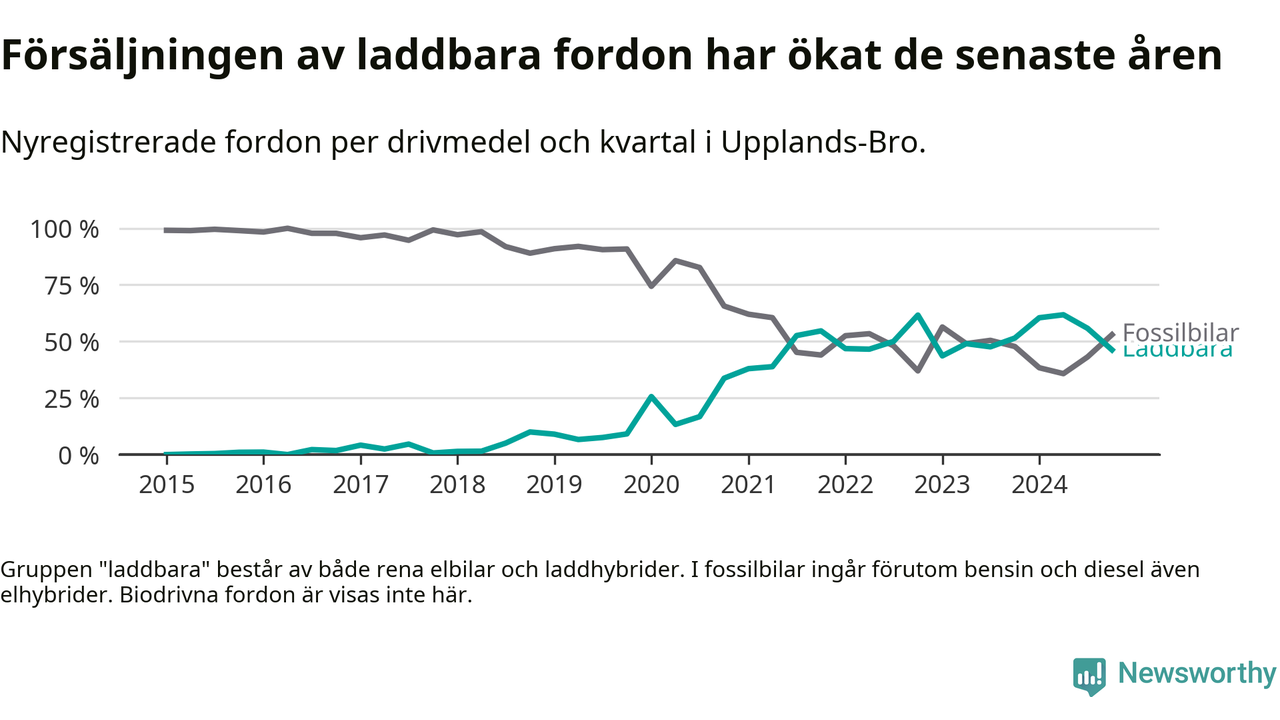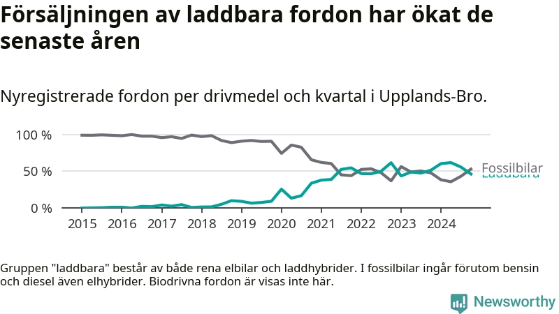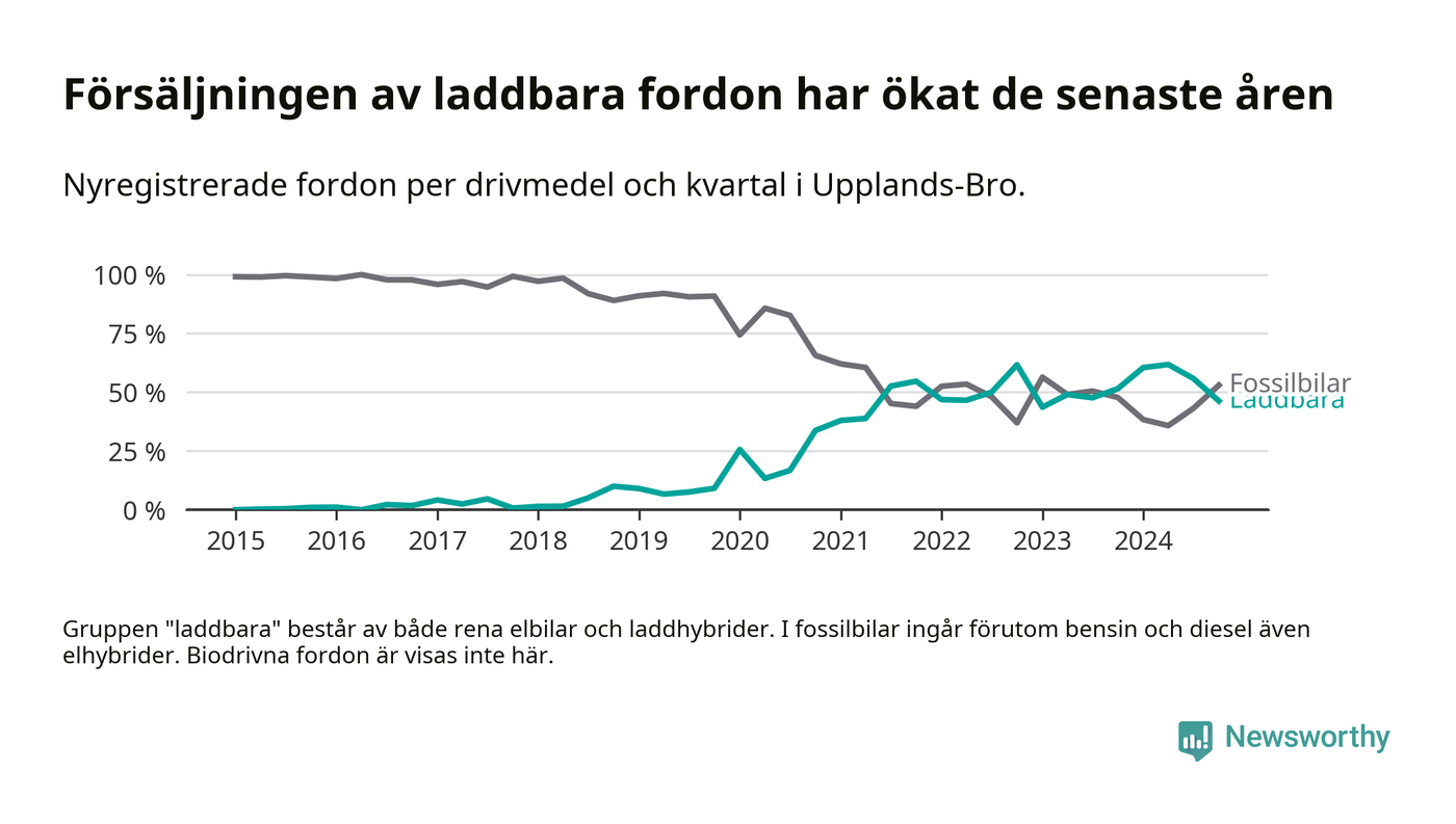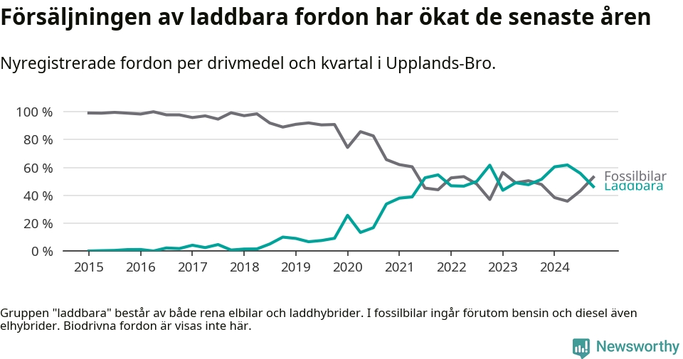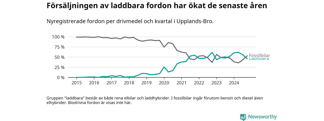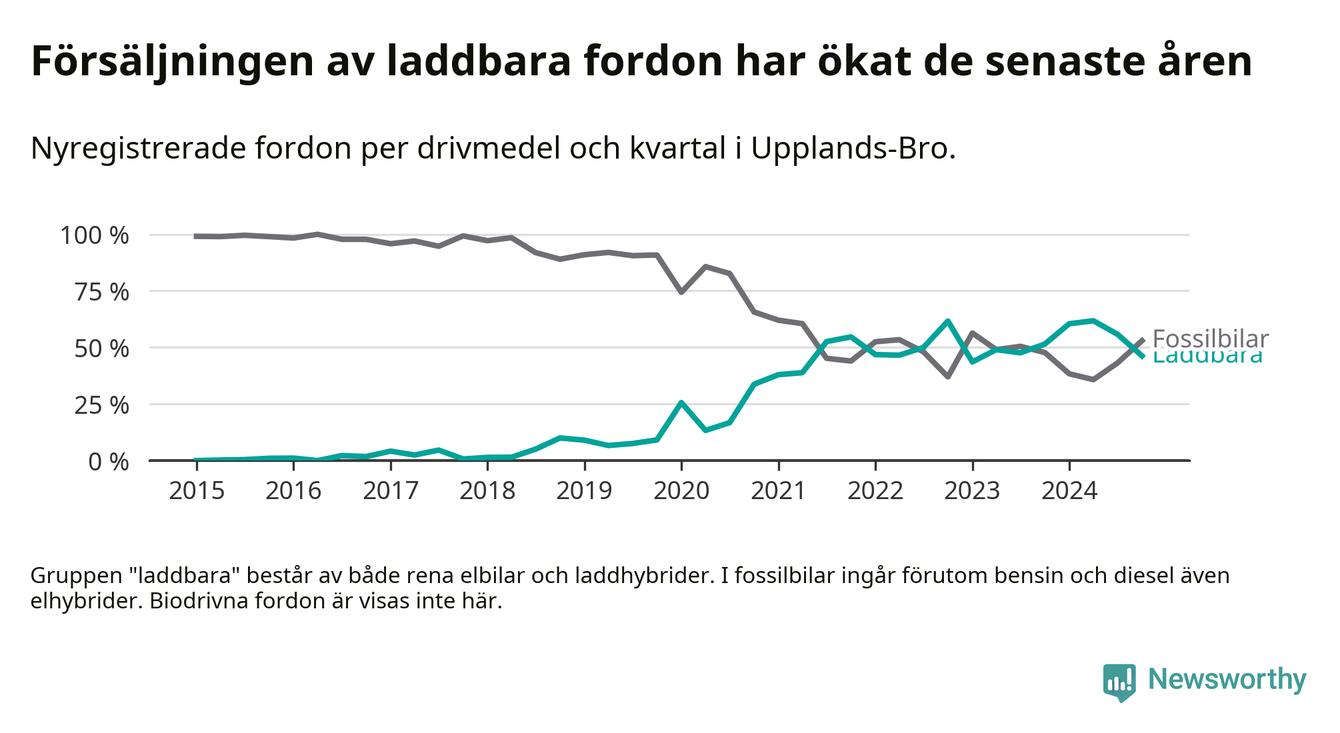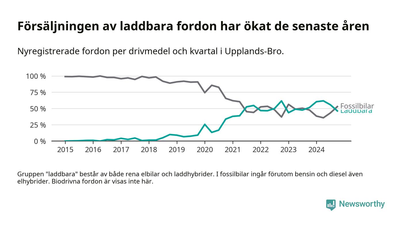 Under fjärde kvartalet 2024 var 46 procent av alla nyregistrerade personbilar i Upplands-Bro laddbara (sammanlagt registrerades 134 nya bilar). Merparten av de laddbara bilarna var rena elbilar (31 procent av alla).