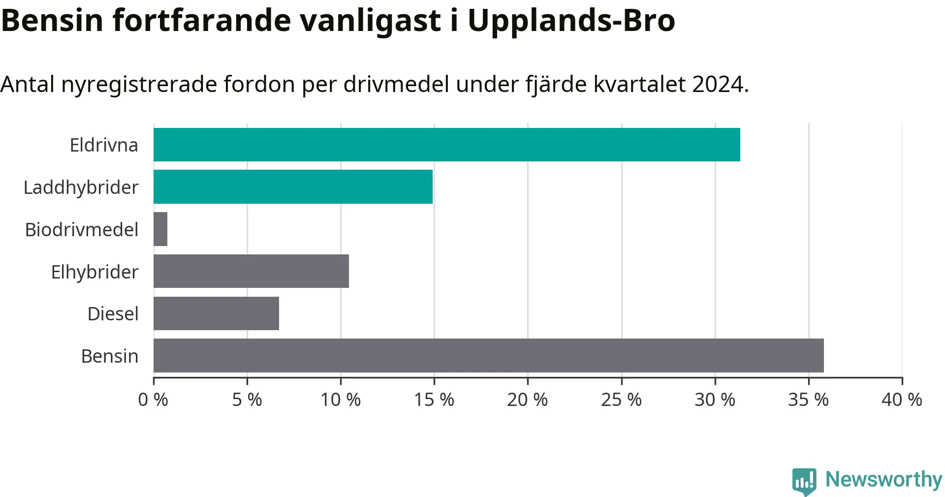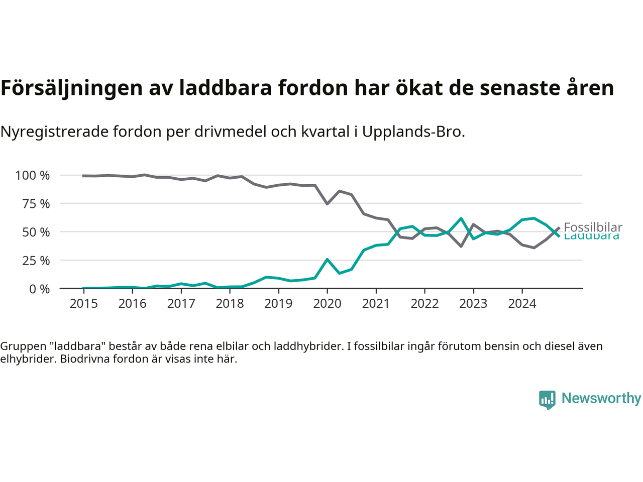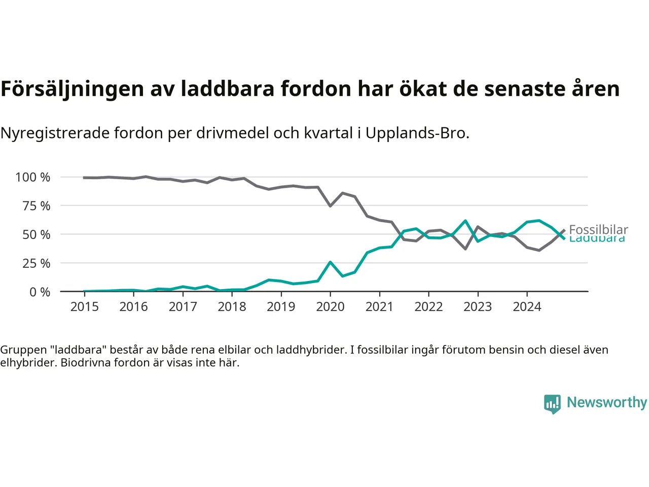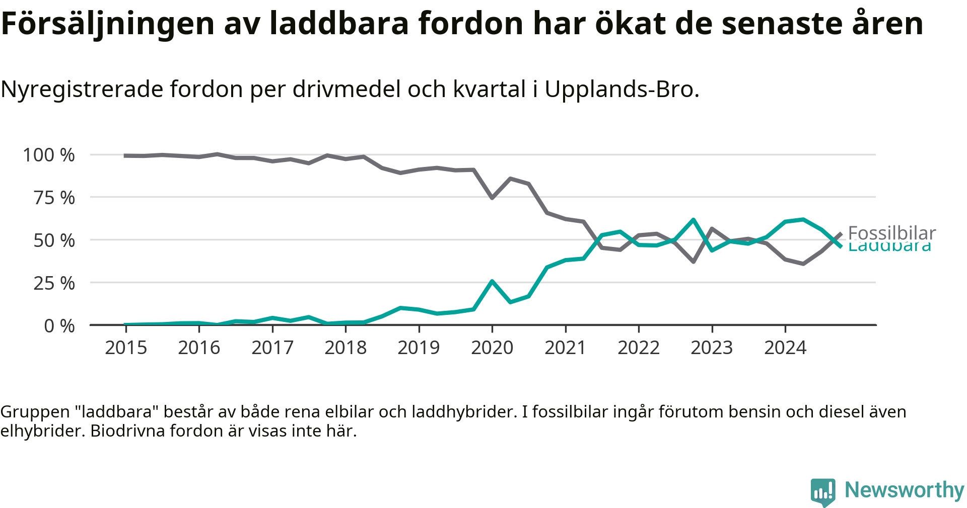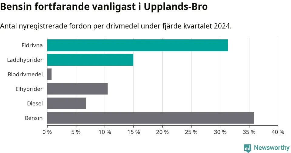 Under fjärde kvartalet 2024 var 46 procent av alla nyregistrerade personbilar i Upplands-Bro laddbara (sammanlagt registrerades 134 nya bilar). Merparten av de laddbara bilarna var rena elbilar (31 procent av alla).