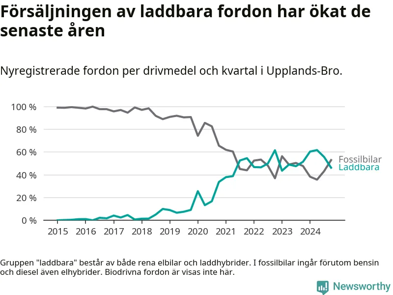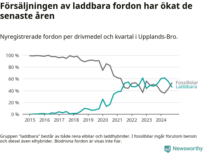 I Upplands-Bro minskade andelen laddbara bilar under fjärde kvartalet jämfört med kvartalet innan. Nyregistreringen peakade under andra kvartalet 2024 då 62 procent av de nya bilarna var laddbara.