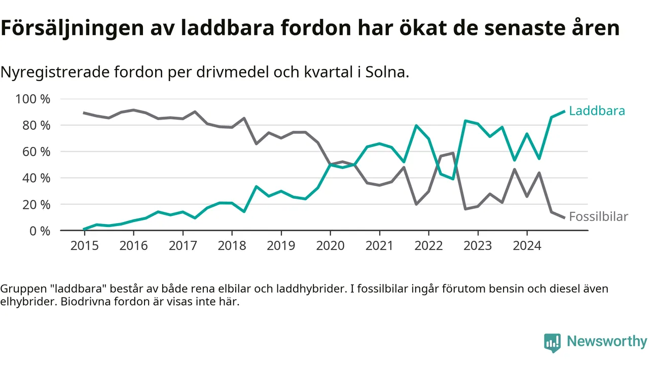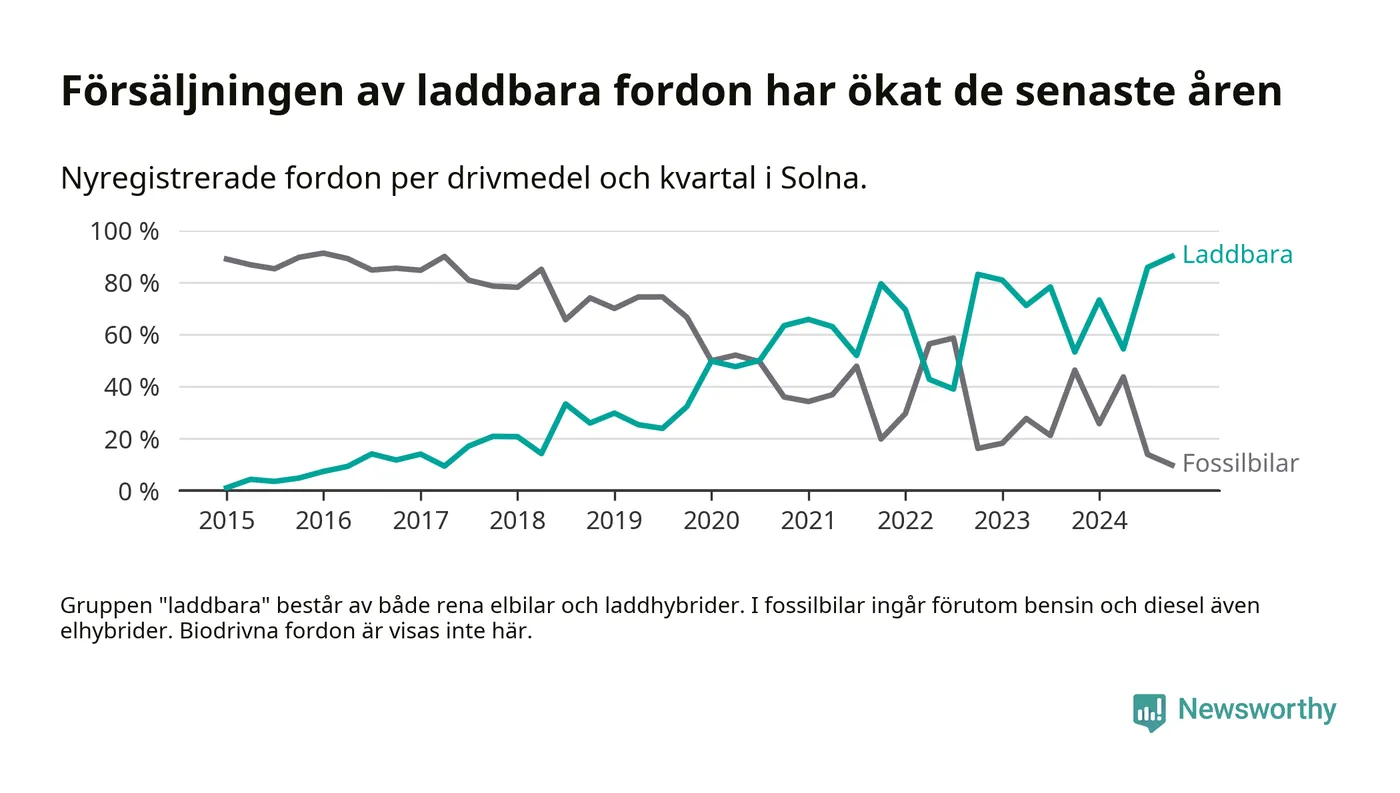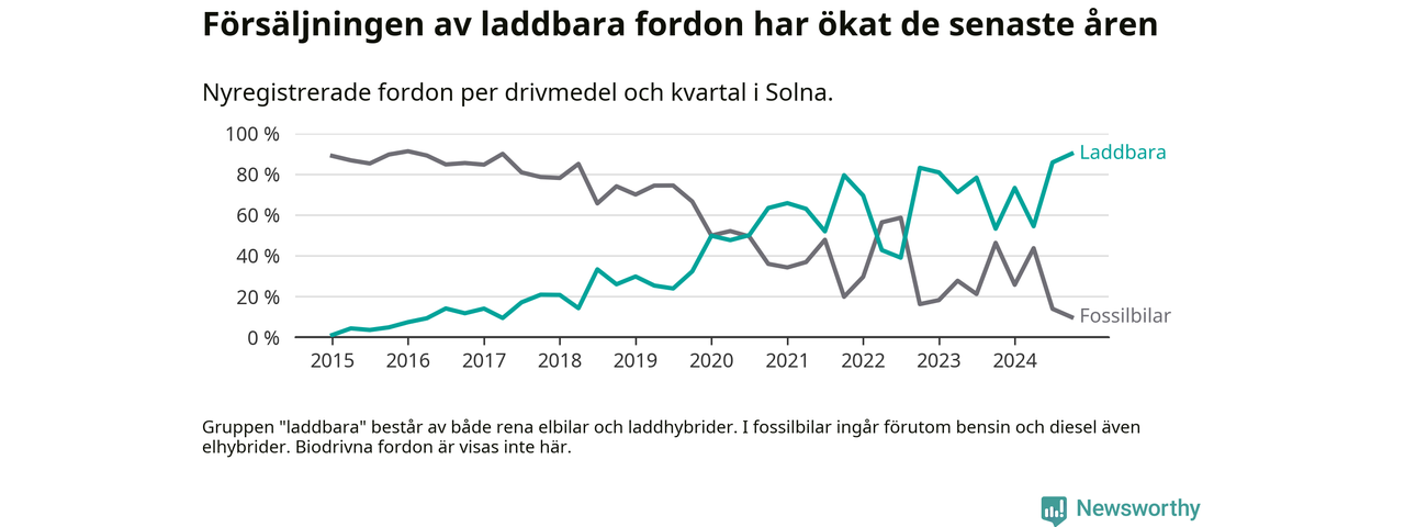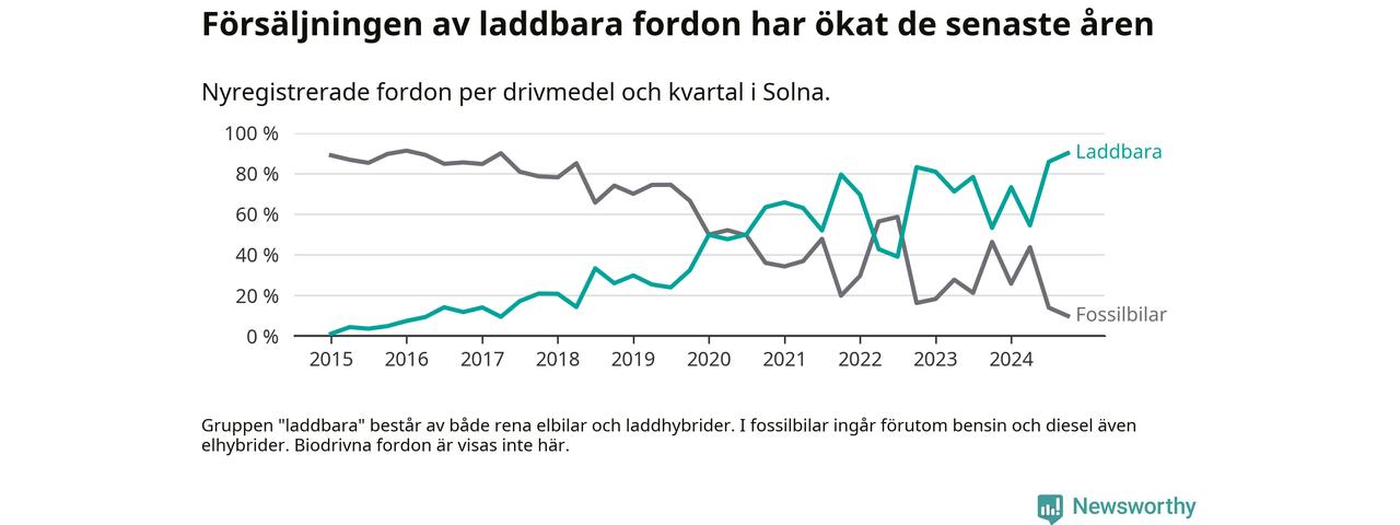 Under fjärde kvartalet 2024 var 90 procent av alla nyregistrerade personbilar i Solna laddbara (sammanlagt registrerades 1 844 nya bilar). Merparten av de laddbara bilarna var rena elbilar (51 procent av alla).