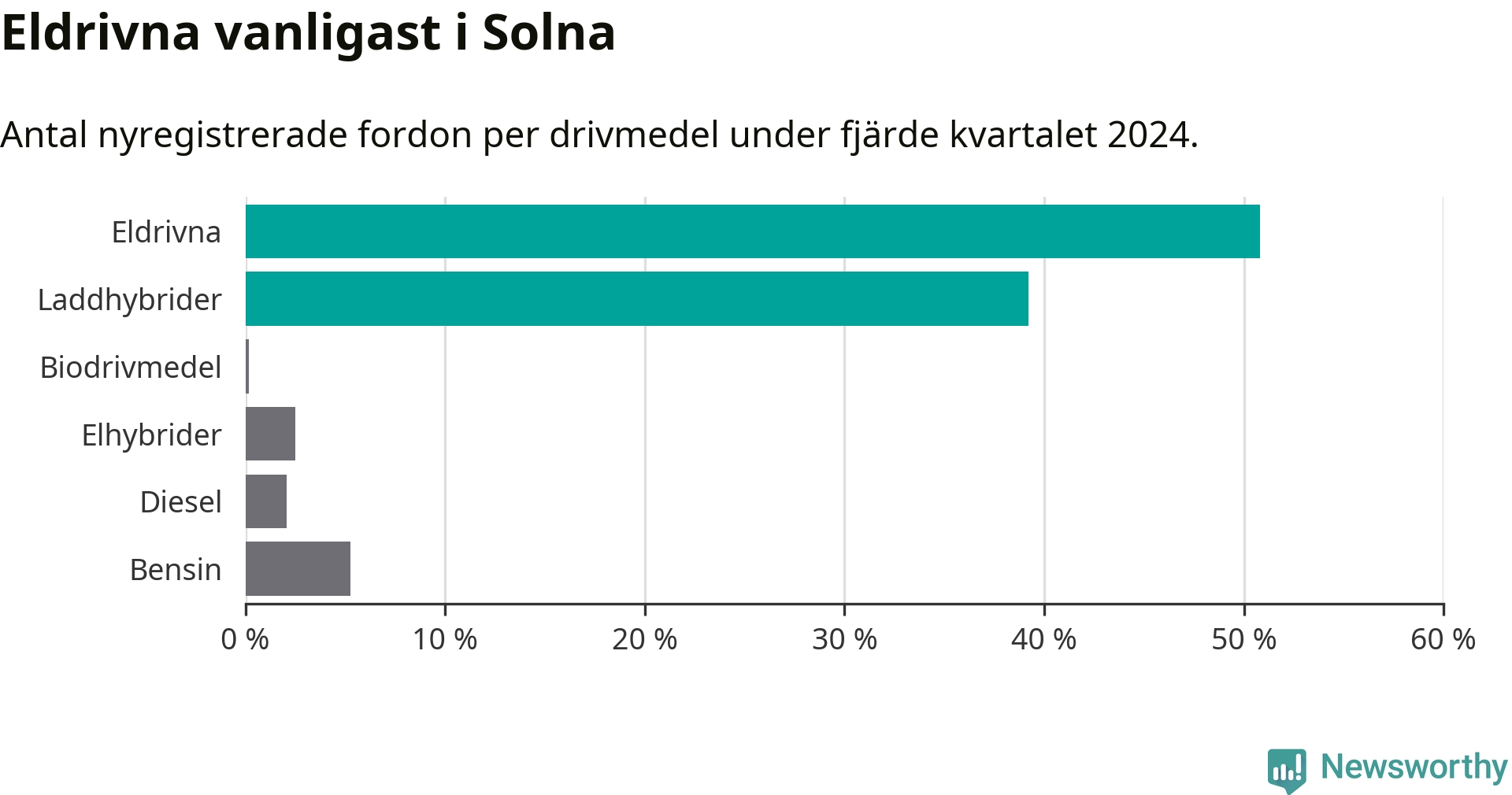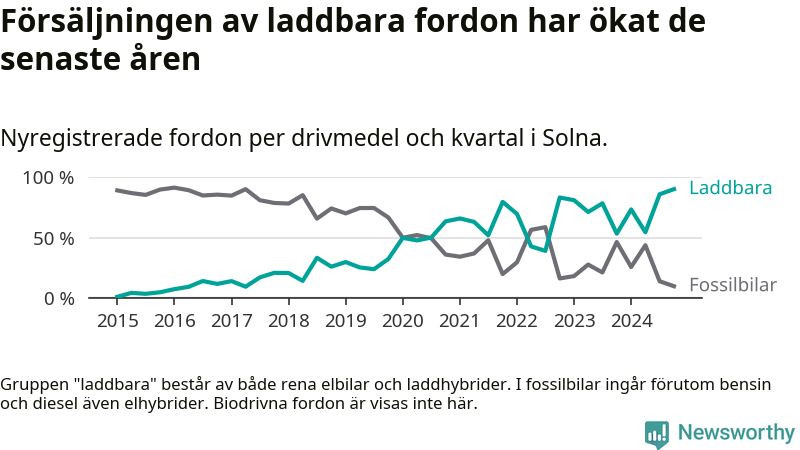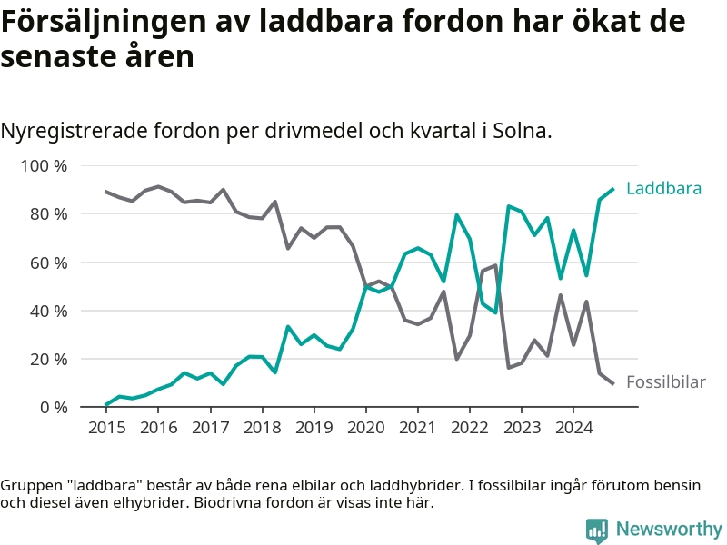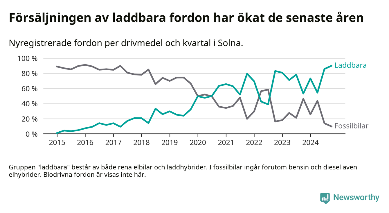 Under fjärde kvartalet 2024 var 90 procent av alla nyregistrerade personbilar i Solna laddbara (sammanlagt registrerades 1 844 nya bilar). Merparten av de laddbara bilarna var rena elbilar (51 procent av alla).