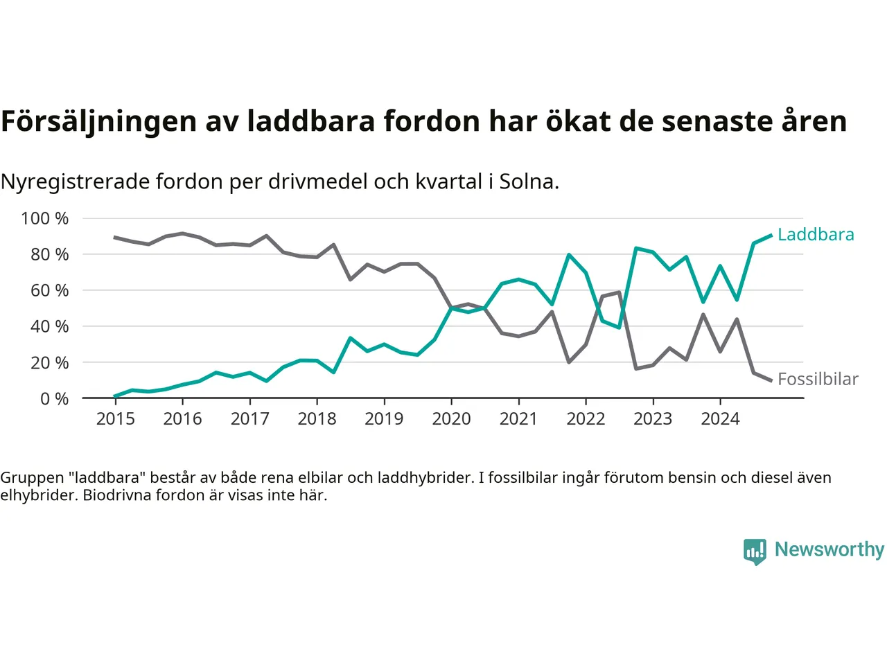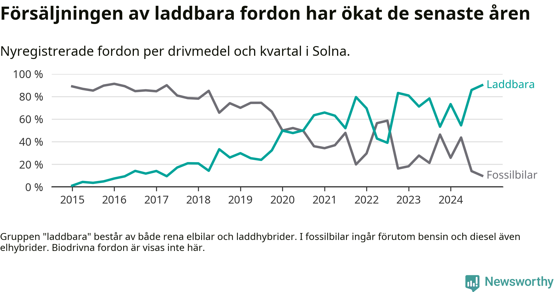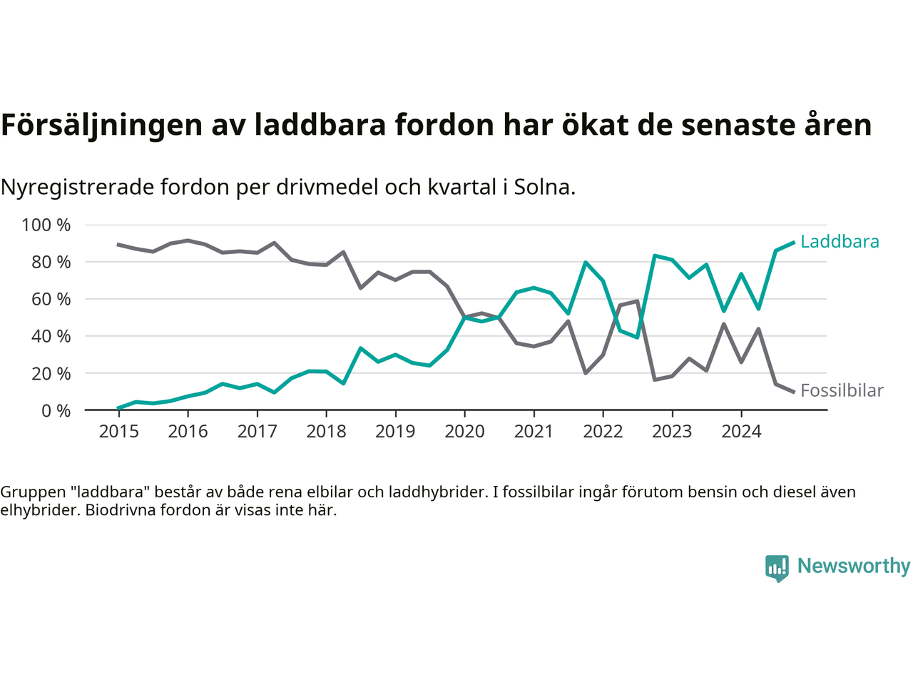 I Solna noterades ett nytt rekord under fjärde kvartalet. Aldrig tidigare har laddbara bilar utgjort en så stor del av alla nya bilar.