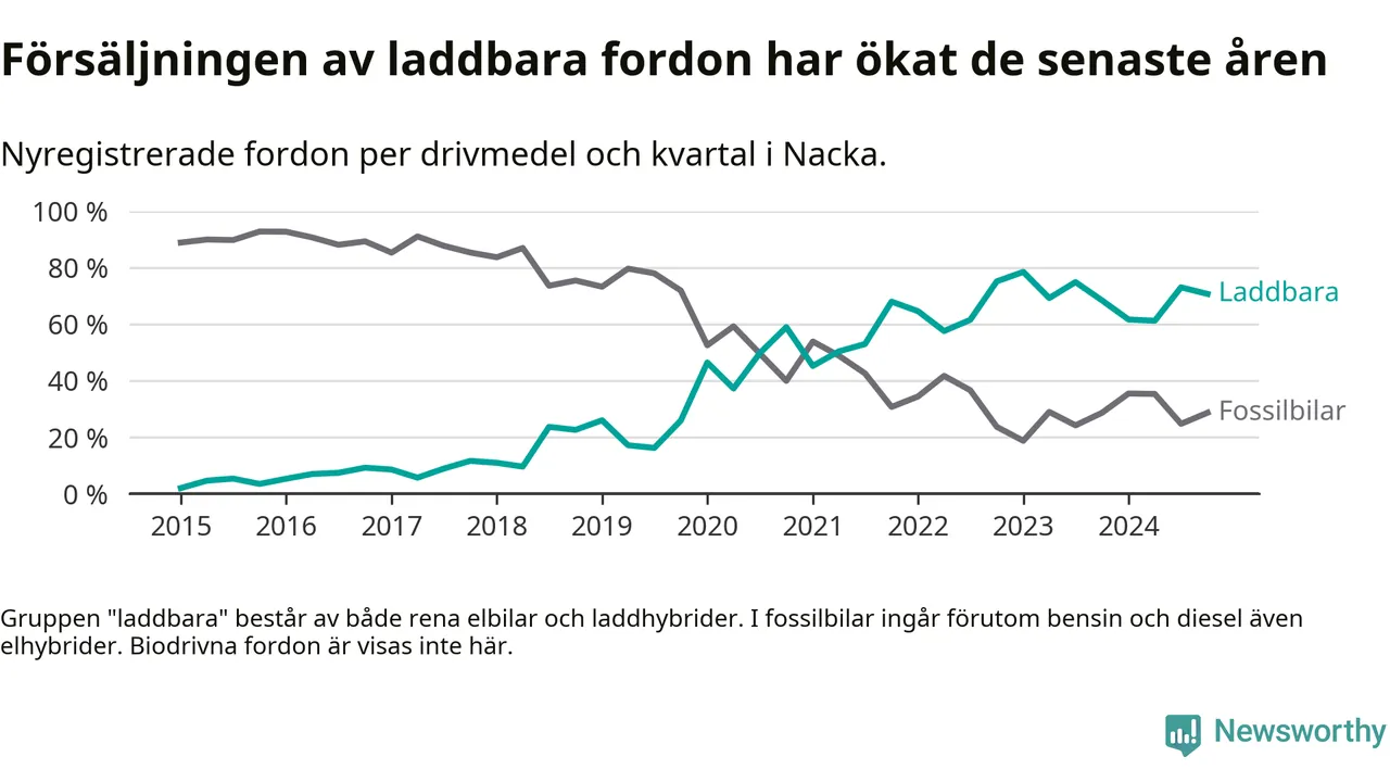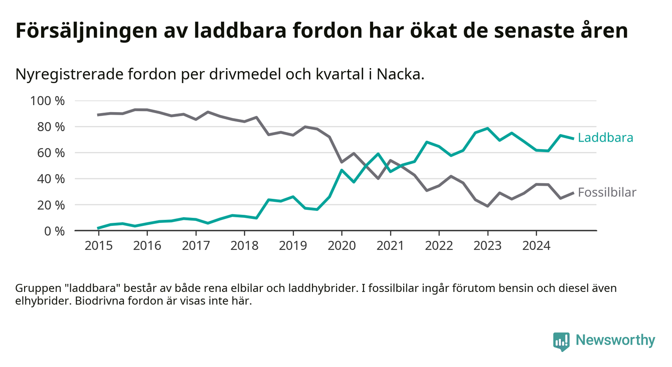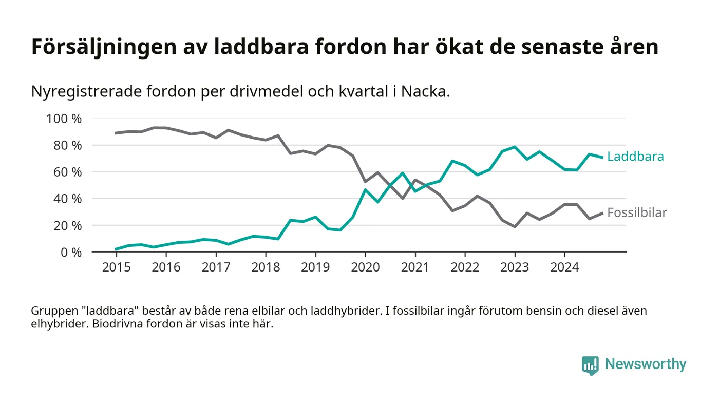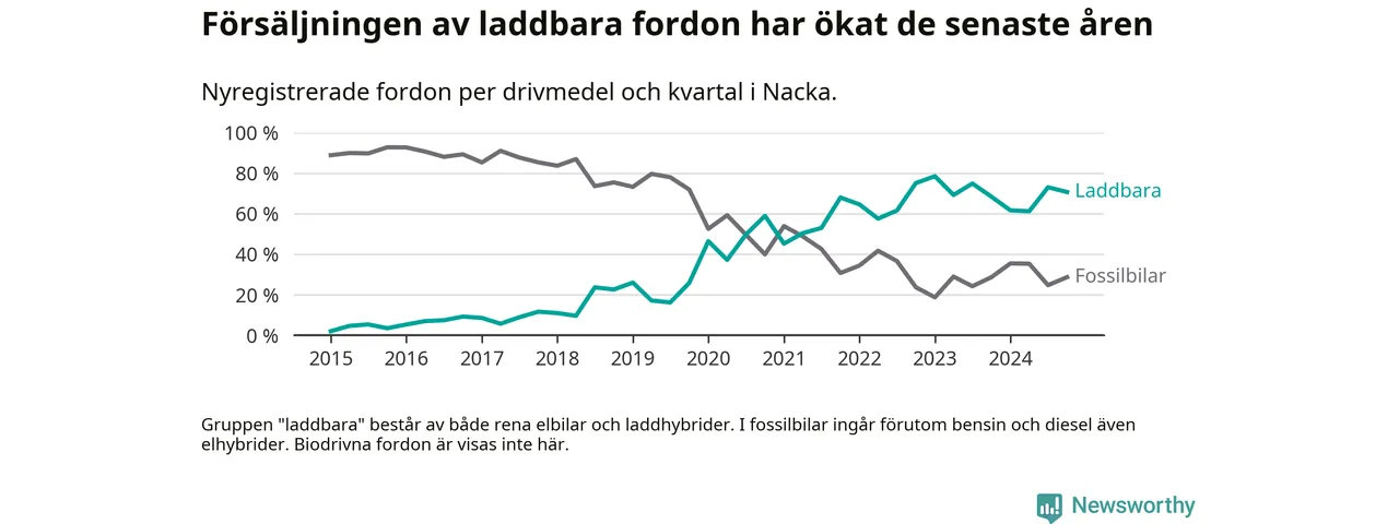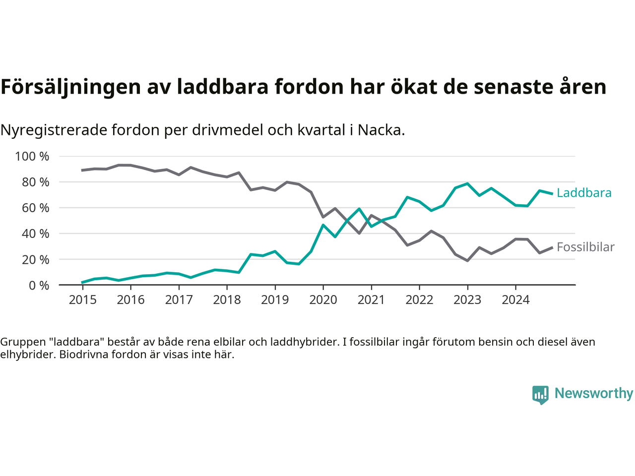 Under fjärde kvartalet 2024 var 71 procent av alla nyregistrerade personbilar i Nacka laddbara (sammanlagt registrerades 1 699 nya bilar). Merparten av de laddbara bilarna var rena elbilar (43 procent av alla).