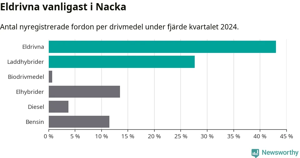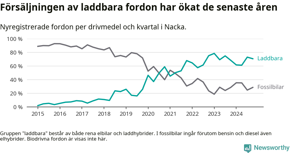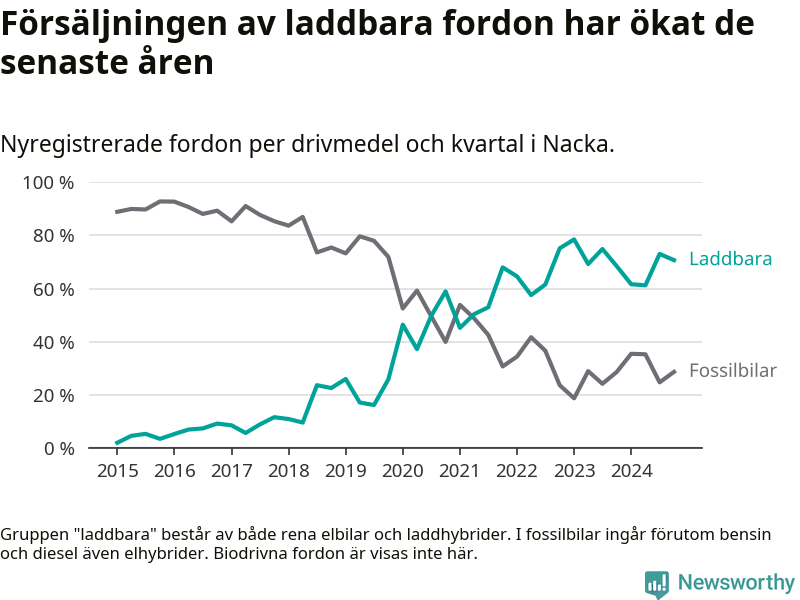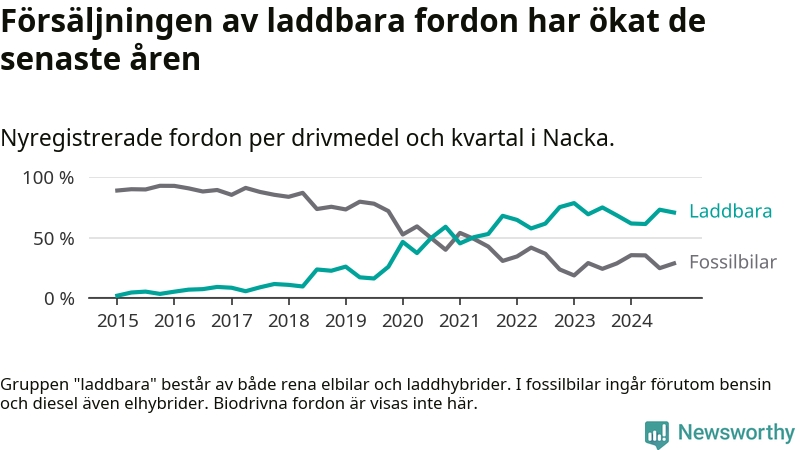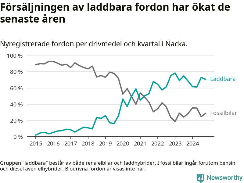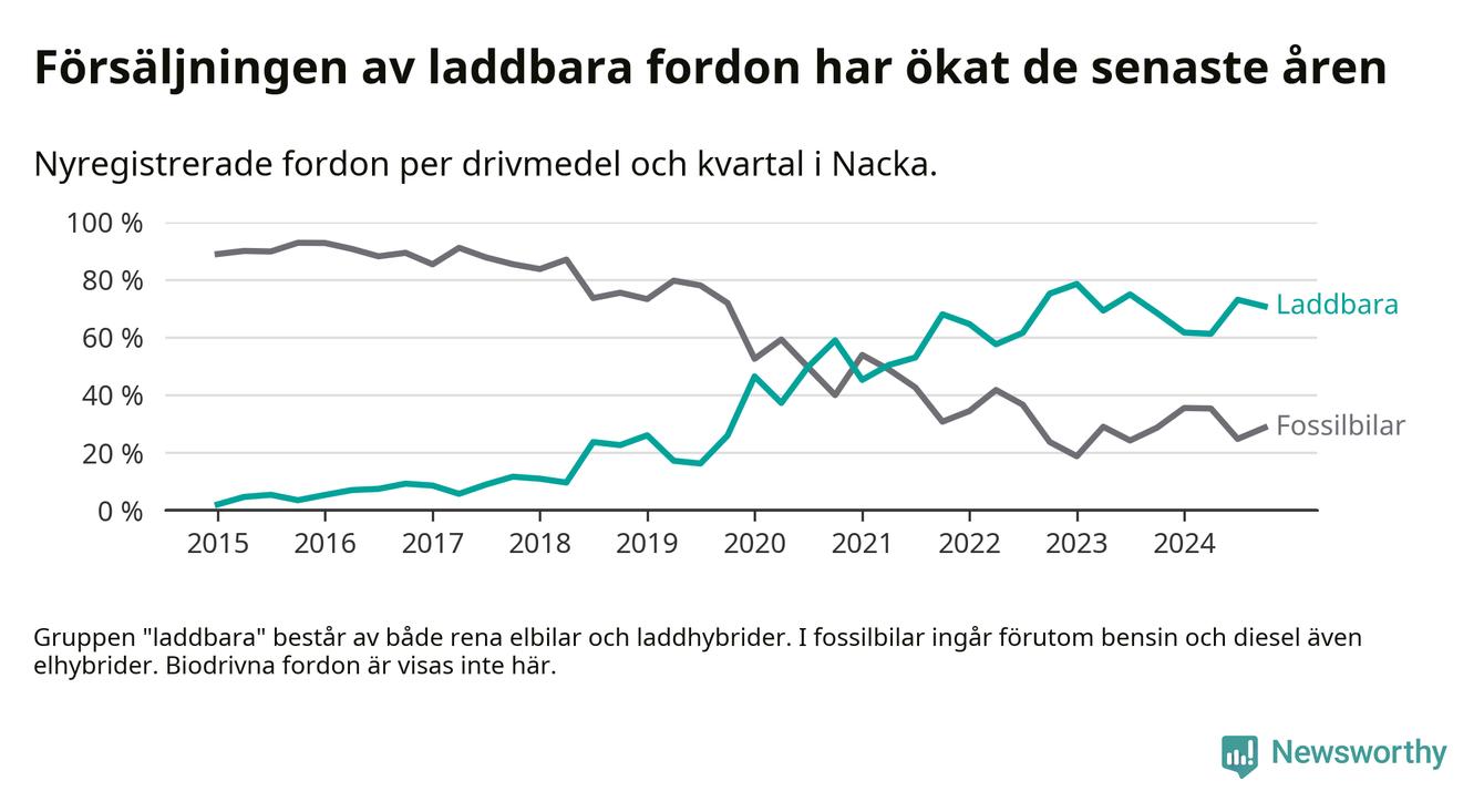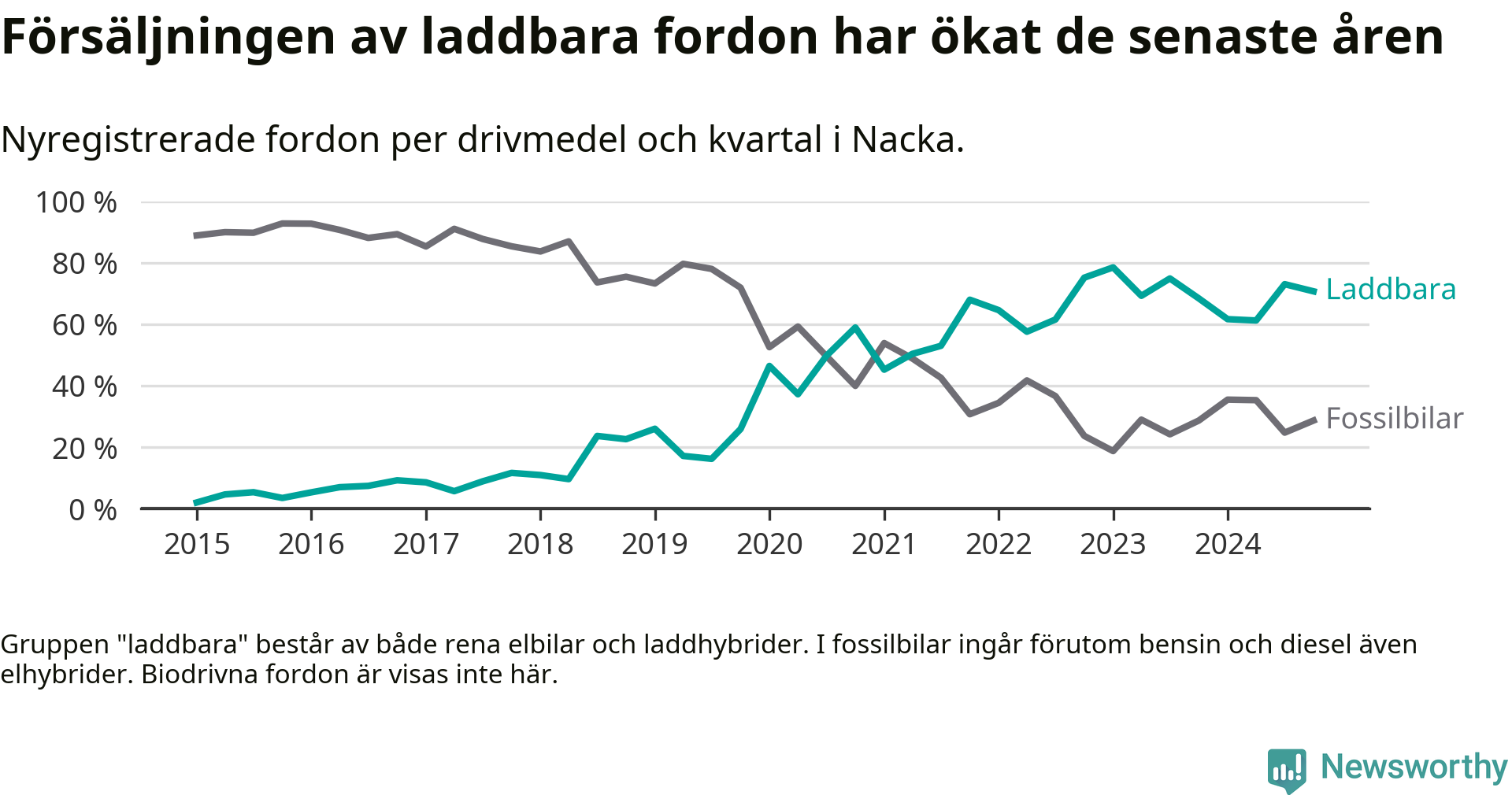 Under fjärde kvartalet 2024 var 71 procent av alla nyregistrerade personbilar i Nacka laddbara (sammanlagt registrerades 1 699 nya bilar). Merparten av de laddbara bilarna var rena elbilar (43 procent av alla).