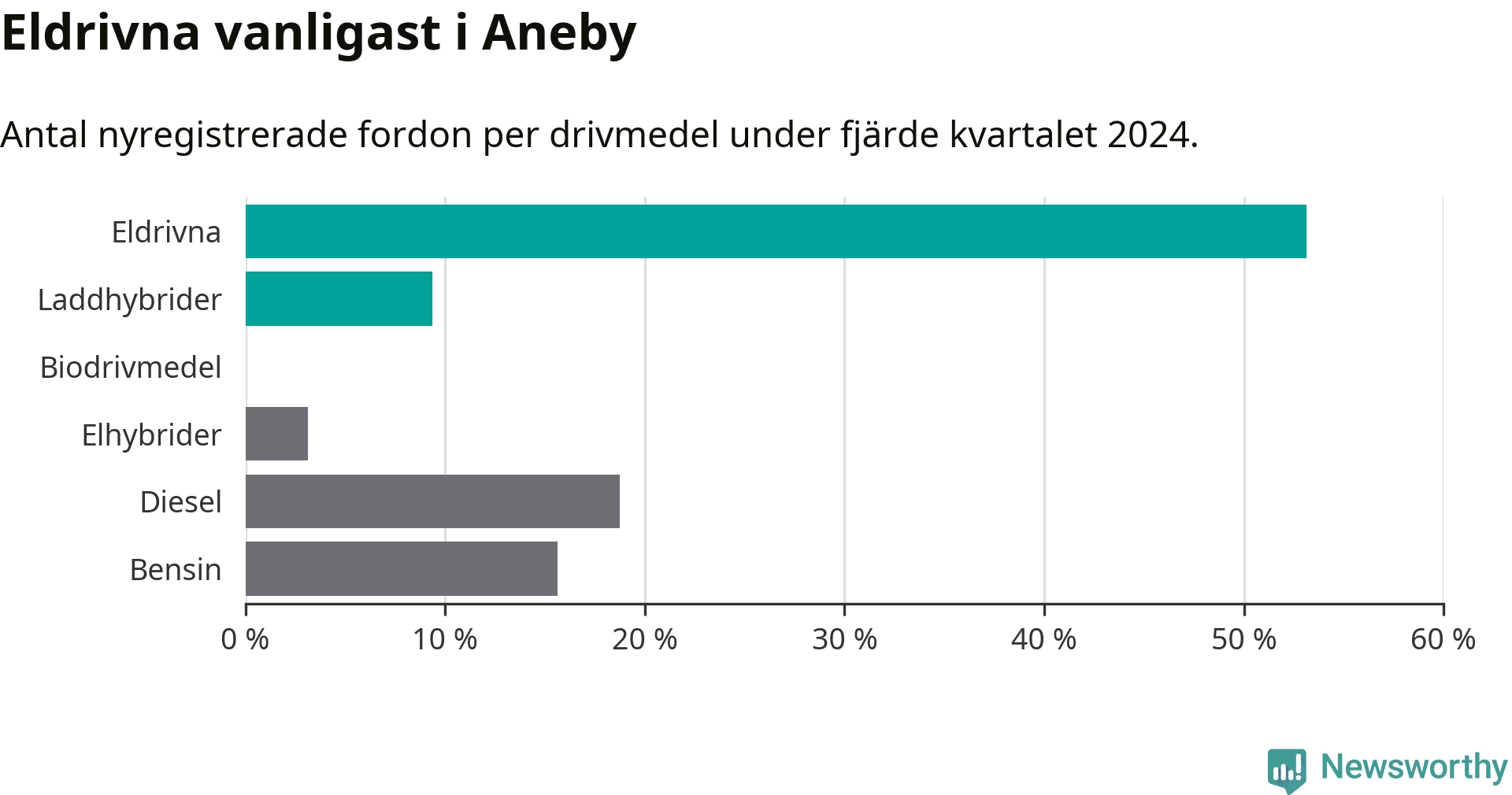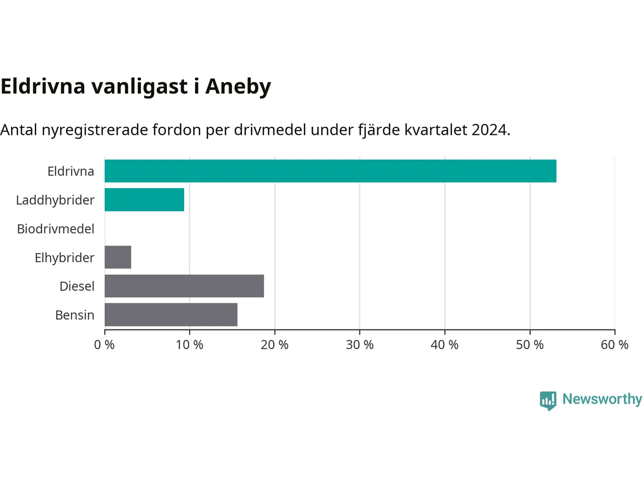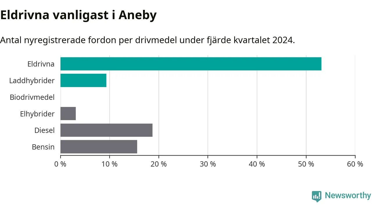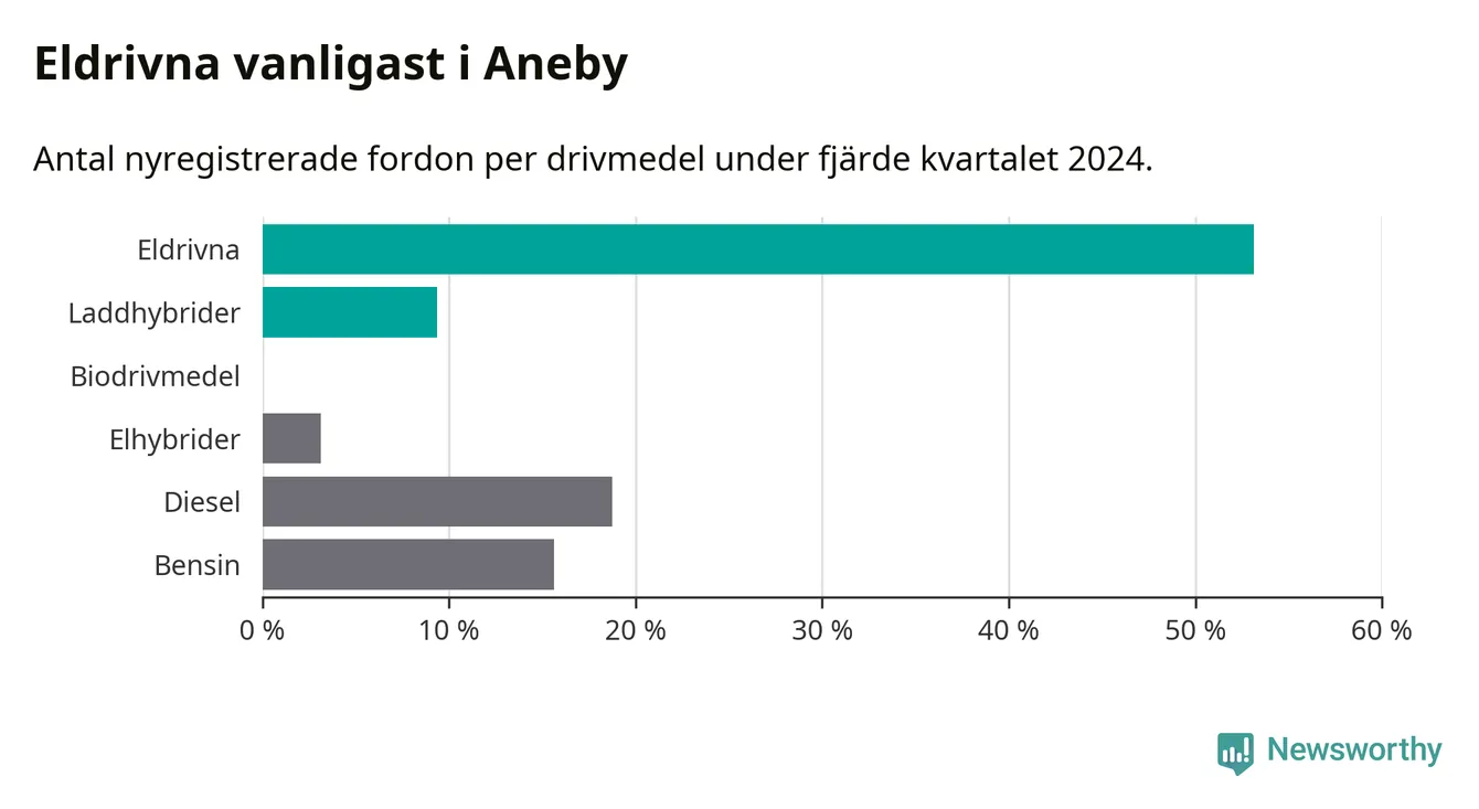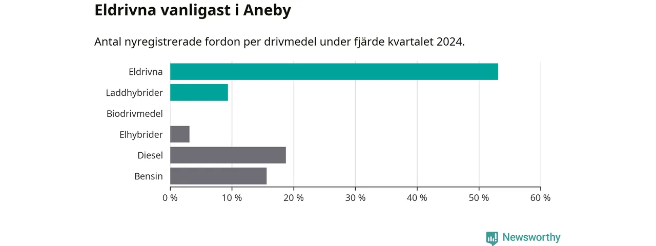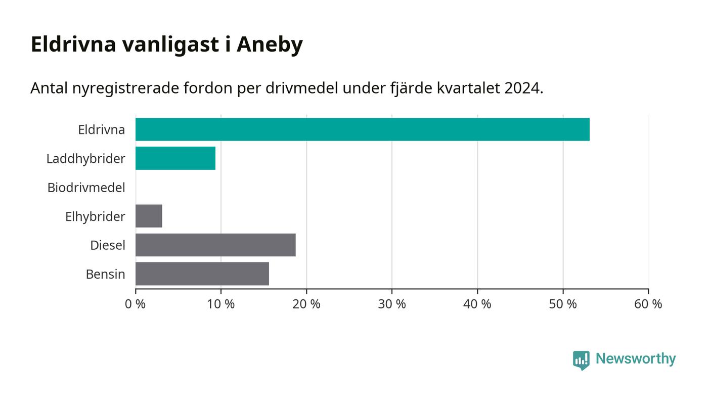 Under fjärde kvartalet 2024 var 63 procent av alla nyregistrerade personbilar i Aneby laddbara (sammanlagt registrerades 32 nya bilar). Merparten av de laddbara bilarna var rena elbilar (53 procent av alla).