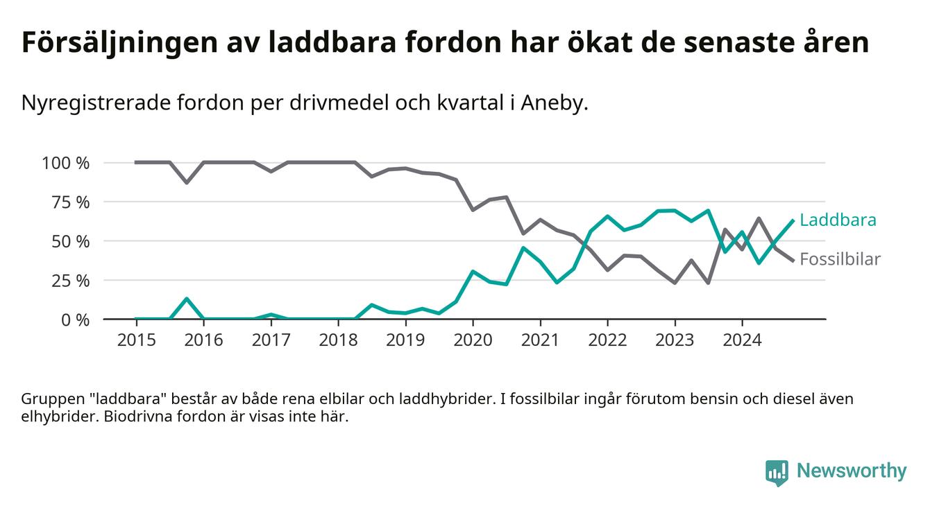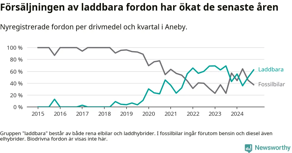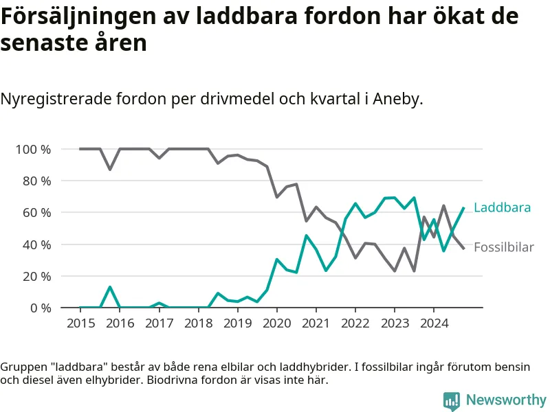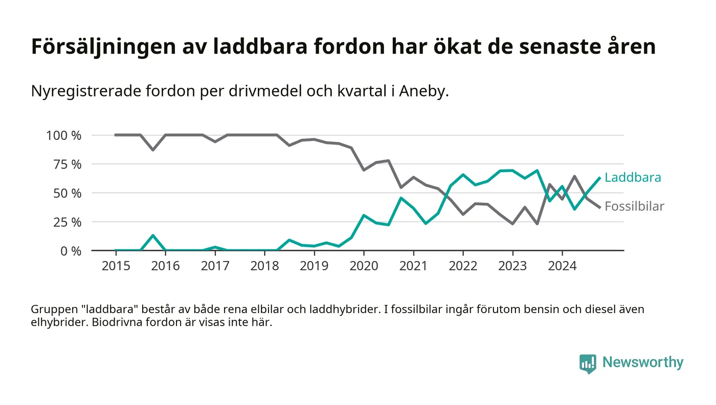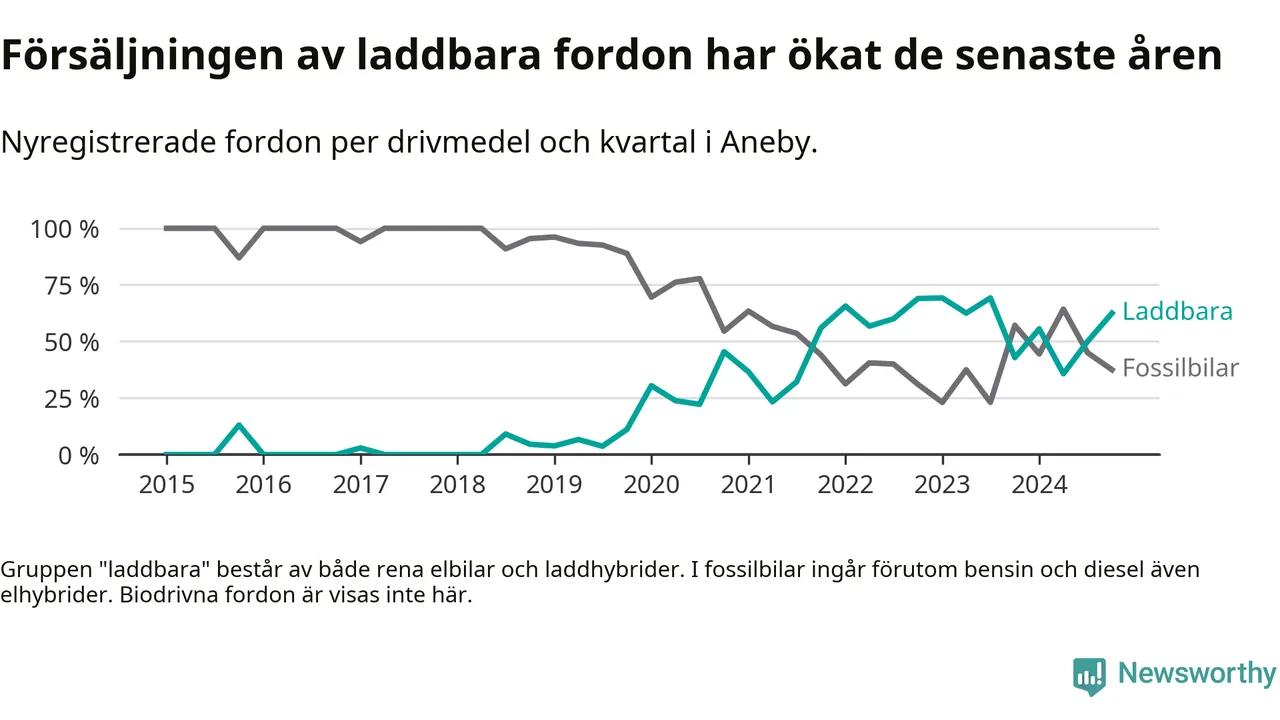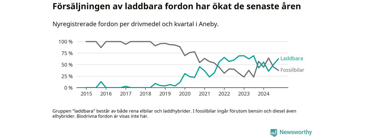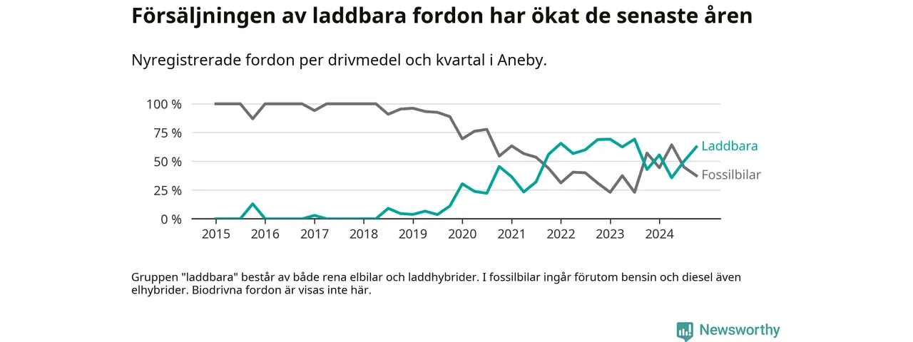 I Aneby ökade andelen laddbara bilar under fjärde kvartalet jämfört med kvartalet innan. Nyregistreringen peakade under första kvartalet 2023 då 69 procent av de nya bilarna var laddbara.